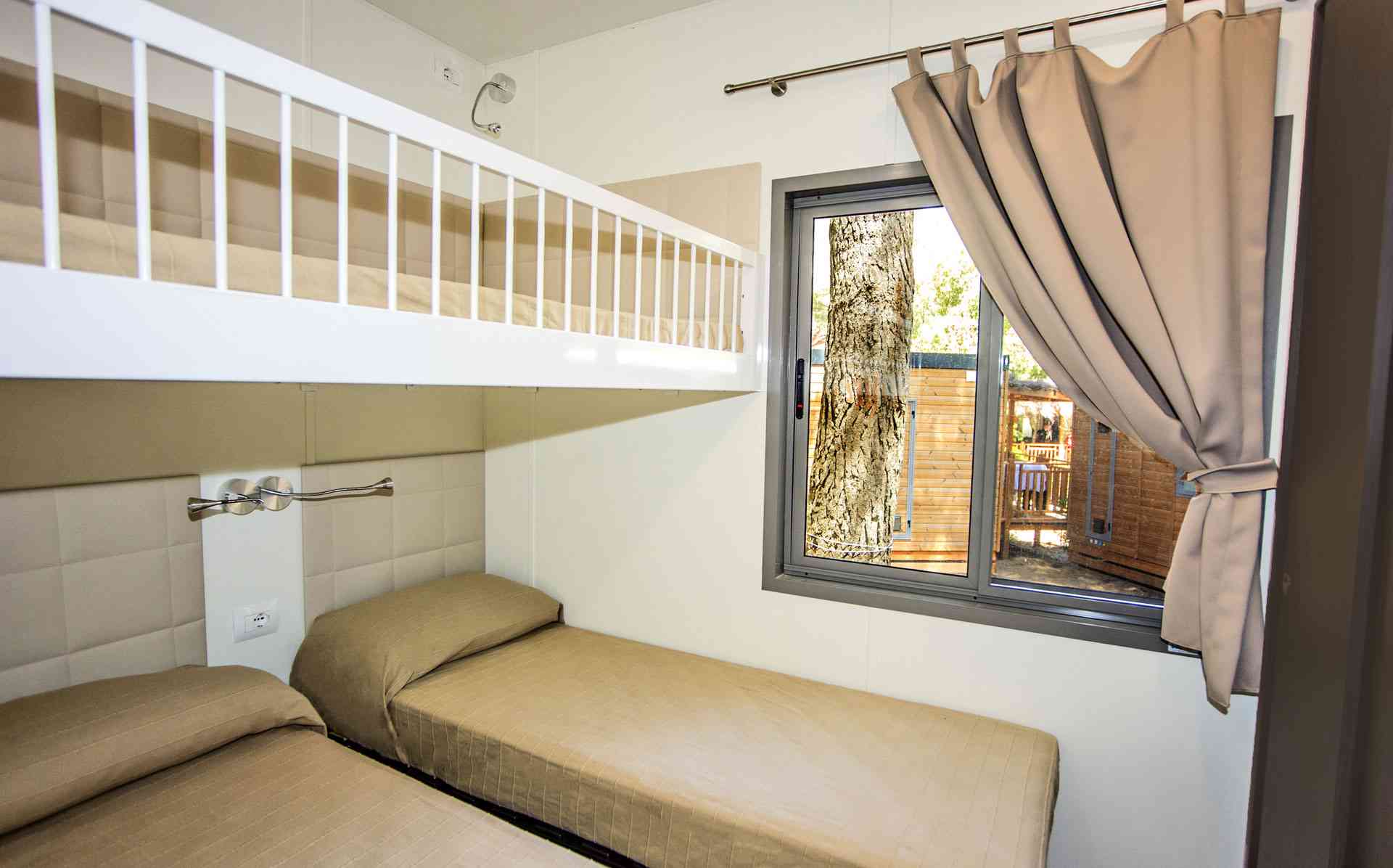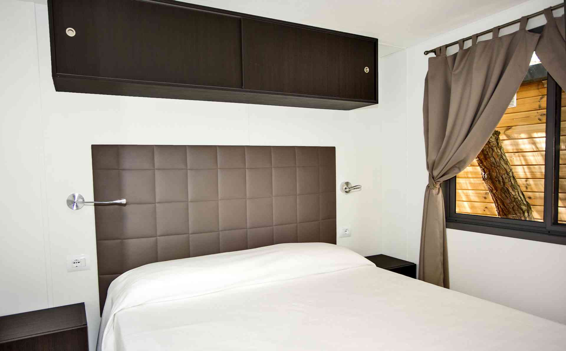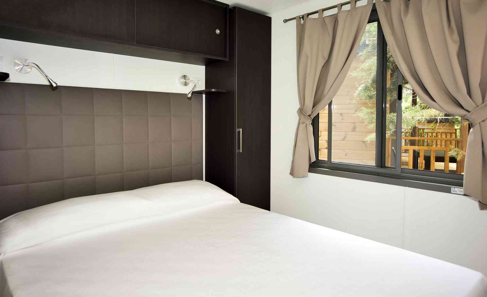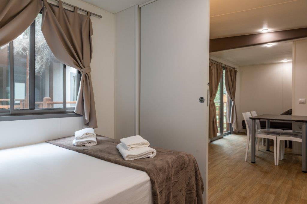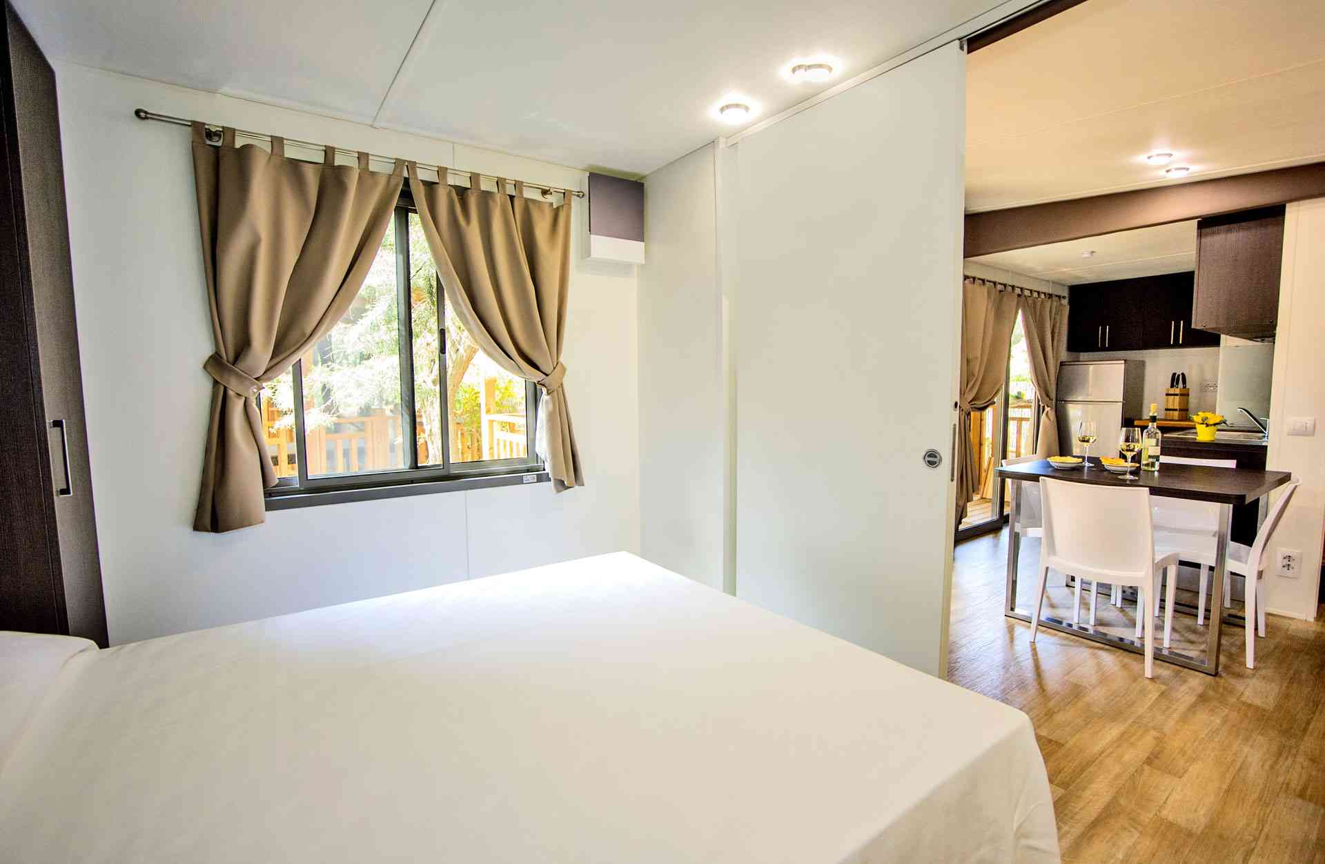 Mobile Home Superior se compose de une chambre double, une chambre double avec deux lits simples et un lit surélevé, salon avec canapé-lit (futon), TV et climatisation (chaud/froid), coin-cuisine équipée avec vaisselle et réfrigérateur/congélateur. Superior dispose de deux salles de bains: une avec WC et lavabo et l’autre avec WC, lavabo et douche. Terrasse extérieure avec table et bancs.