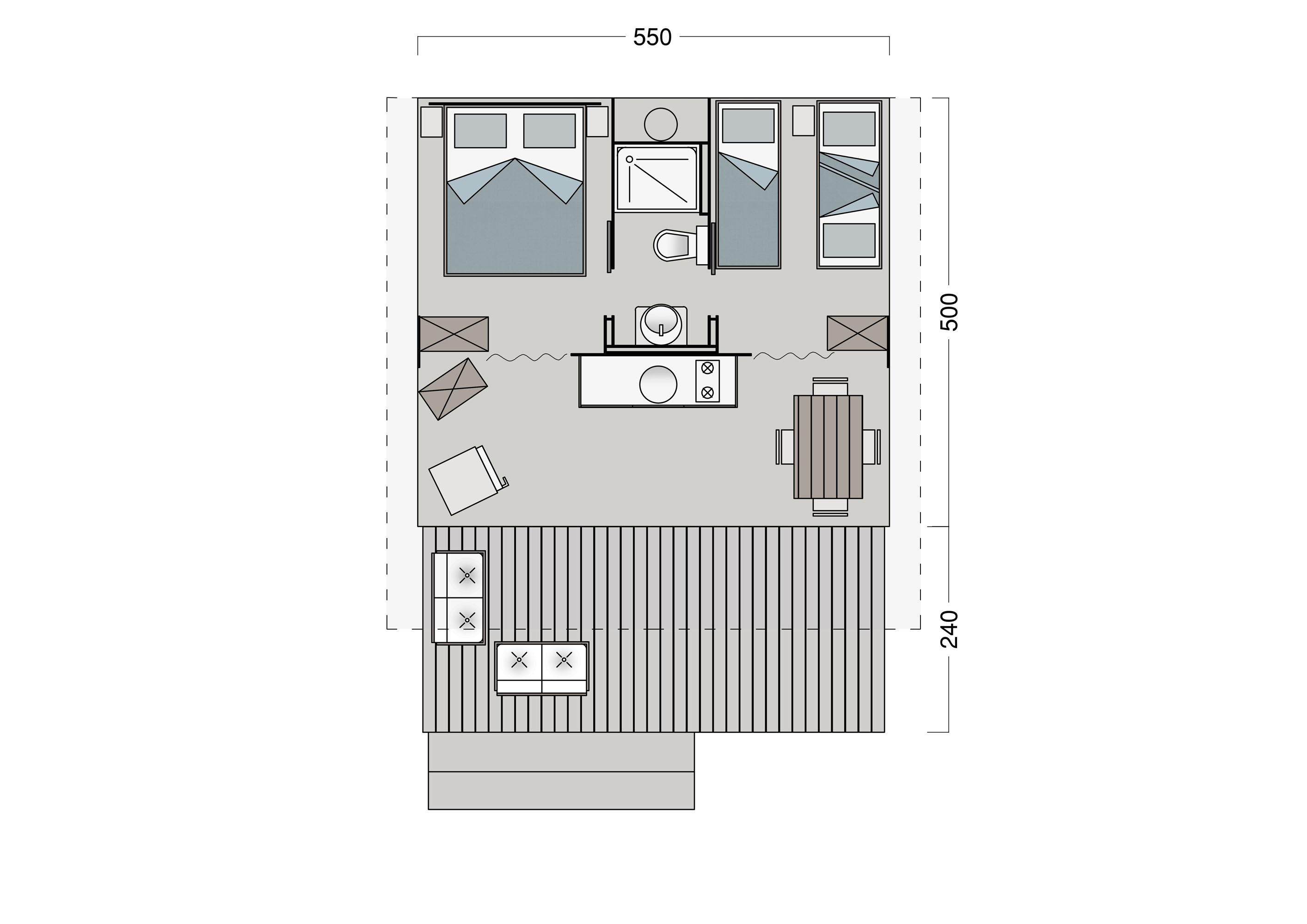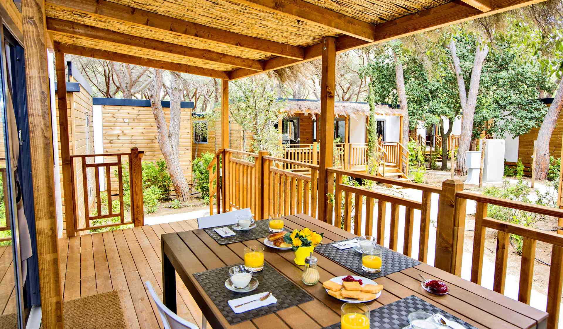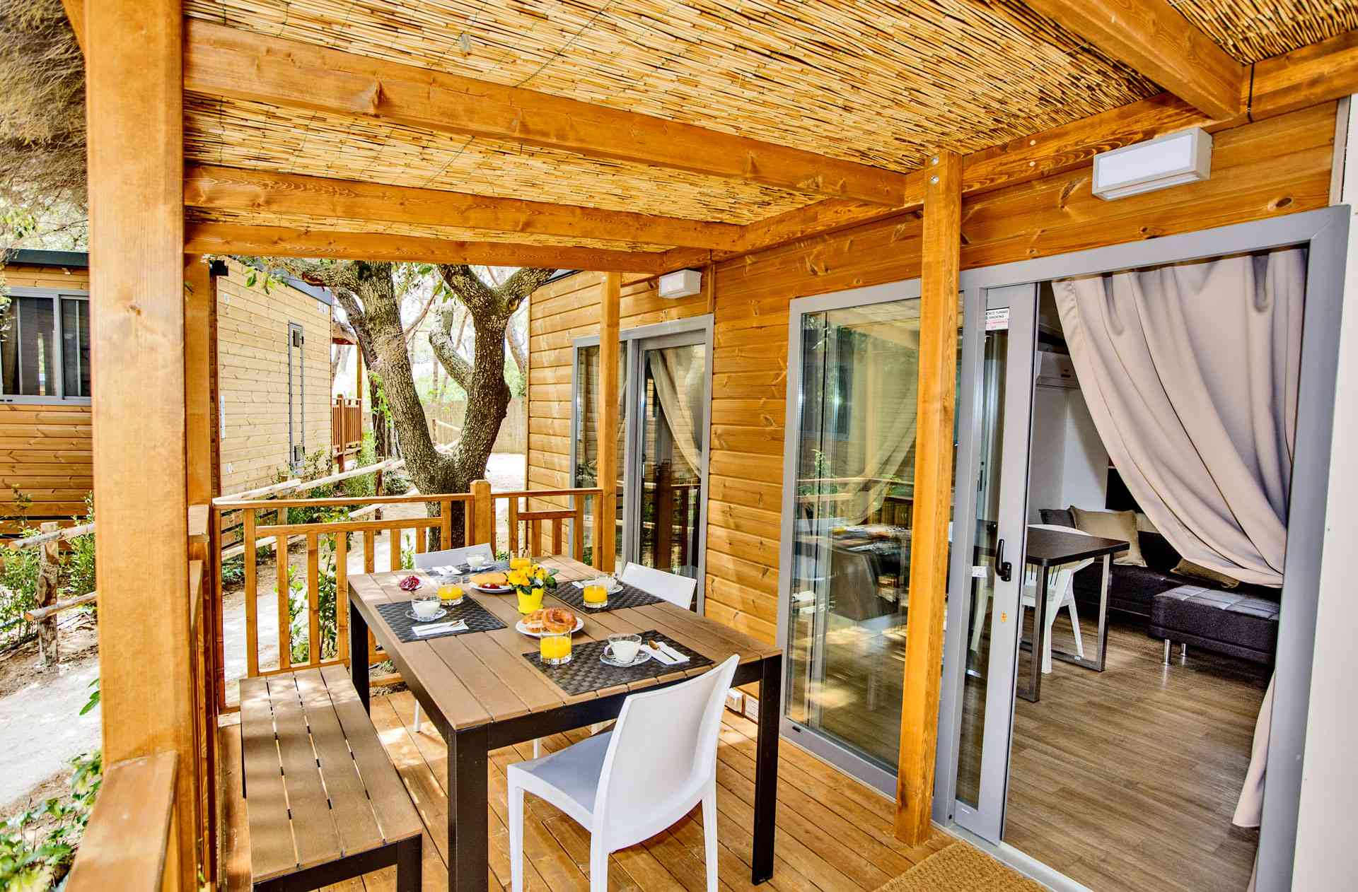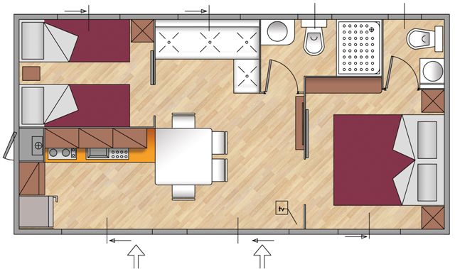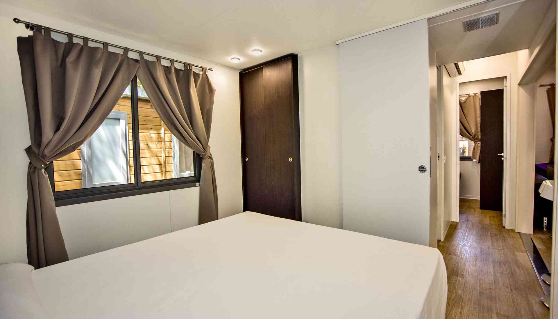 Mobile Home Superior se compose de une chambre double, une chambre double avec deux lits simples et un lit surélevé, salon avec canapé-lit (futon), TV et climatisation (chaud/froid), coin-cuisine équipée avec vaisselle et réfrigérateur/congélateur. Superior dispose de deux salles de bains: une avec WC et lavabo et l’autre avec WC, lavabo et douche. Terrasse extérieure avec table et bancs.