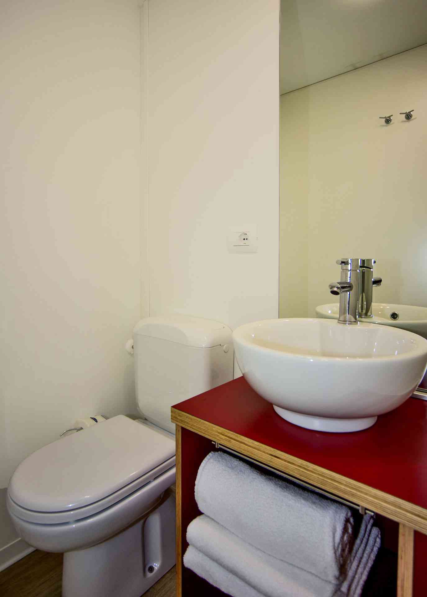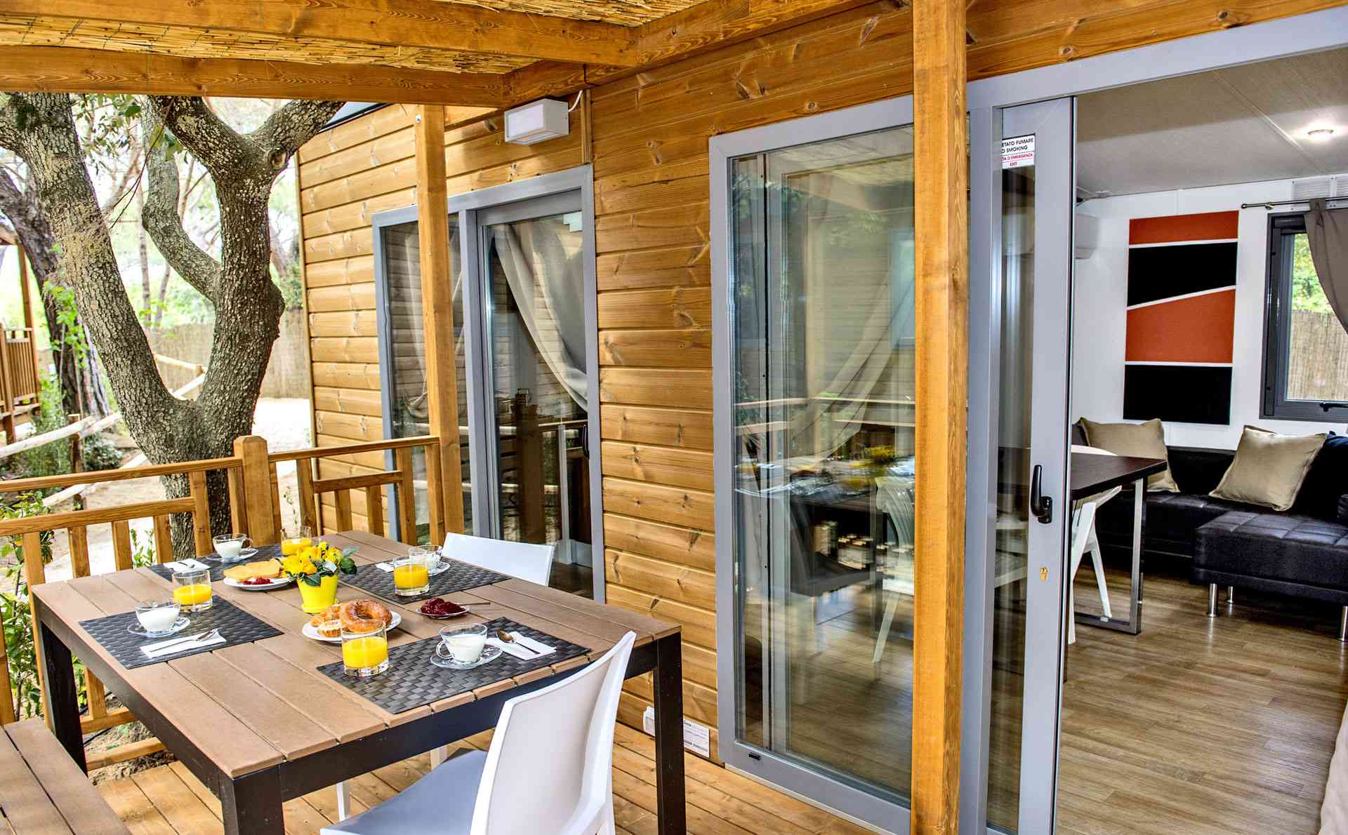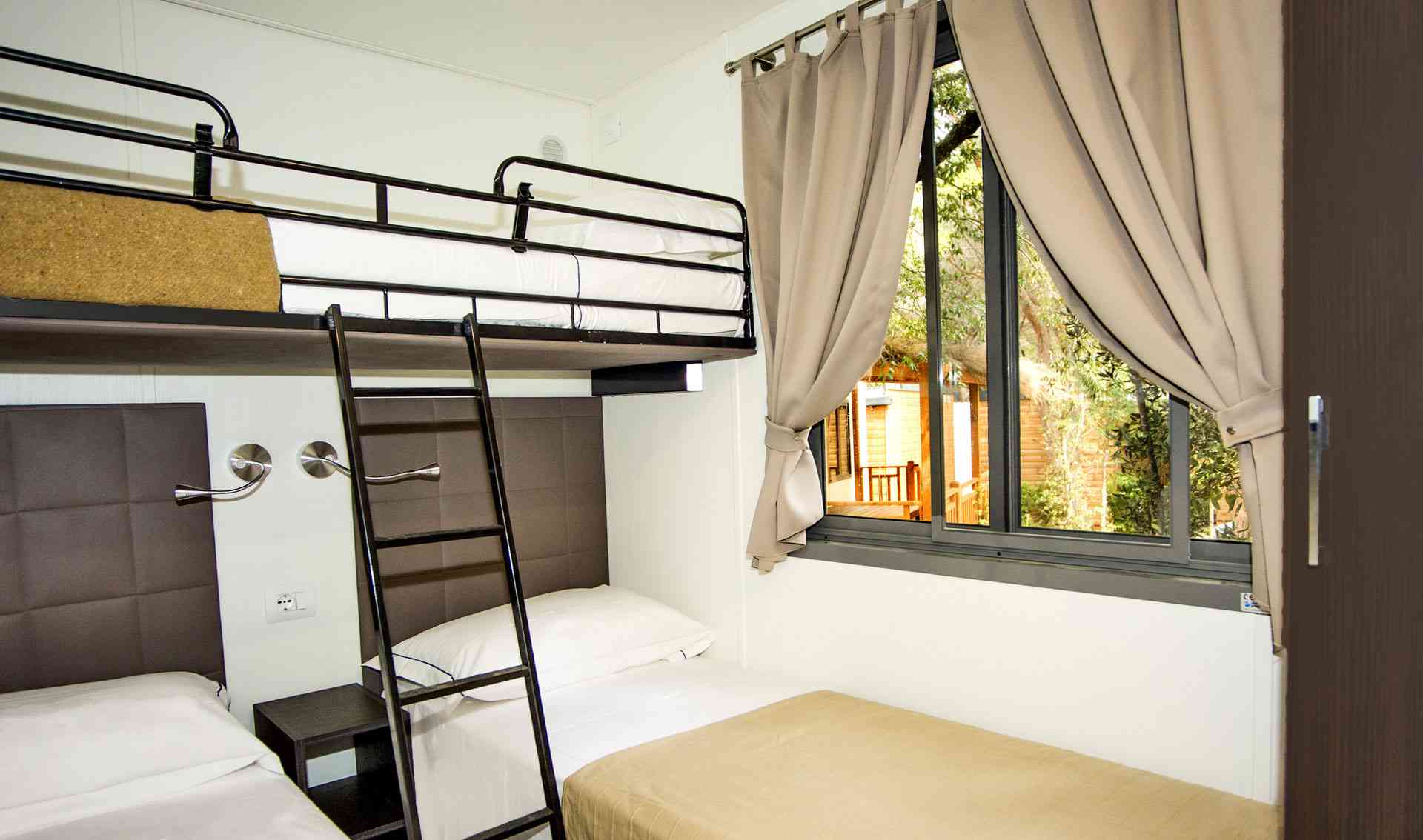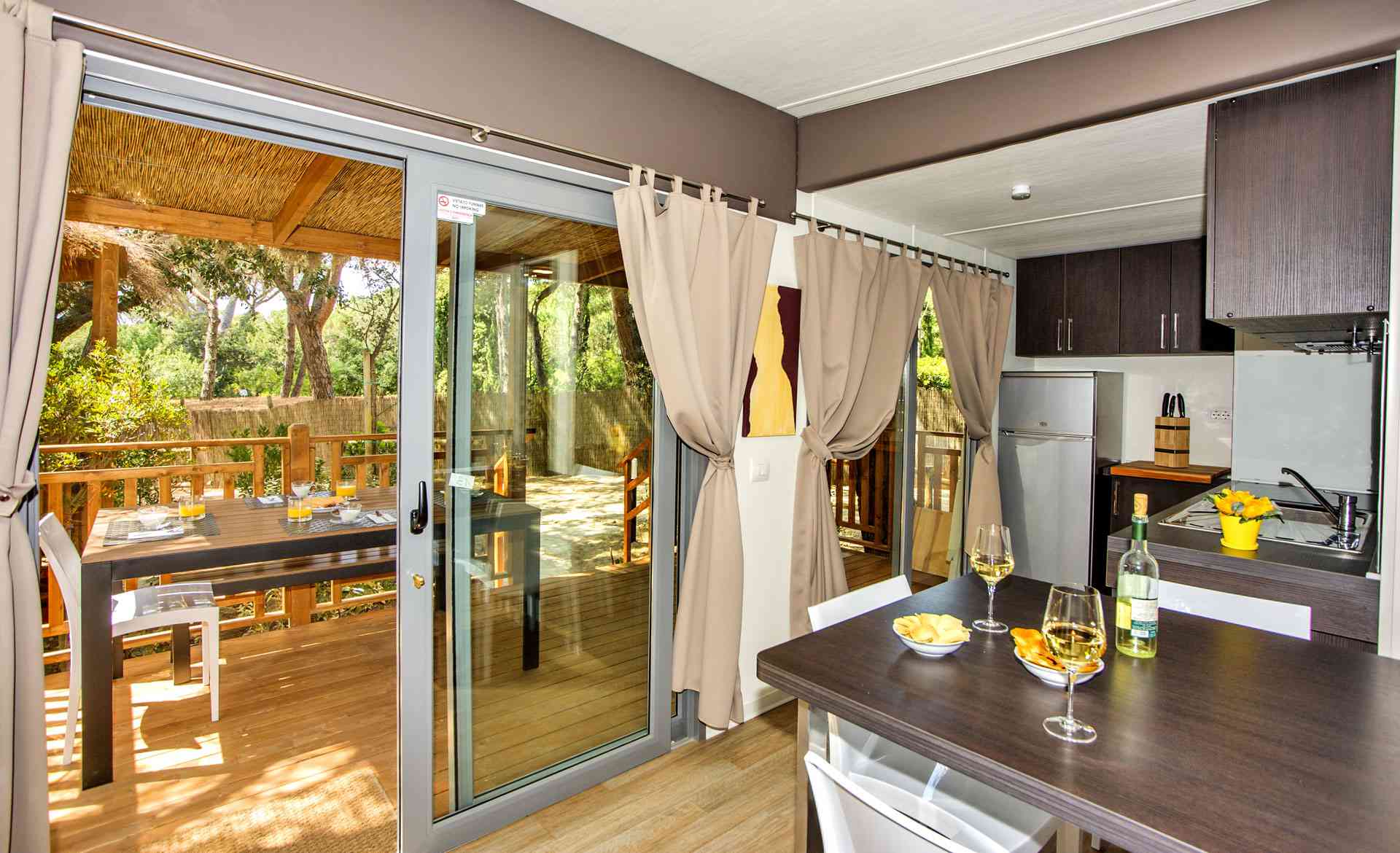Mobile Home Superior se compose de une chambre double, une chambre double avec deux lits simples et un lit surélevé, salon avec canapé-lit (futon), TV et climatisation (chaud/froid), coin-cuisine équipée avec vaisselle et réfrigérateur/congélateur. Superior dispose de deux salles de bains: une avec WC et lavabo et l’autre avec WC, lavabo et douche. Terrasse extérieure avec table et bancs.