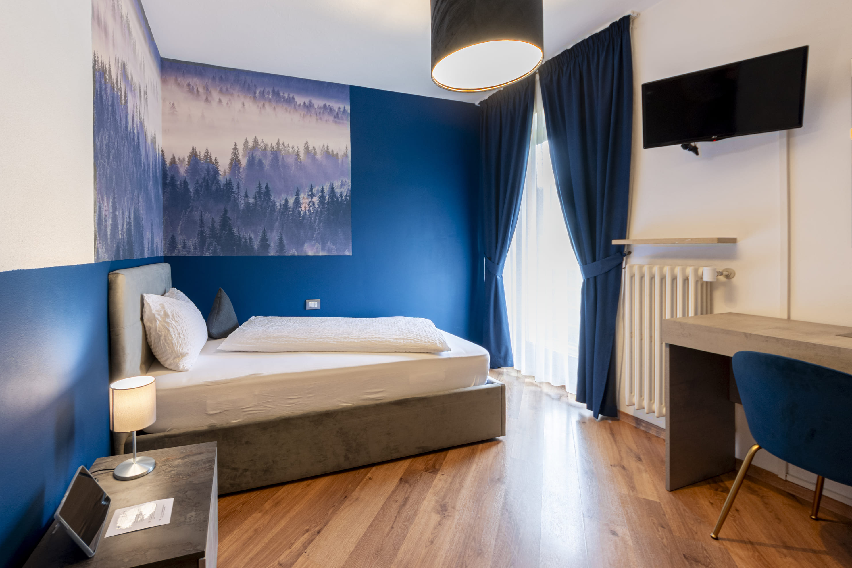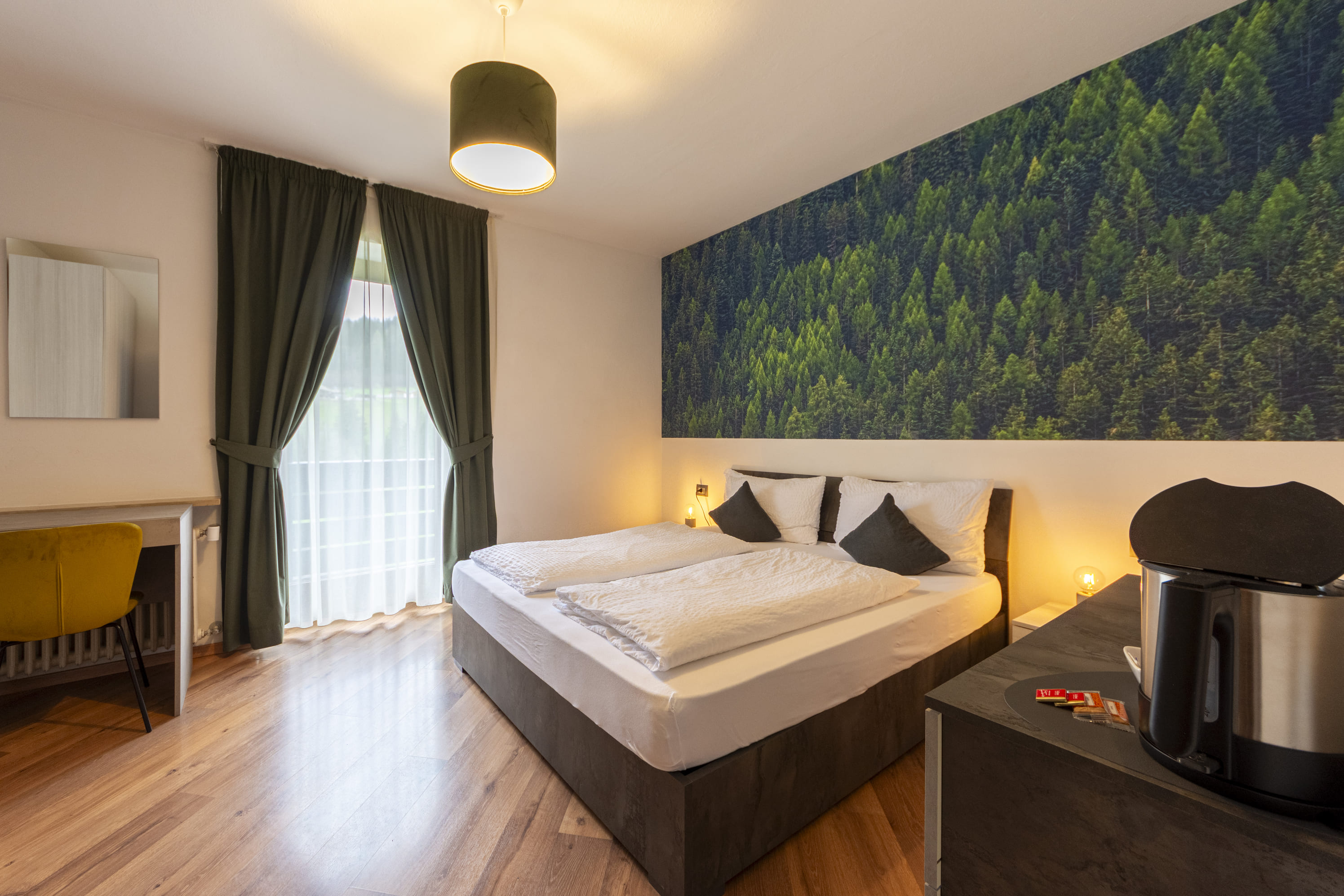Le nostre Dolomites Room offrono un’atmosfera intima e confortevole, per una vacanza outdoor o un tranquillo soggiorno. Ogni camera offre un rifugio accogliente e funzionale. L'arredamento moderno si sposa armoniosamente con la natura circostante, creando un'atmosfera rilassante e raffinata. Una parete suggestiva decorata con motivi ispirati alla bellezza delle Dolomiti aggiunge un tocco di eleganza e connessione con l'ambiente esterno.