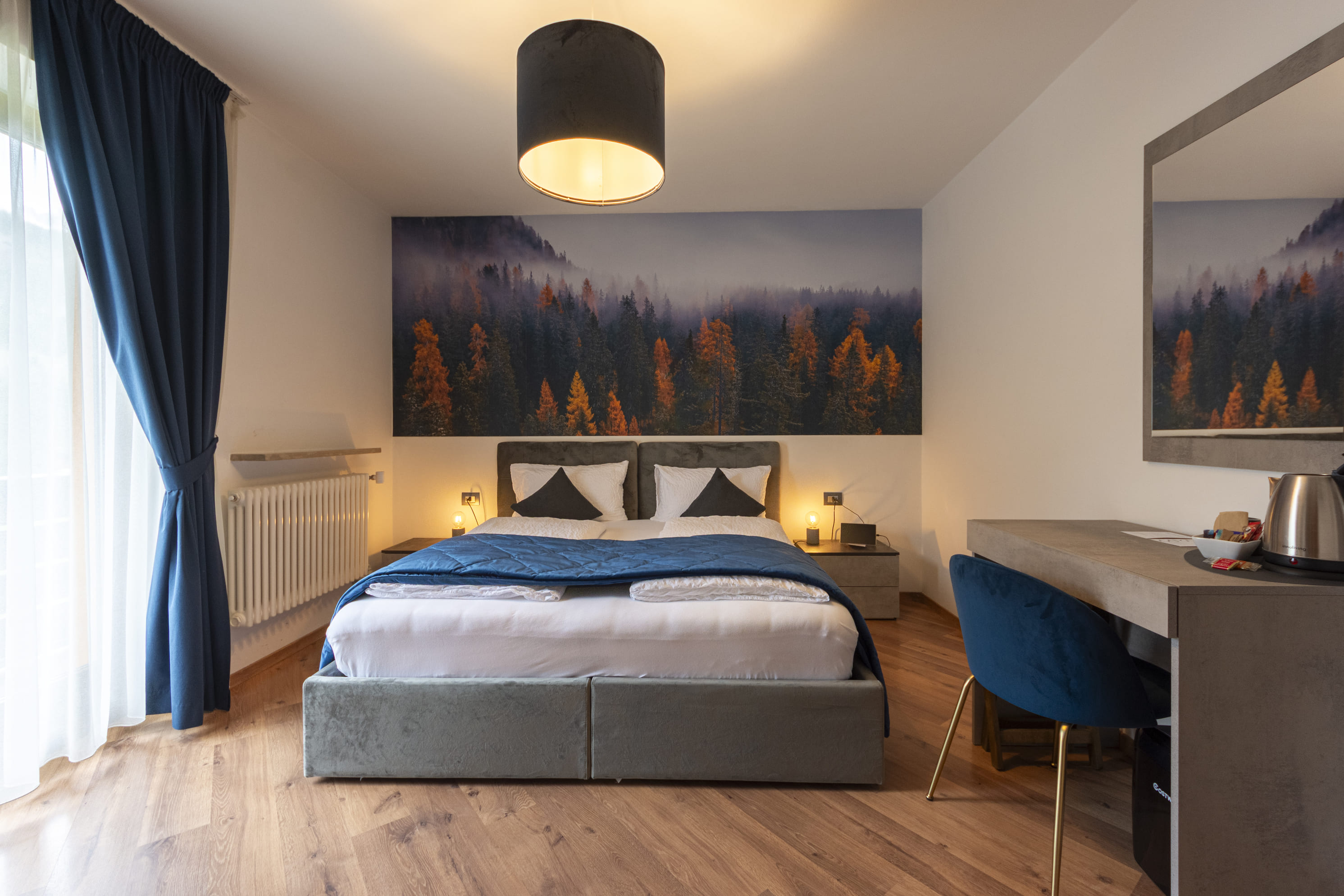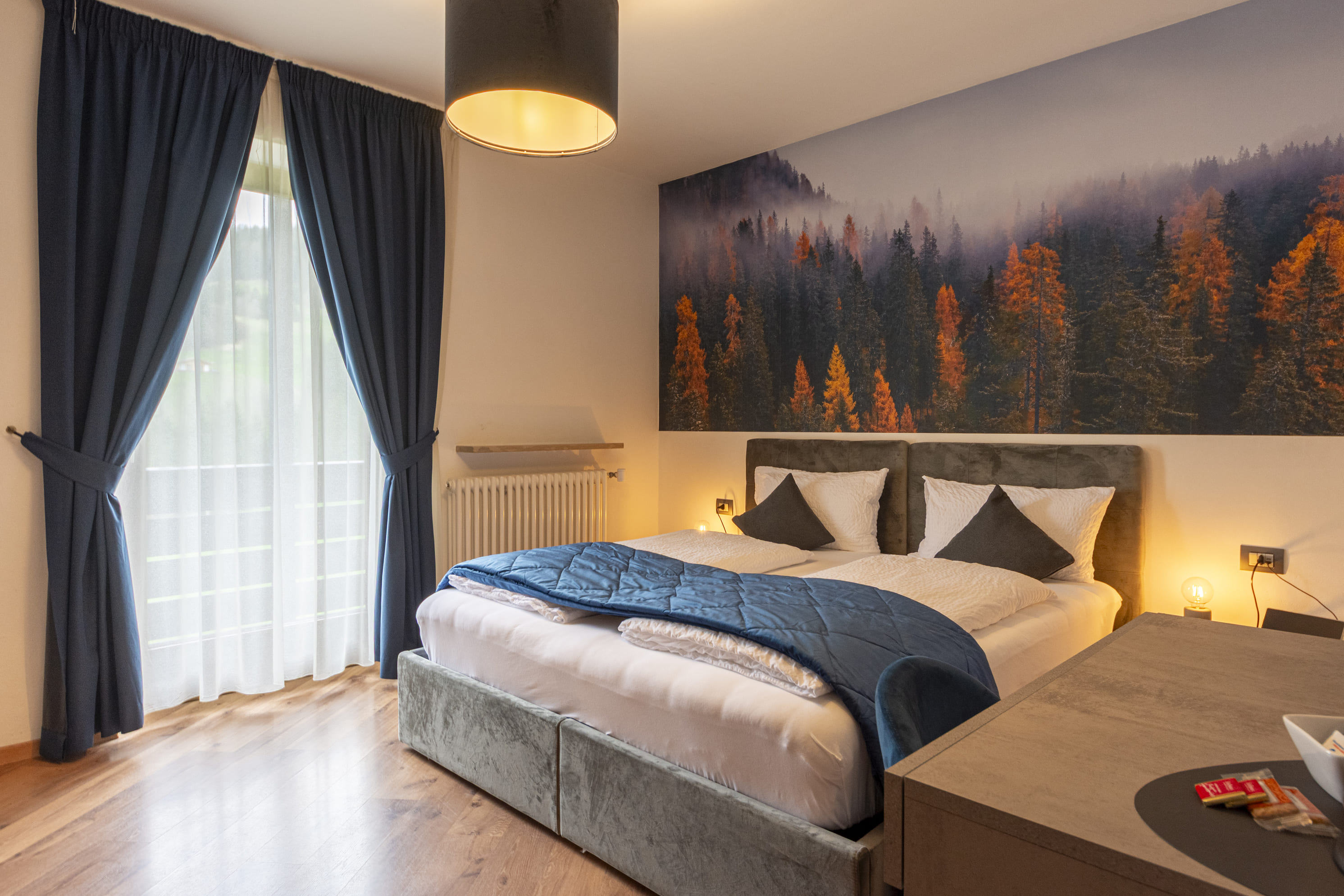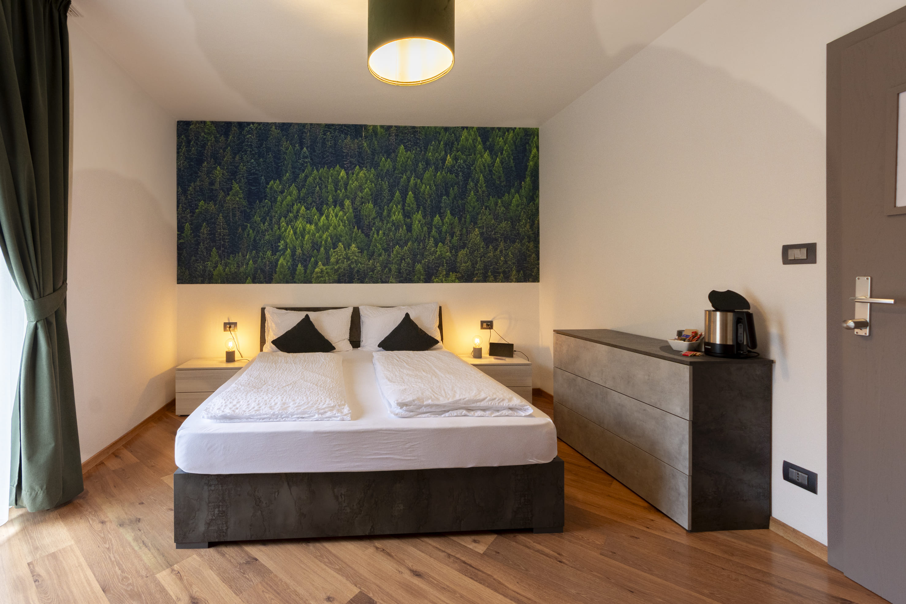 Le nostre Dolomites Room offrono un’atmosfera intima e confortevole, per una vacanza romantica o un tranquillo soggiorno. Ogni camera offre un rifugio accogliente e funzionale. L'arredamento moderno si sposa armoniosamente con la natura circostante, creando un'atmosfera rilassante e raffinata. Una parete suggestiva decorata con motivi ispirati alla bellezza delle Dolomiti aggiunge un tocco di eleganza e connessione con l'ambiente esterno.