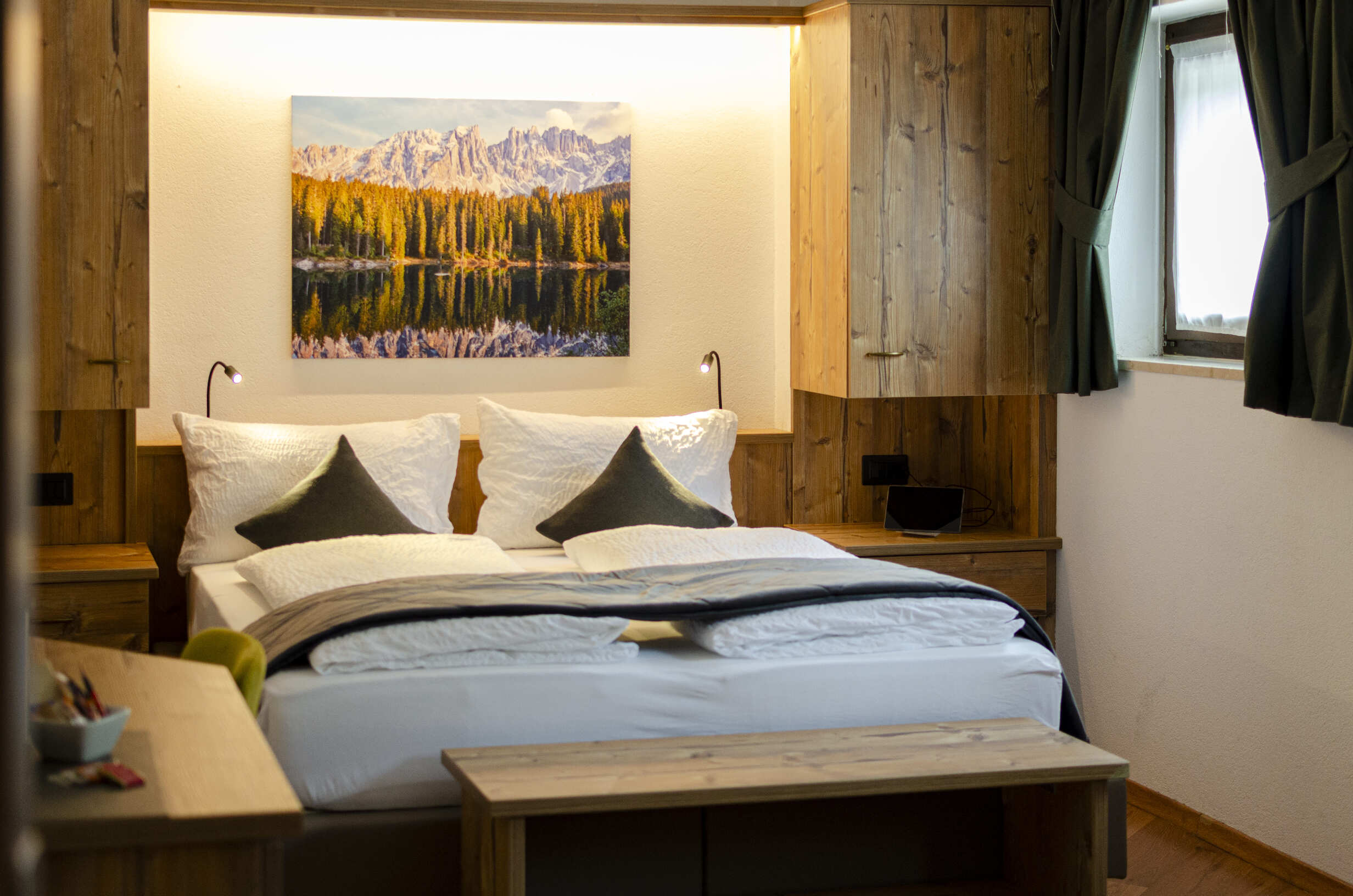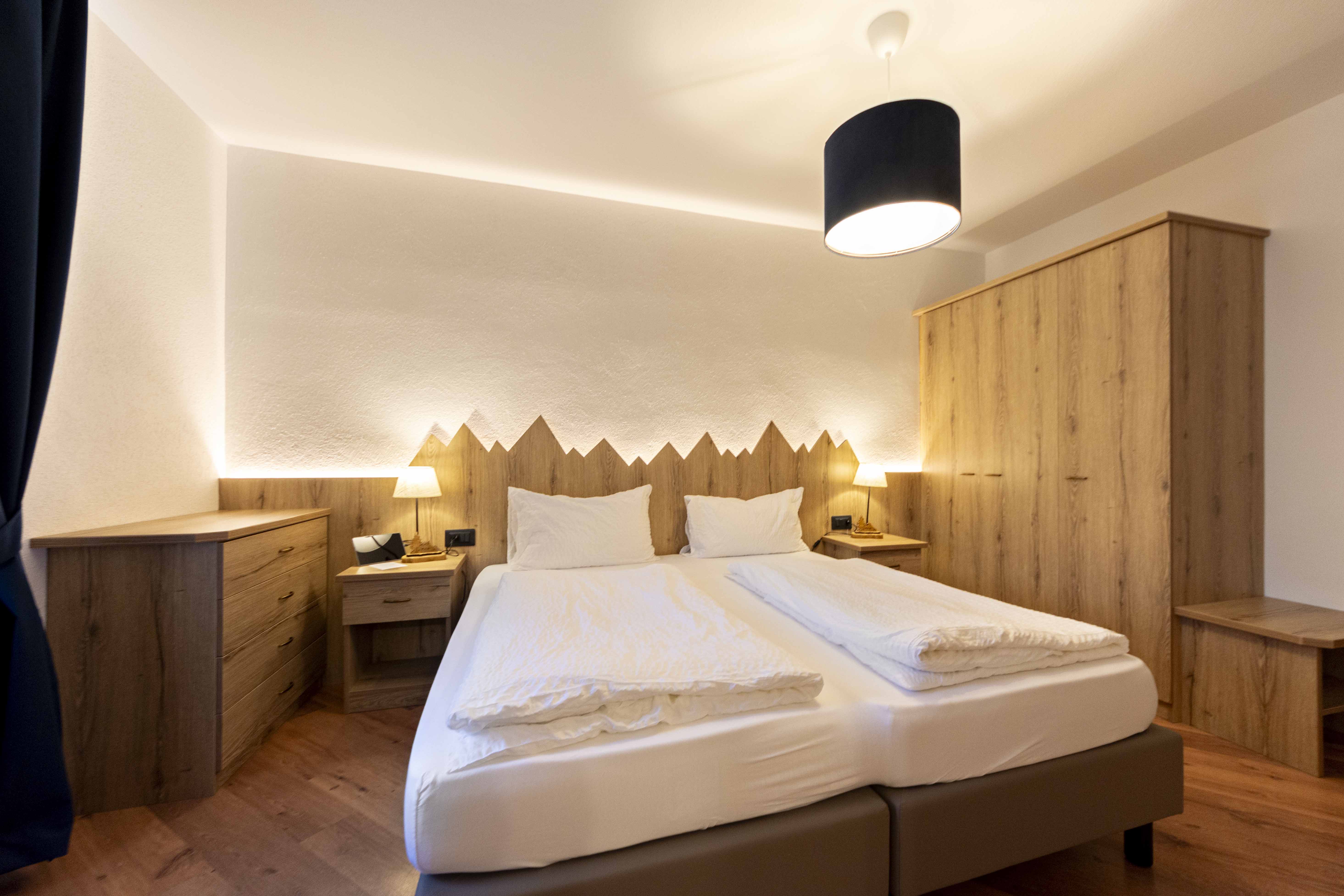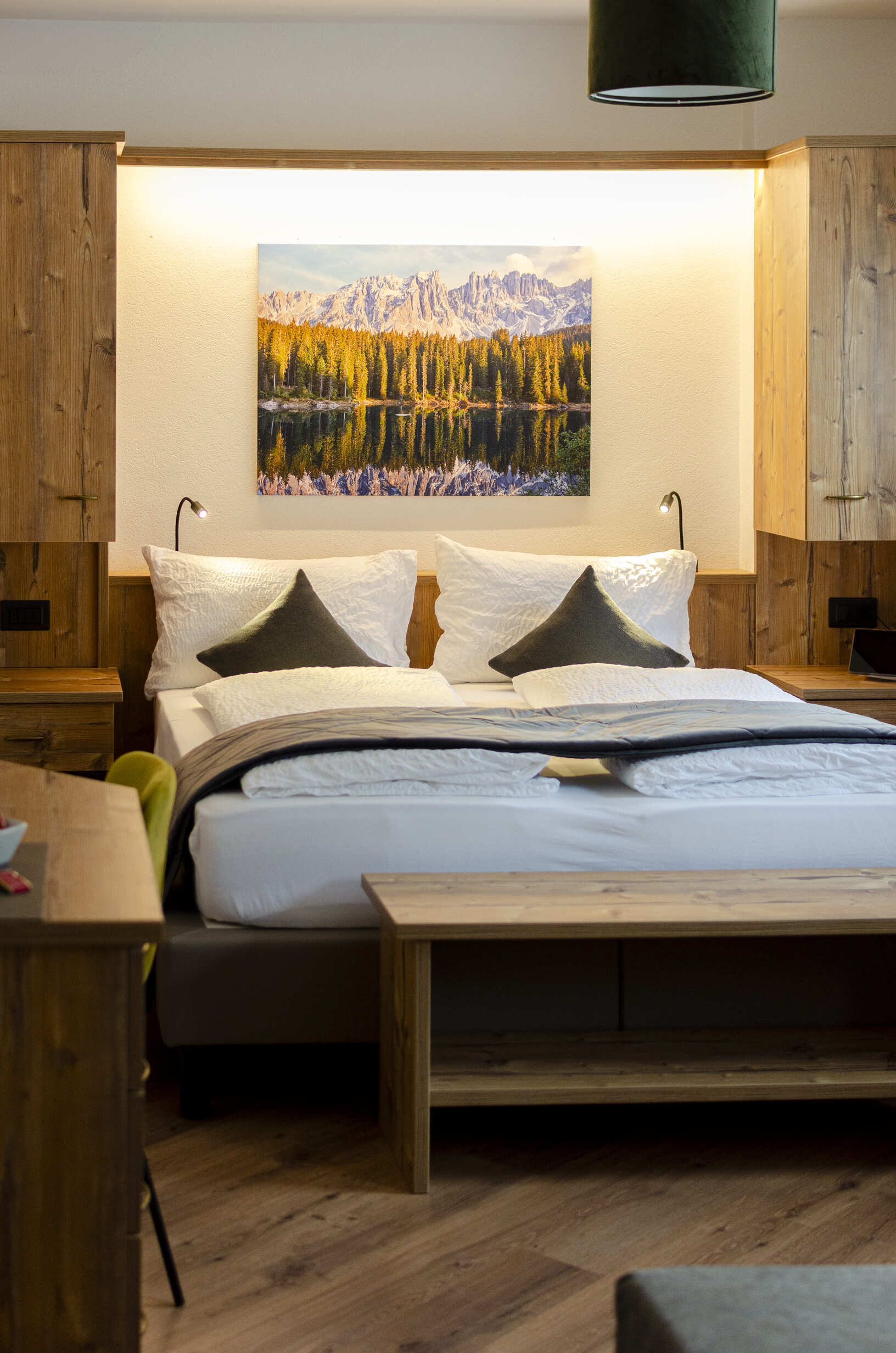 Le nostre Dolomites Room offrono un’atmosfera intima e confortevole, per una vacanza romantica o un tranquillo soggiorno. Ogni camera offre un rifugio accogliente e funzionale. L'arredamento moderno si sposa armoniosamente con la natura circostante, creando un'atmosfera rilassante e raffinata. Una parete suggestiva decorata con motivi ispirati alla bellezza delle Dolomiti aggiunge un tocco di eleganza e connessione con l'ambiente esterno.