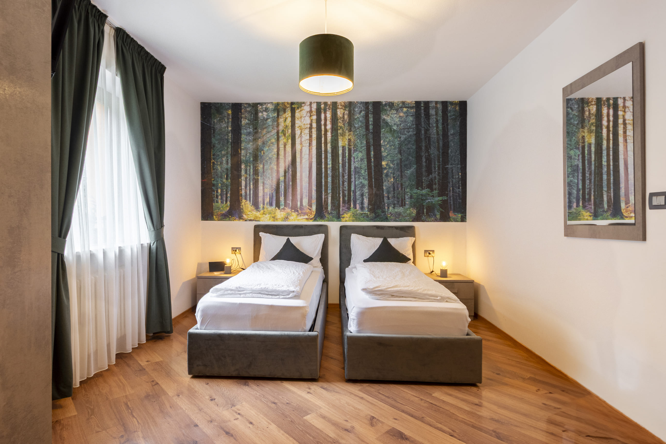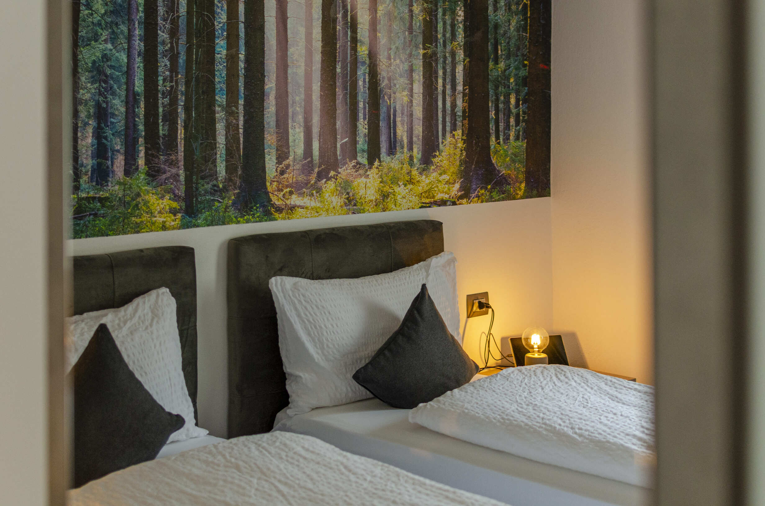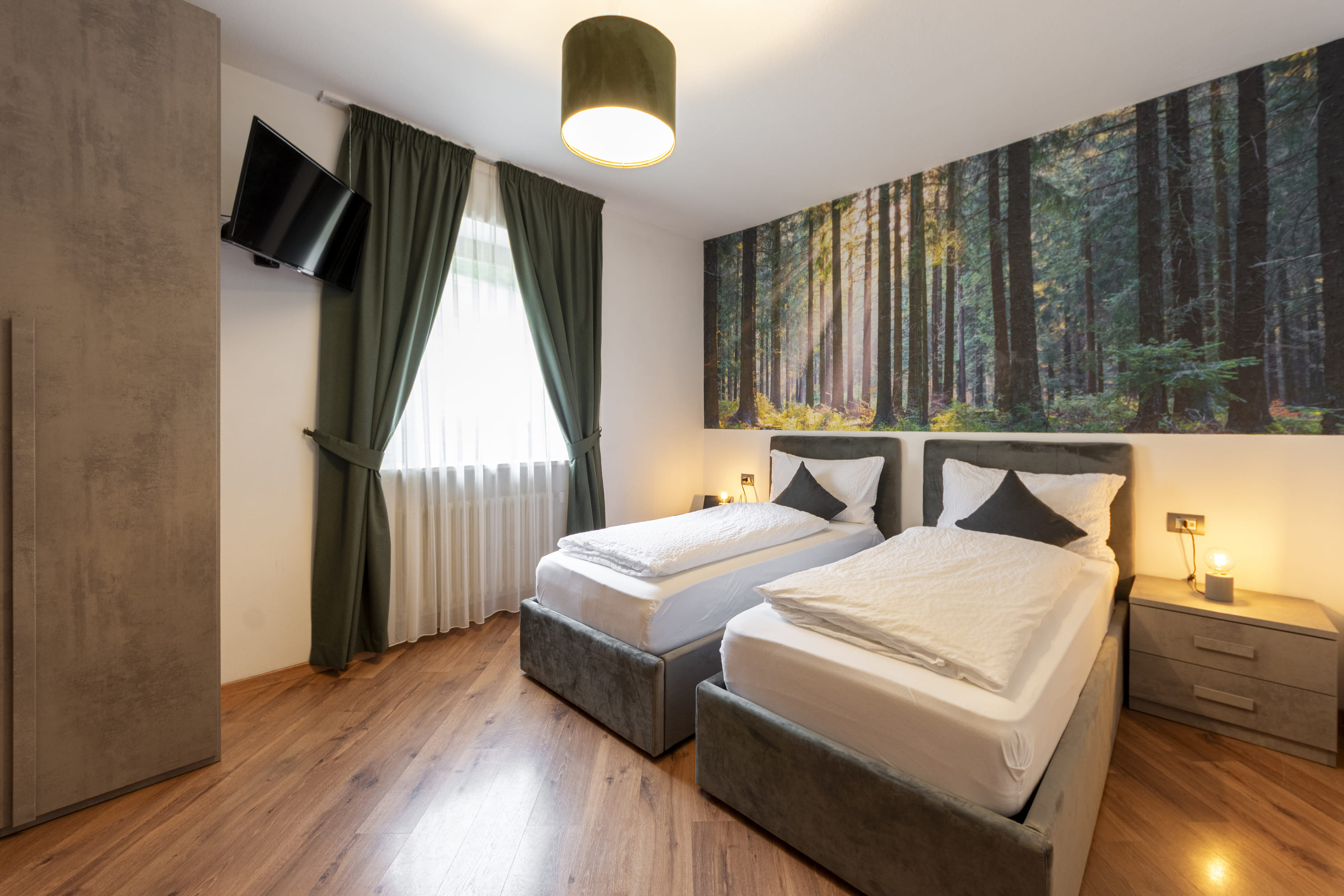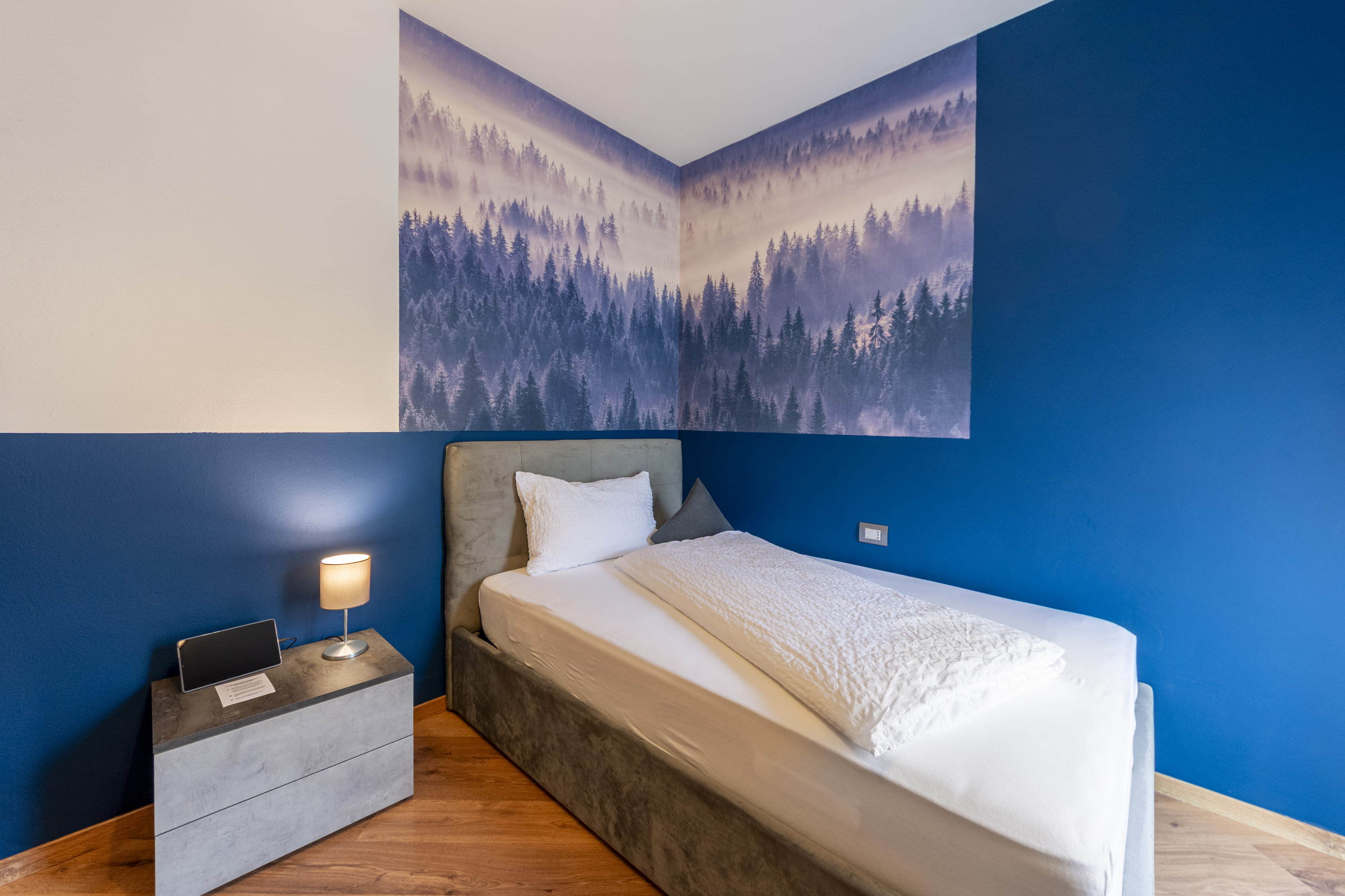 Le nostre Dolomites Room offrono un’atmosfera intima e confortevole, per un soggiorno tranquillo. Ogni camera offre un rifugio accogliente e funzionale. L'arredamento moderno si sposa armoniosamente con la natura circostante, creando un'atmosfera rilassante e raffinata. Una parete suggestiva decorata con motivi ispirati alla bellezza delle Dolomiti aggiunge un tocco di eleganza e connessione con l'ambiente esterno.