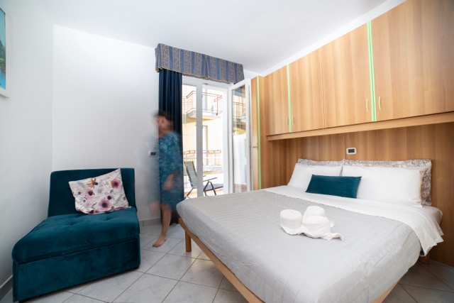 Ideali per 2 adulti e 2 bambini con un letto matrimoniale e un letto a castello oppure due letti singoli. In alcune camere c’è la possibilità di aggiungere un’ulteriore branda aggiuntiva, per le famiglie più numerose. Le stanze spaziose ed accoglienti sono dotate di tutti i comfort: Wi-fi, aria condizionata, TV, piccolo frigo.. Ad ogni camera appartiene un parcheggio e un posto spiaggia.
