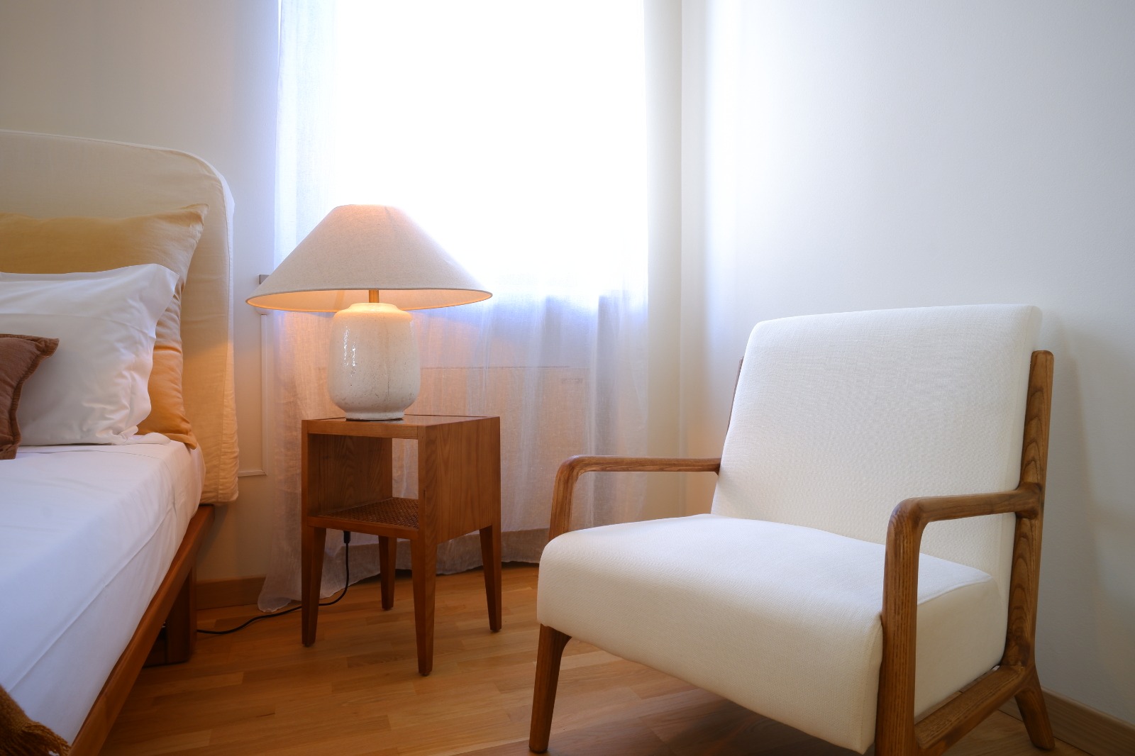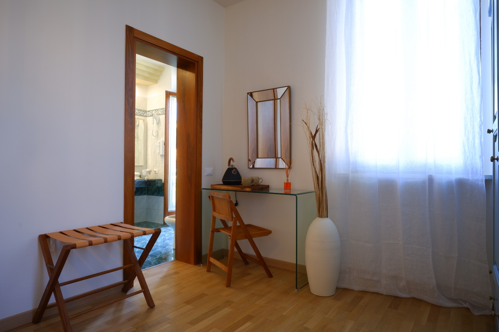 Arredamento tradizionale, con qualche elemento ispirato alle origini, letto in ferro battuto, parquet in rovere. Bagni in ceramica anticata effetto marmo, con sanitari color champagne, hanno una piccola doccia ed una ampia vasca idromassaggio angolare.