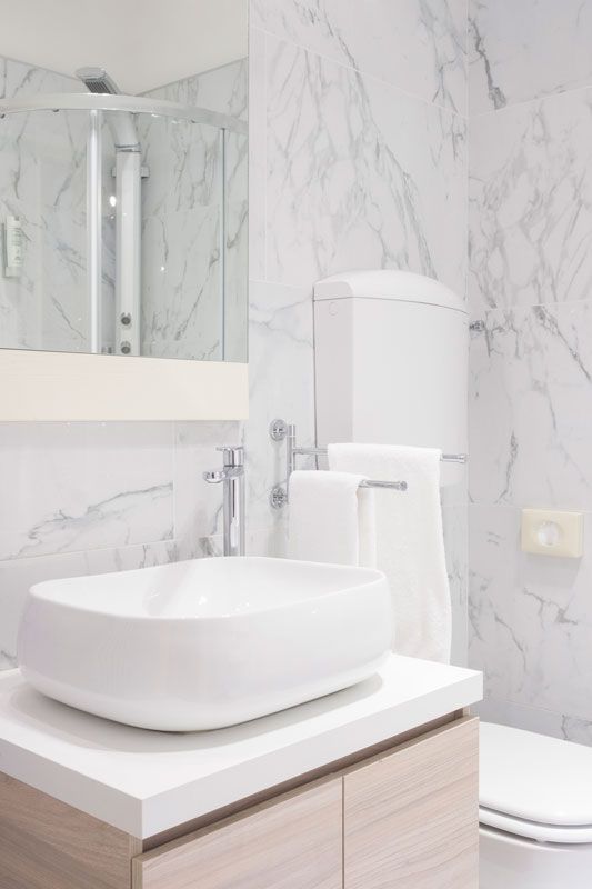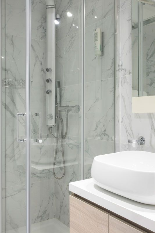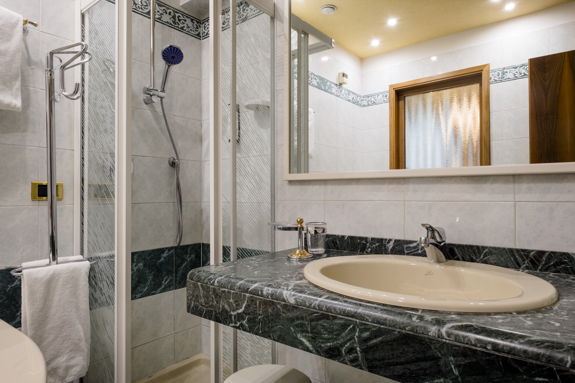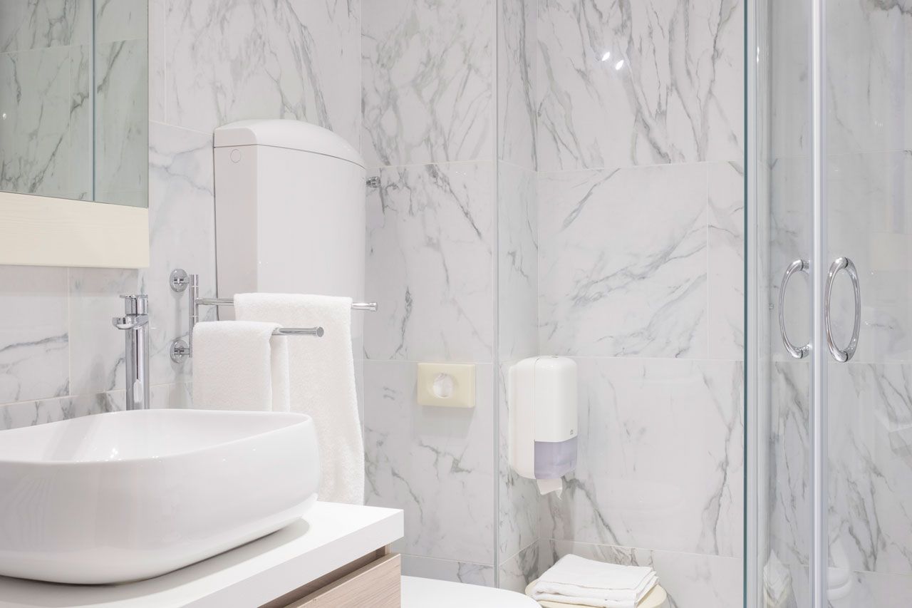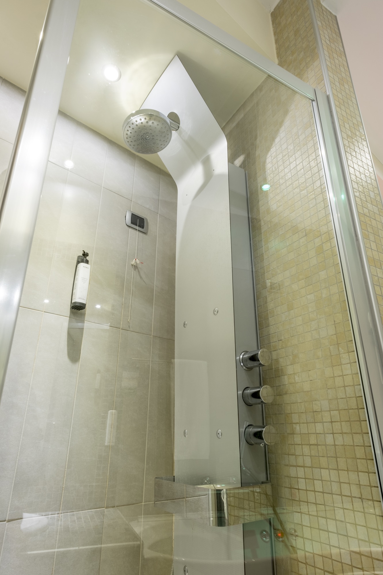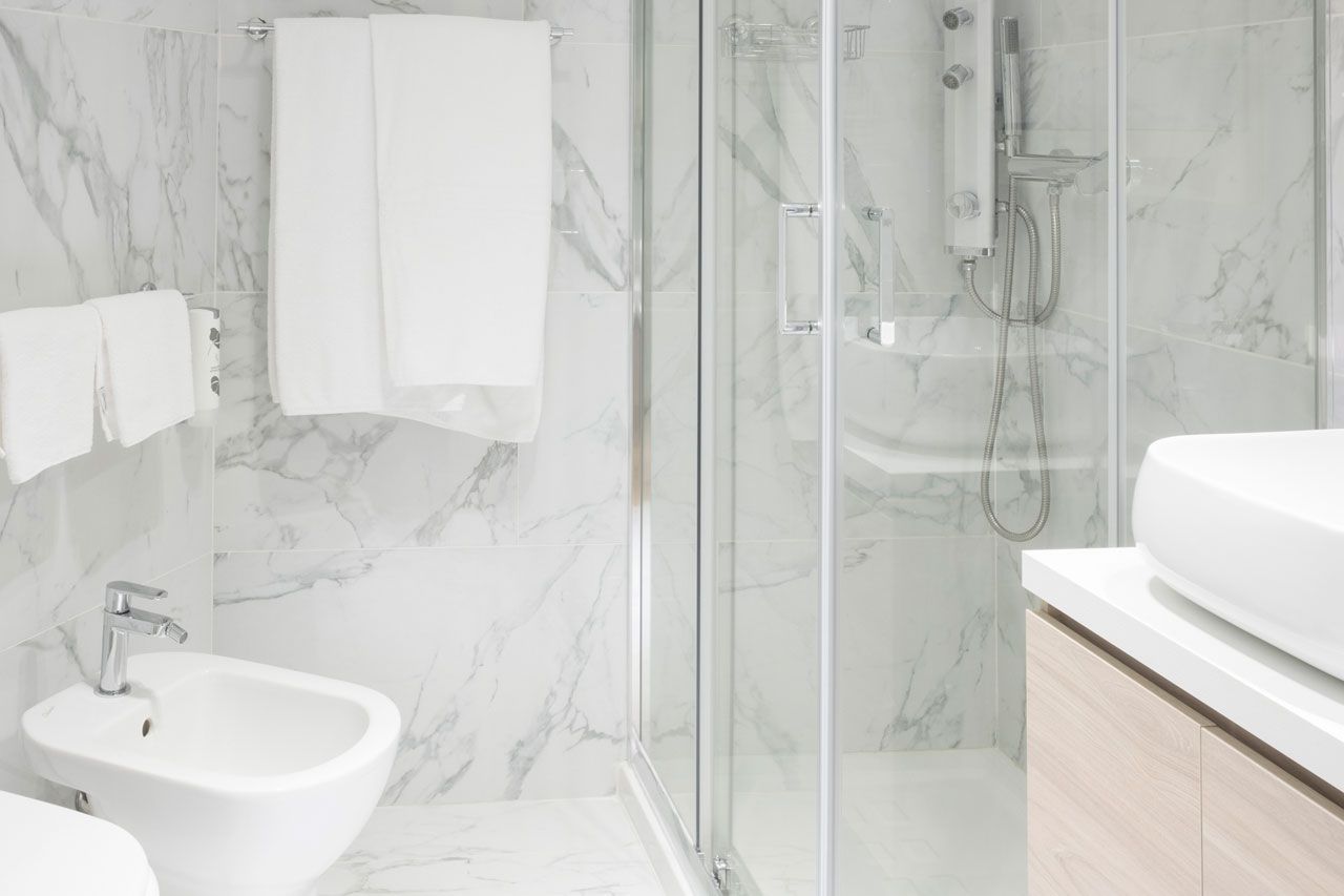 I bagni, tutti con doccia, sono rivestiti di ecomarmo bianco statuario, un materiale altamente tecnologico che riproduce con sorprendente efficacia il marmo usato dagli artisti del rinascimento, ma che non comporta una attività estrattiva che rovina il paesaggio, come accade purtroppo per le cave di pietre naturali