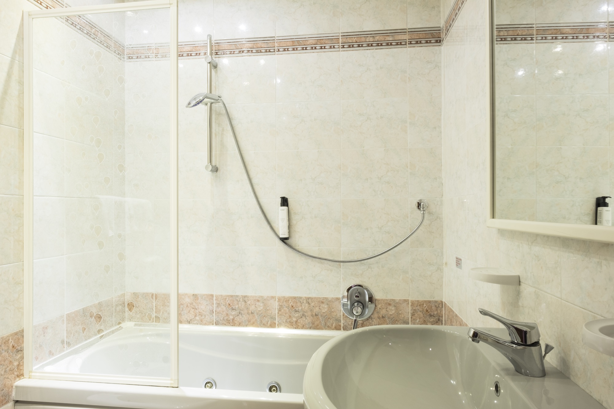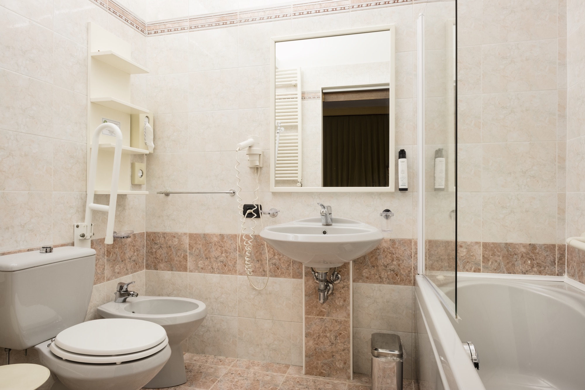 Arredamento classico, bagni con vasca e sanitari color grigio Mondrian.
