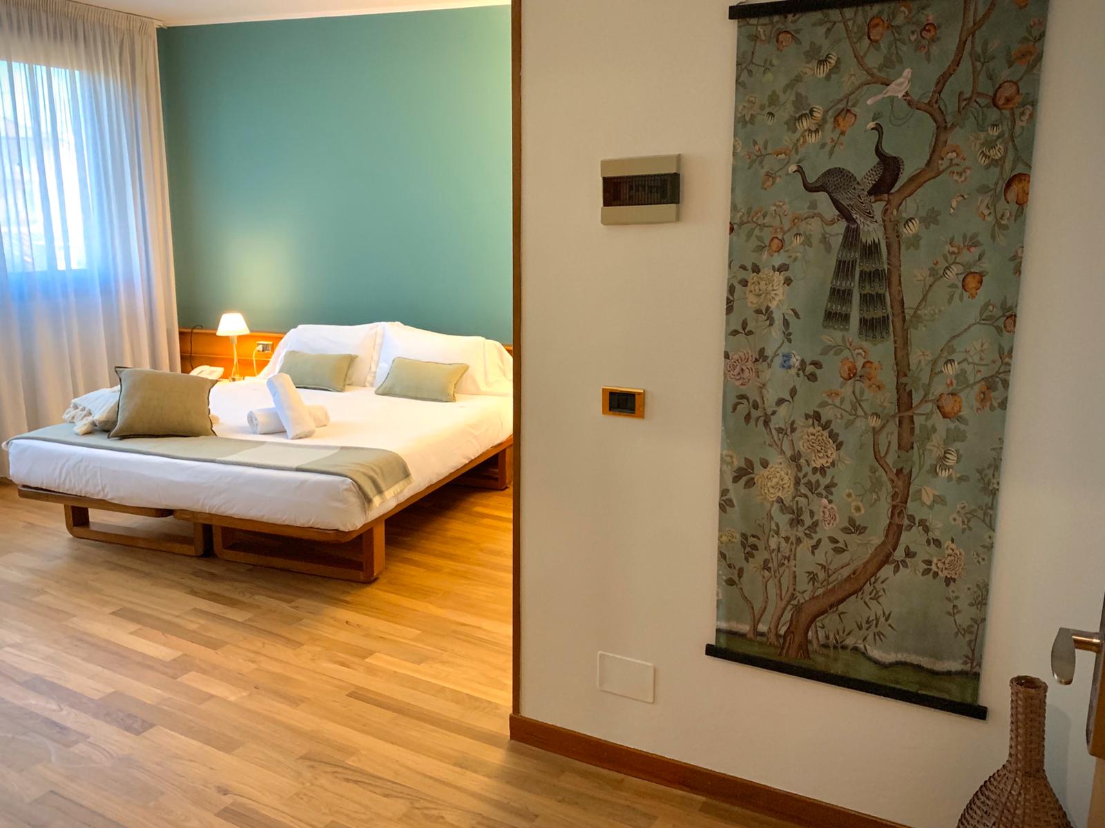 Pavimento in parquet, ampio bagno su due livelli con le stesse ceramiche "Oxygena” esistenti nella SPA e nelle camere deluxe. Cabina-armadio per riporre comodamente bagagli ed effetti personali, doppio balcone con vista sulle montagne veronesi