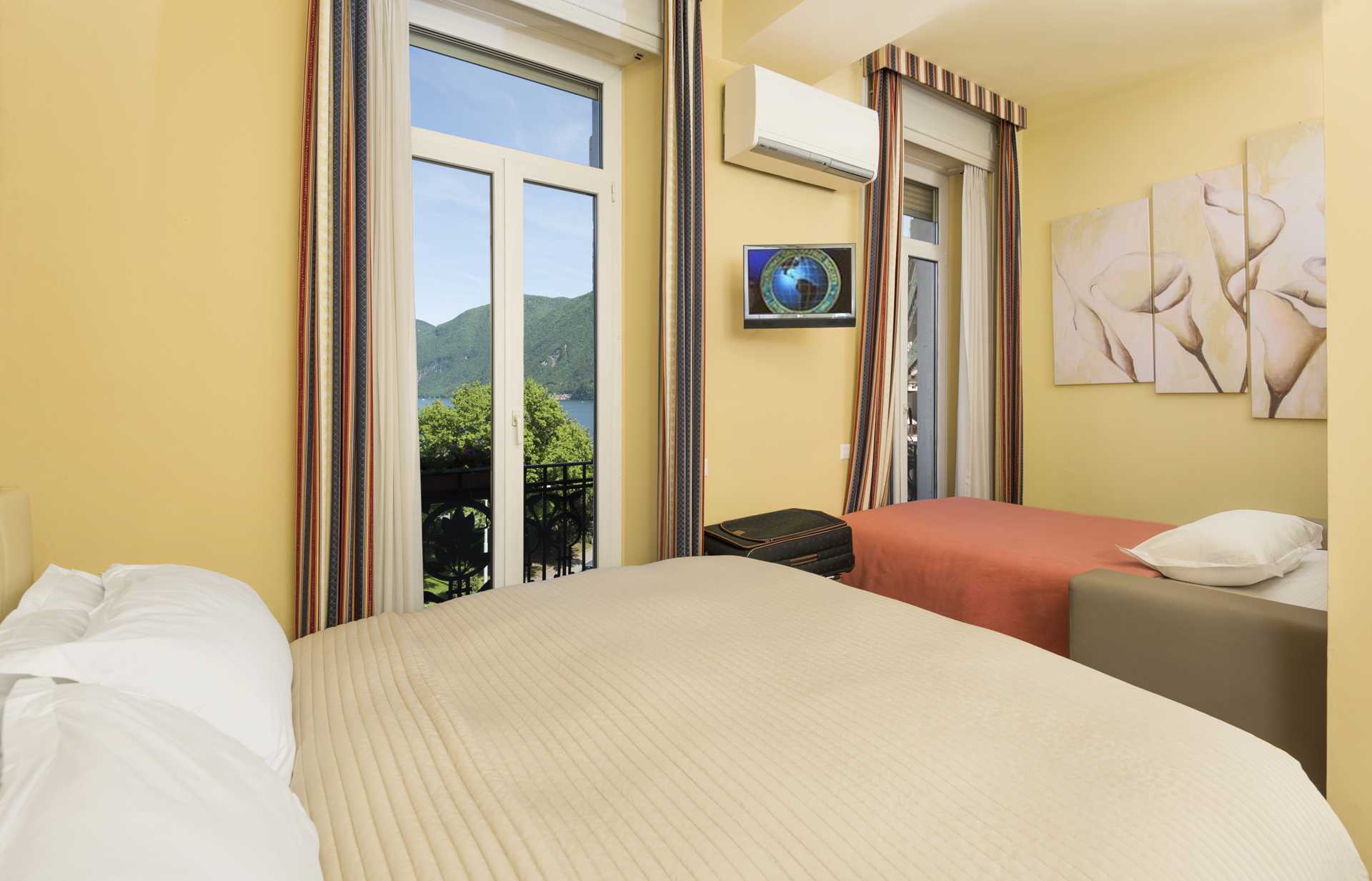 Le nostre stanze Superior Vista Lago godono di un’incomparabile vista sul golfo di Lugano e dispongono di un letto matrimoniale (larghezza 160 cm) comodini con abat-jour, tv schermo piatto, armadio a tre ante, divano letto, cassaforte, bollitore e minibar. Alcune di queste stanze dispongono anche di balcone.