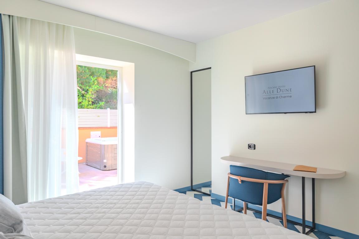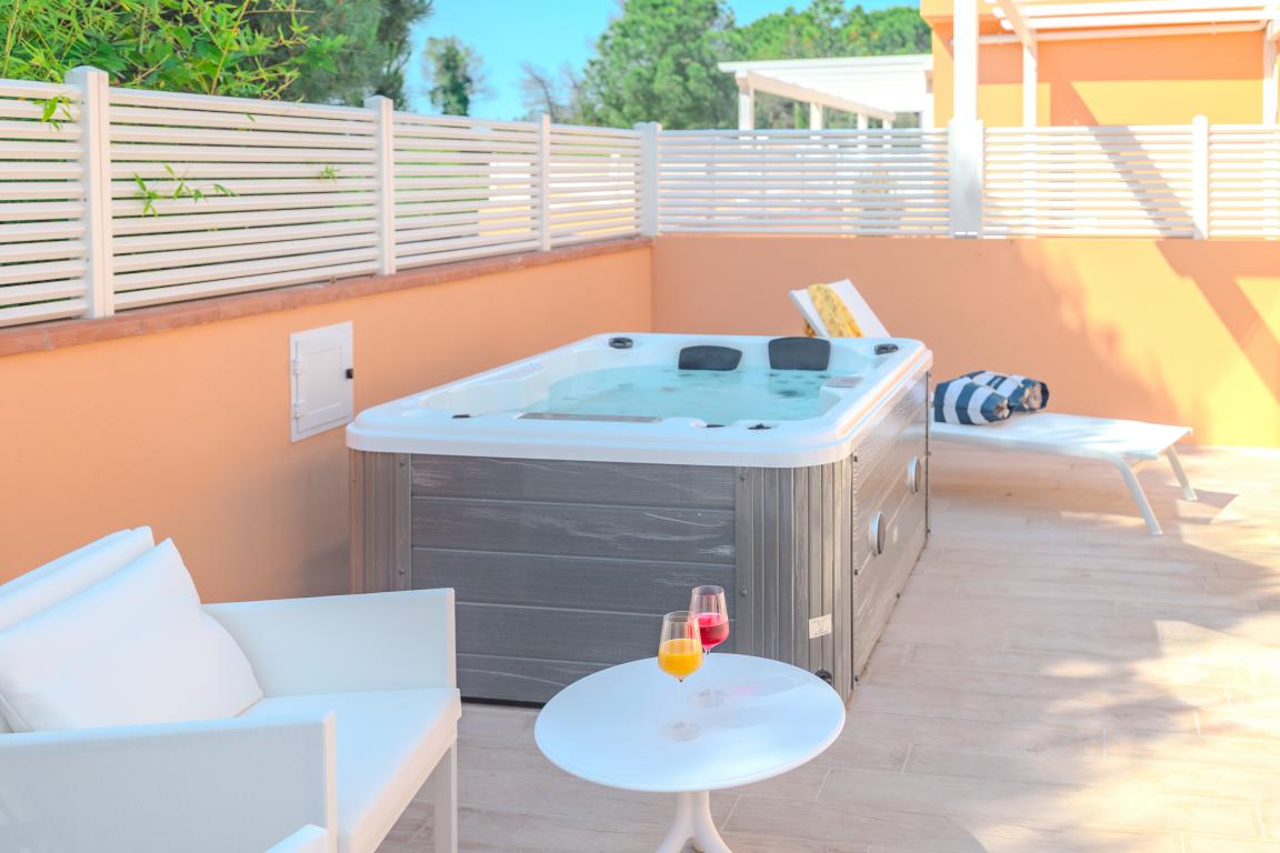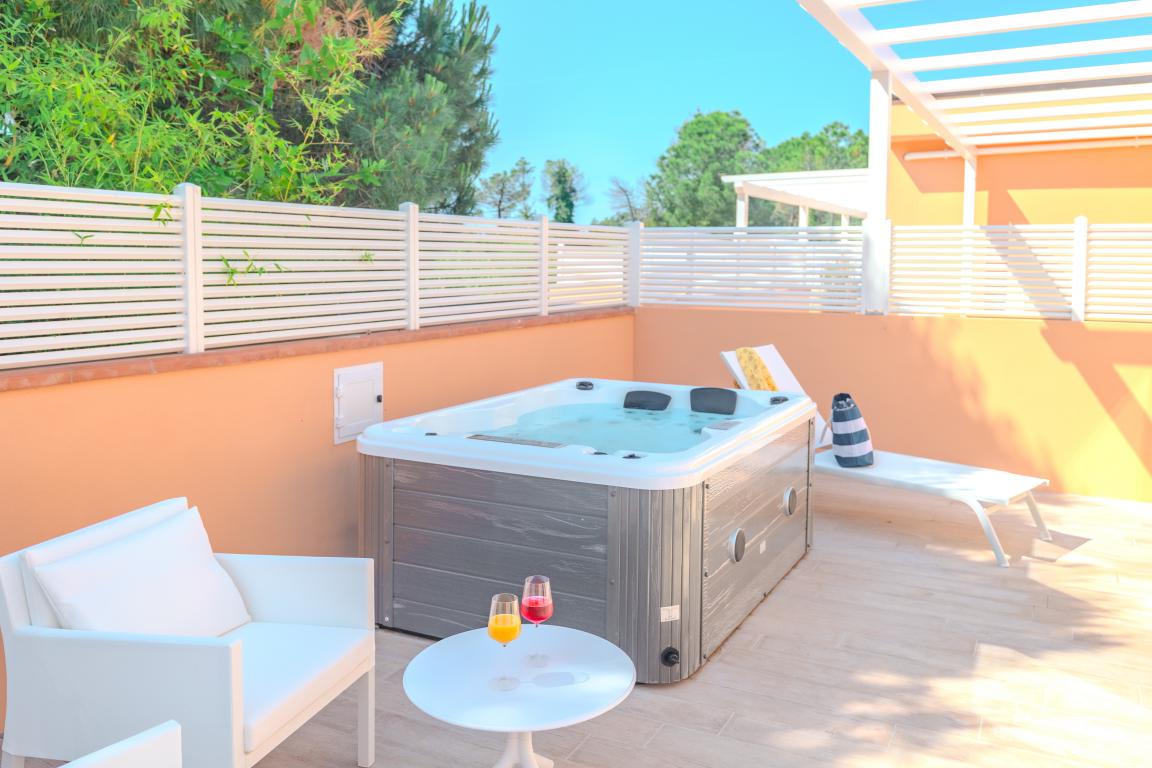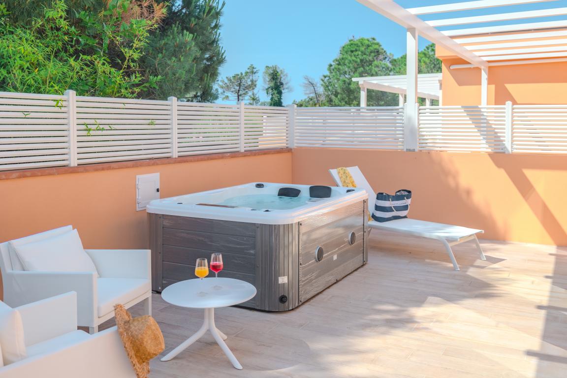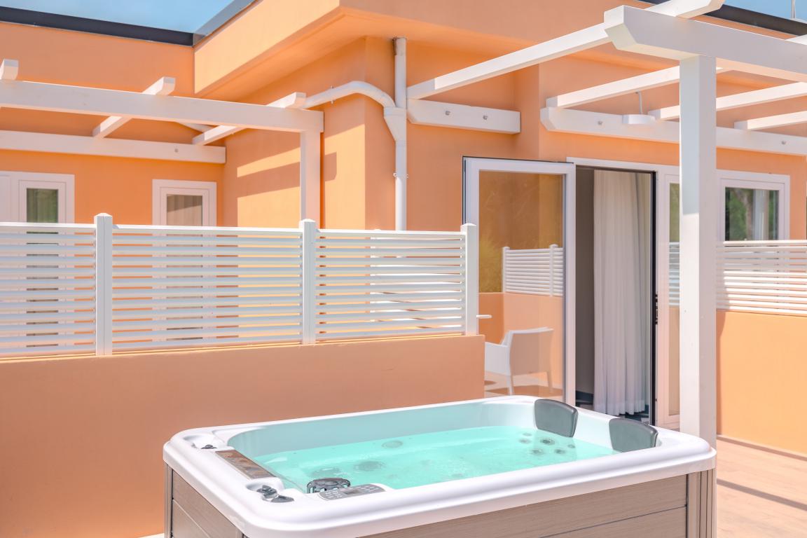 Situata all’interno di Villa Elba al piano rialzato, offre da 26 a 30 mq di spazio, dispone di un letto matrimoniale King Size con materasso Dorelan XXL (200x200) e di una terrazza privata di 25 mq dove potrai godere dell’idromassaggio ed immergerti nel benessere più totale. Nel prezzo del soggiorno avrai incluso parcheggio auto riservato e nel periodo dal 10.05 al 30.09 un grande gazebo con tre lettini e due poltroncine registe presso la nostra incantevole spiaggia attrezzata “Acacia” di fronte all’Hotel. Fuori dal periodo indicato verrà offerto un ombrellone con due lettini e una poltroncina regista.