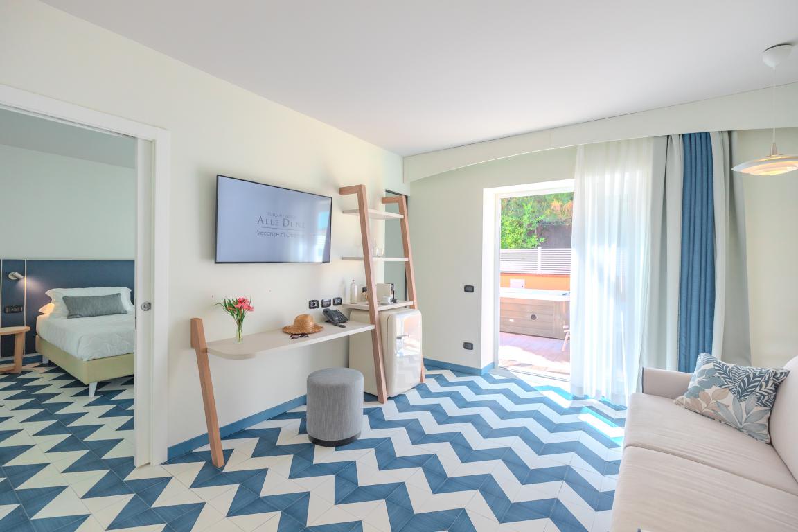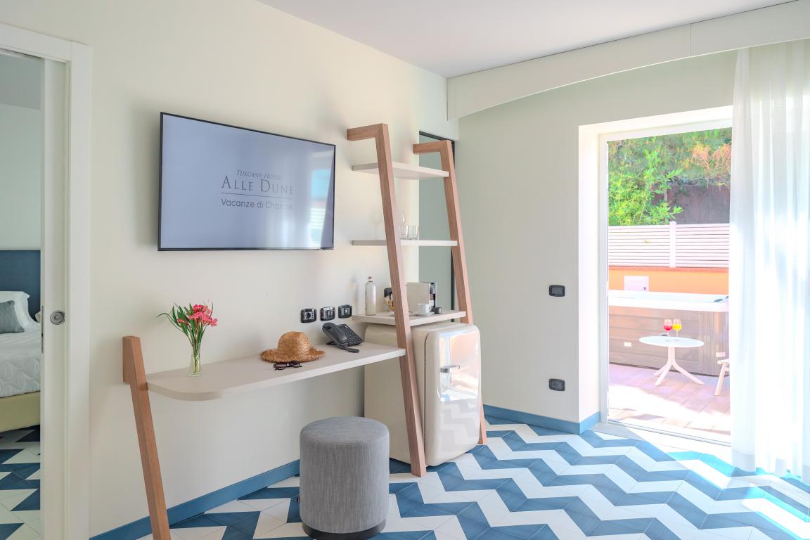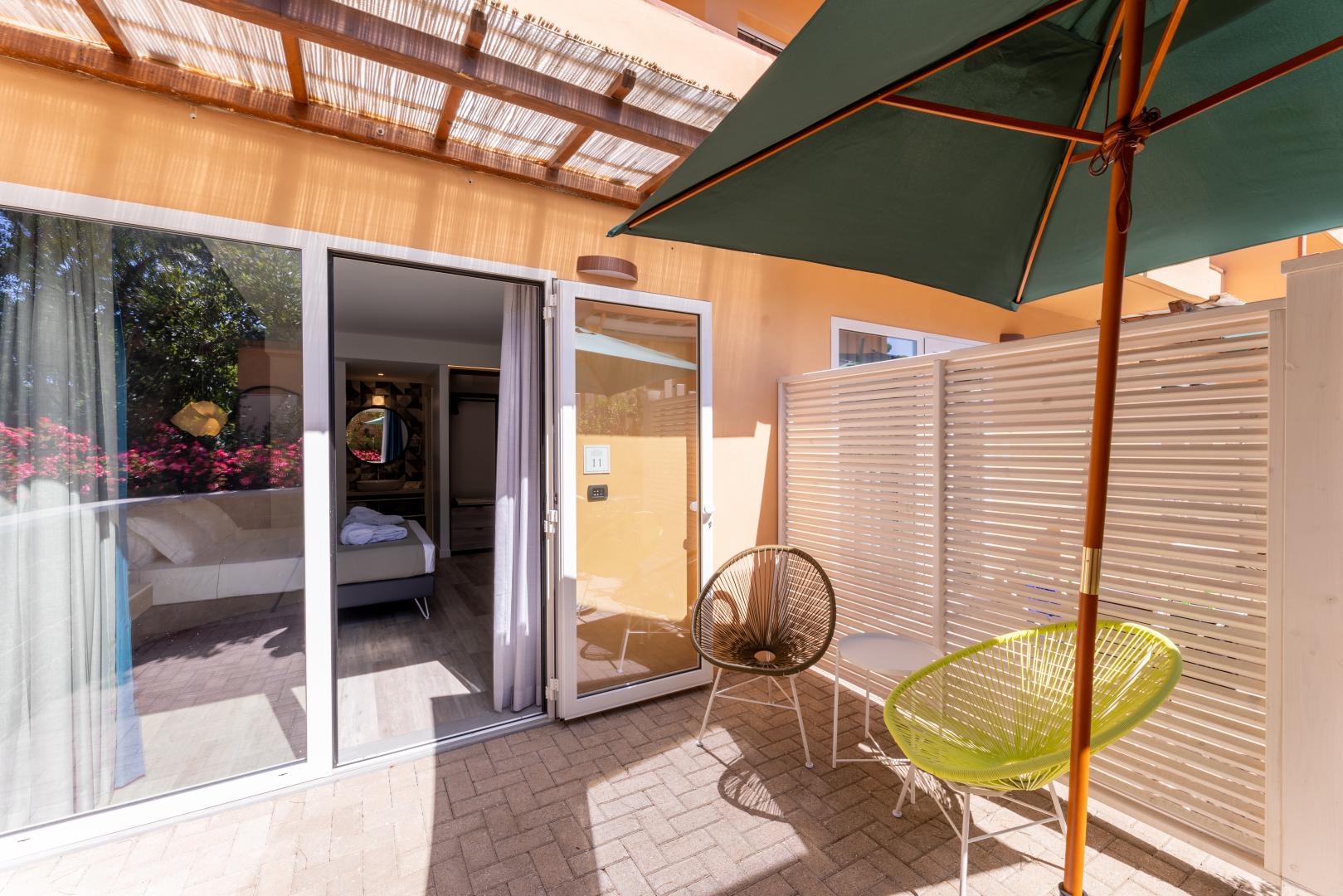 Situata all’interno di Villa Elba al piano rialzato, offre da 35 a 40 mq di spazio con ambienti separati e letto matrimoniale King Size e materasso Dorelan XXL (200x200); dispone di una terrazza privata di 30 mq dove potrai godere dell’idromassaggio ed immergerti nel benessere più totale. Nel prezzo del soggiorno avrai incluso parcheggio auto riservato e nel periodo dal 10.05 al 30.09 un grande gazebo con tre lettini e due poltroncine registe presso la nostra incantevole spiaggia attrezzata “Acacia” di fronte all’Hotel. Fuori dal periodo indicato verrà offerto un ombrellone con due lettini e una poltroncina regista.