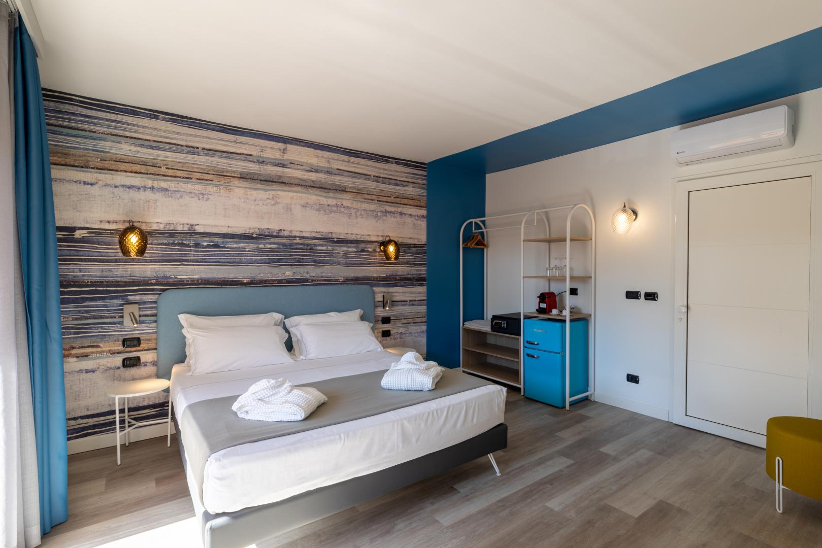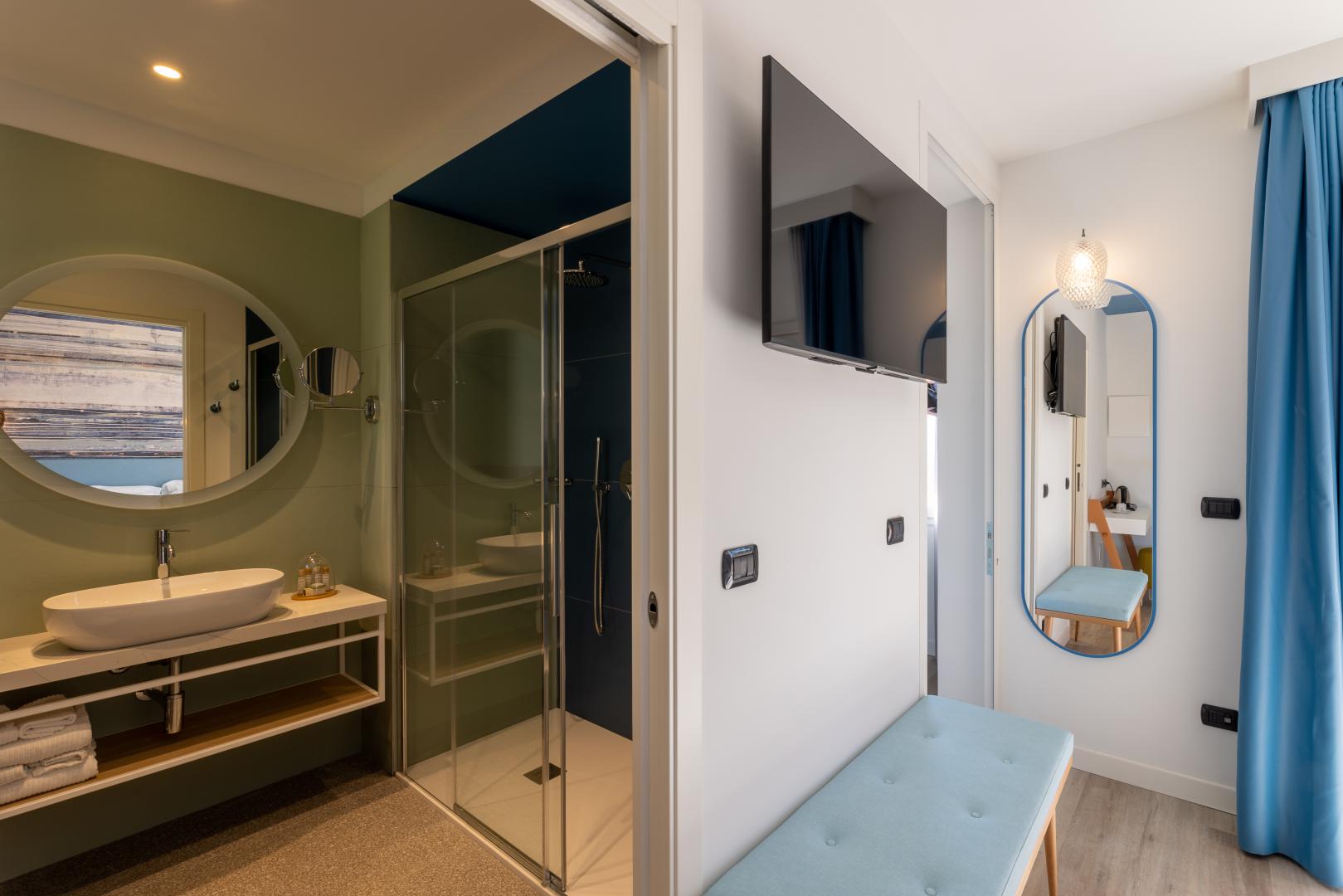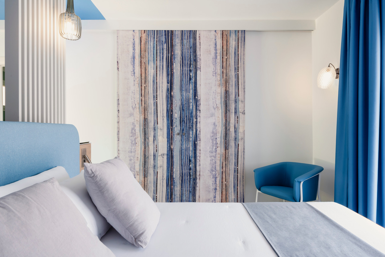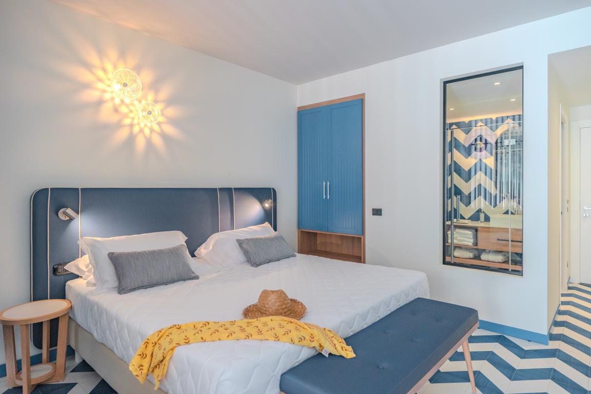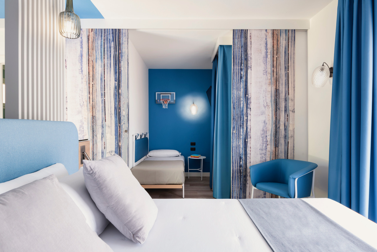 La esclusiva Superb room è stata realizzata nel 2024 dagli architetti dello Studio Bonfante nei colori bianco, blu e azzurro che trasmettono toni vivaci dal sapore mediterraneo.