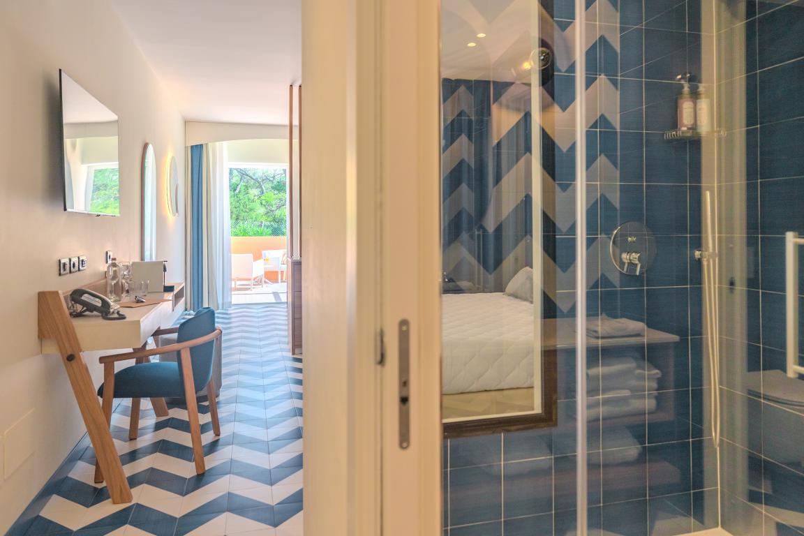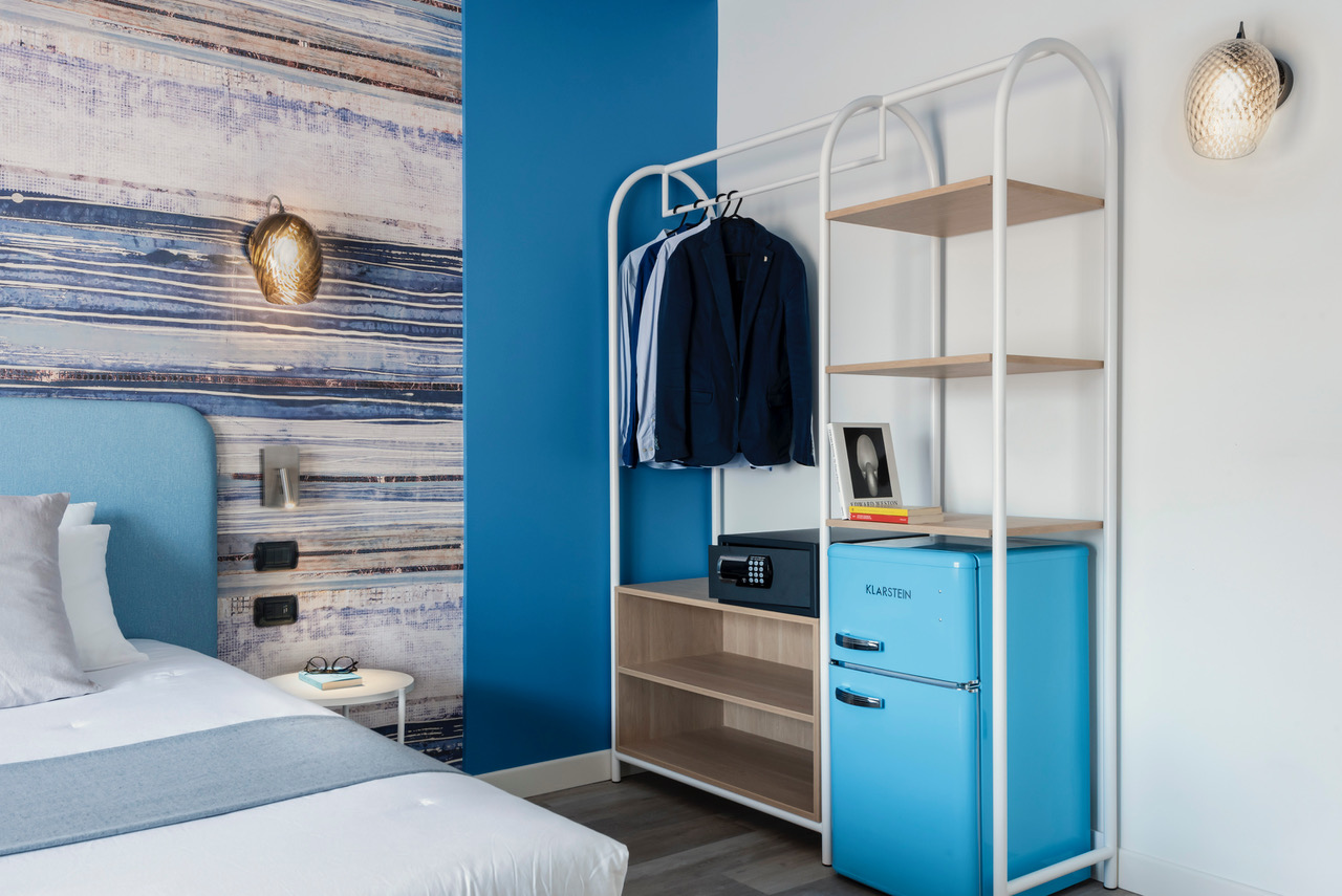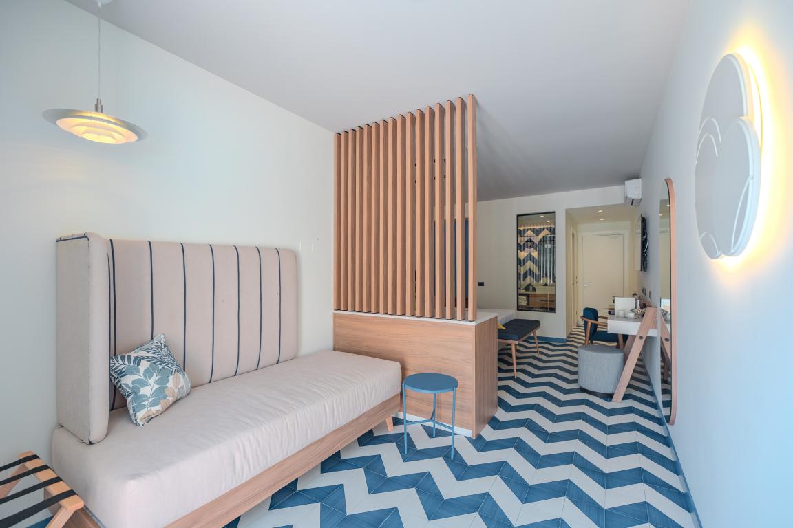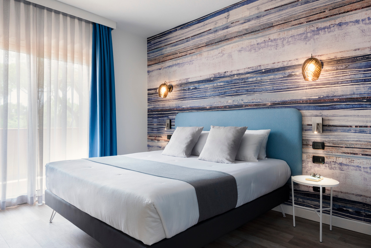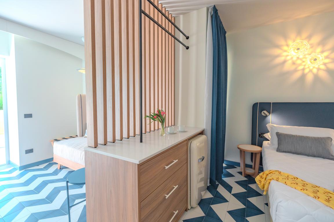 La esclusiva Superb room è stata realizzata nel 2024 dagli architetti dello Studio Bonfante nei colori bianco, blu e azzurro che trasmettono toni vivaci dal sapore mediterraneo.