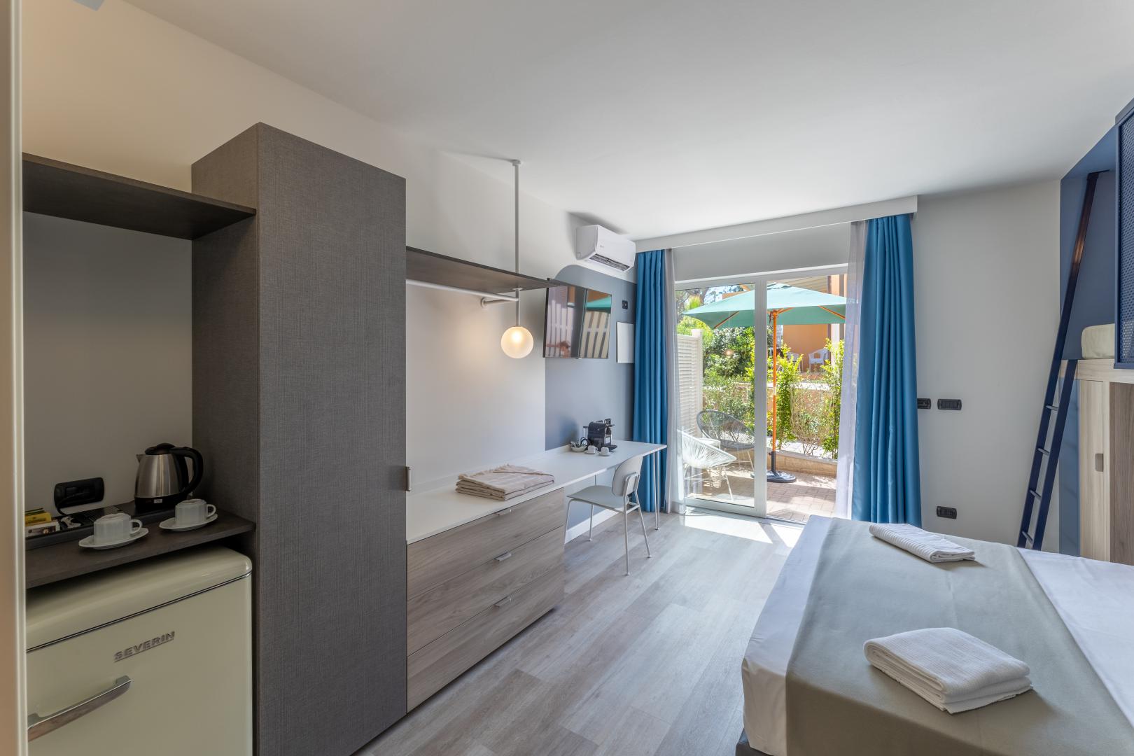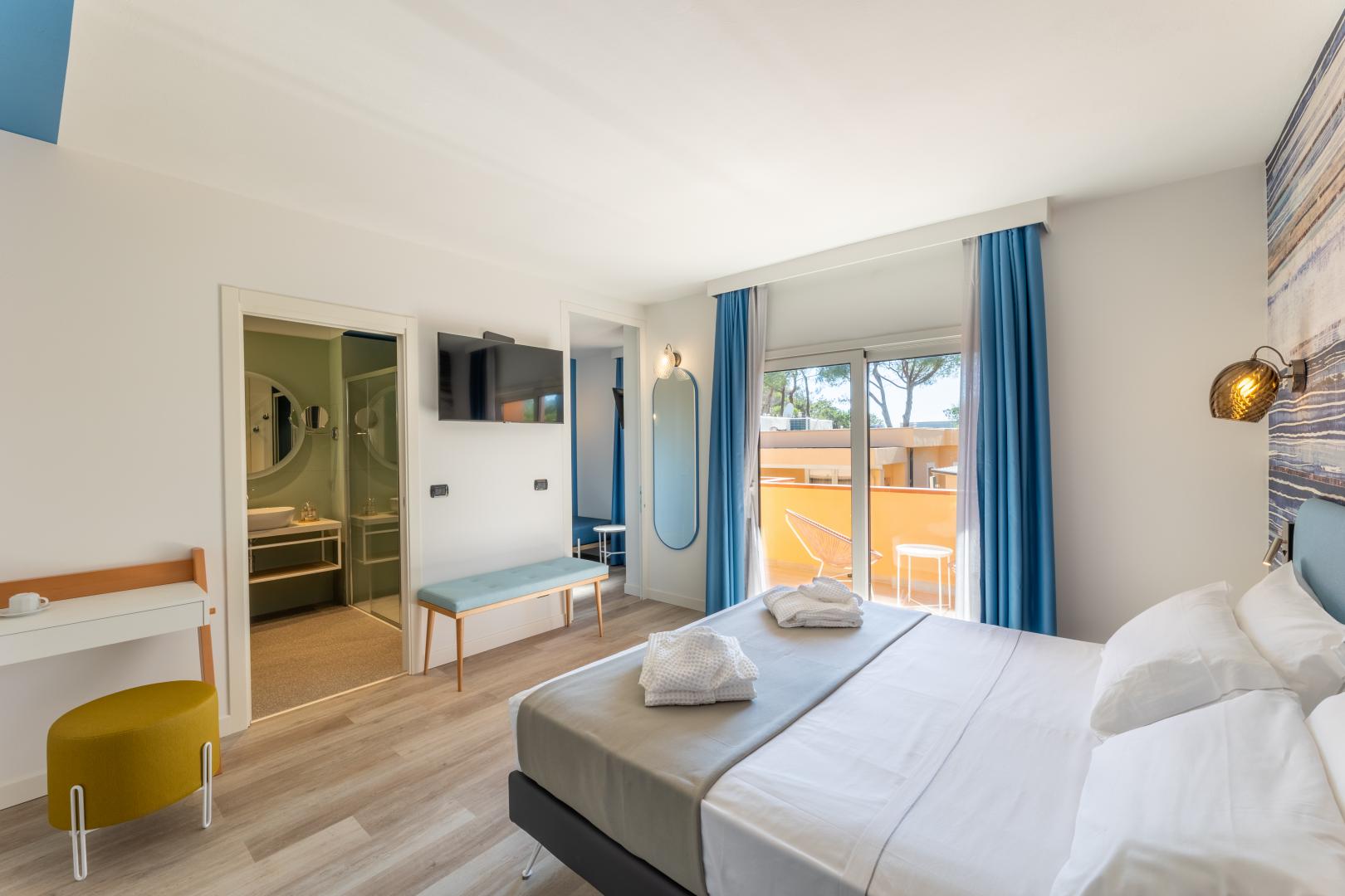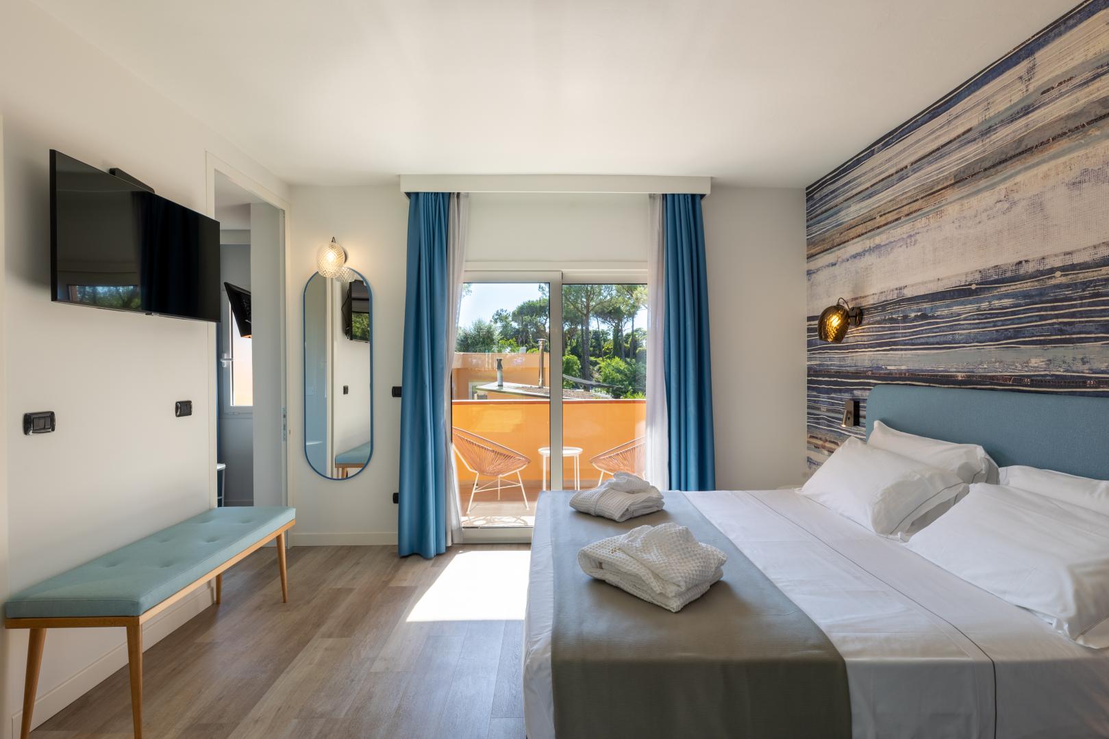 Di recentissima realizzazione, è stata progettata dagli architetti dello Studio Bonfante e dunque ricca di dettagli contemporanei. Dispone di un ampio bagno e divano letto singolo in una camera separata, è allestita con letto matrimoniale King Size con materasso Dorelan (180X200). Nel prezzo del soggiorno avrai incluso parcheggio auto riservato e nel periodo dal 10.05 al 30.09 un grande gazebo con tre lettini e due poltroncine registe presso la nostra incantevole spiaggia attrezzata “Acacia” di fronte all’Hotel. Fuori dal periodo indicato verrà offerto un ombrellone con due lettini e una poltroncina regista.