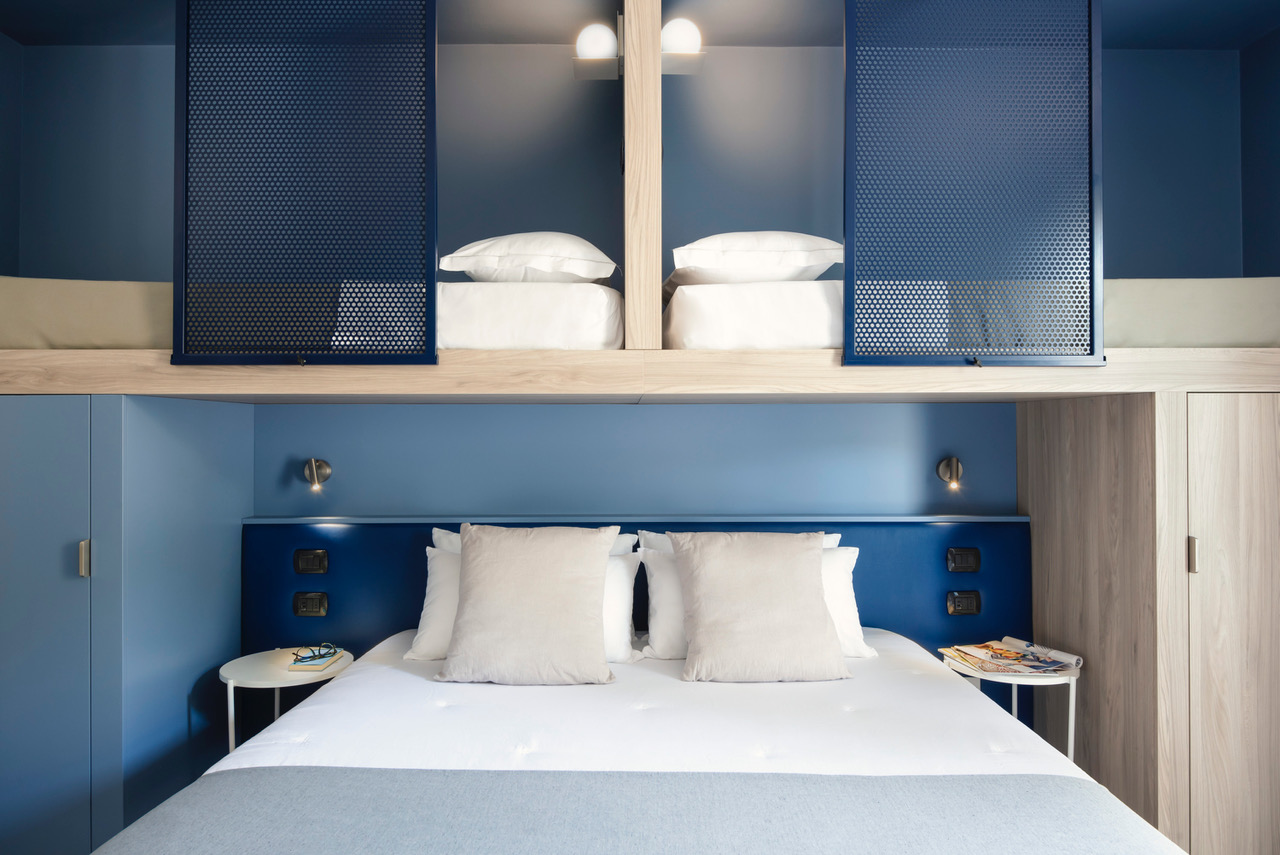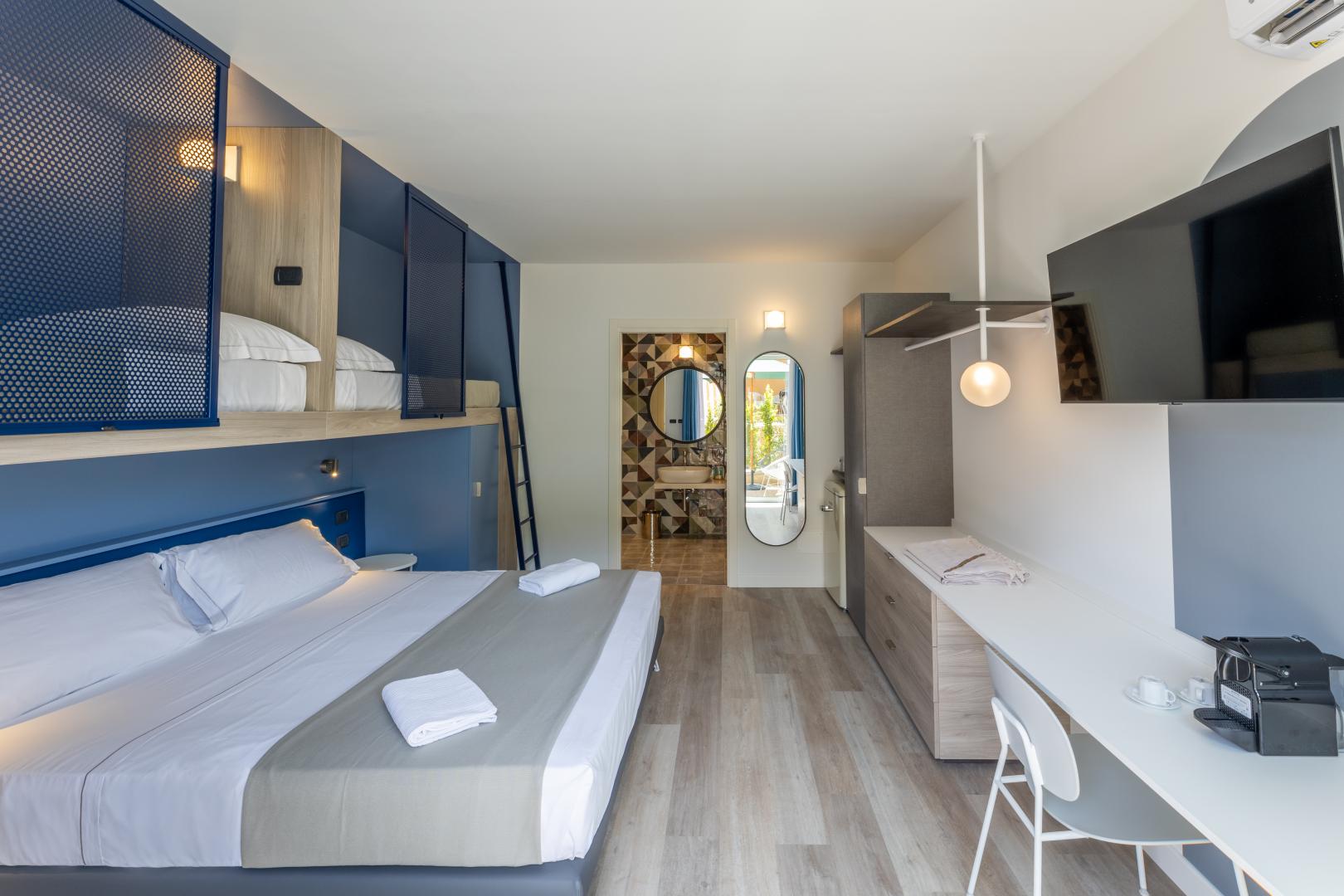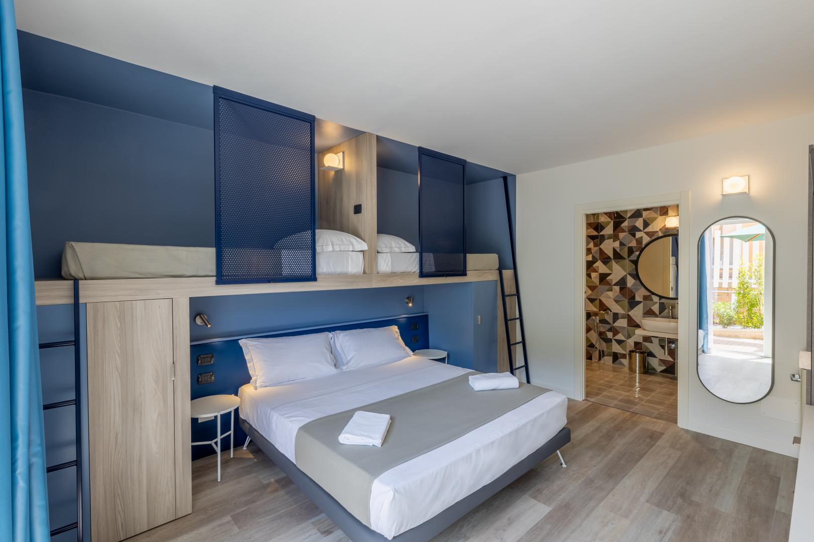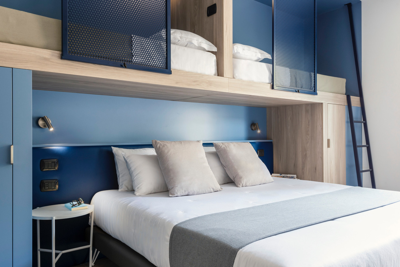 La camera è allestita con un letto matrimoniale King Size e materasso Dorelan (180x200) e un pratico letto a ponte per i bambini che ottimizza i movimenti e l’accessibilità.