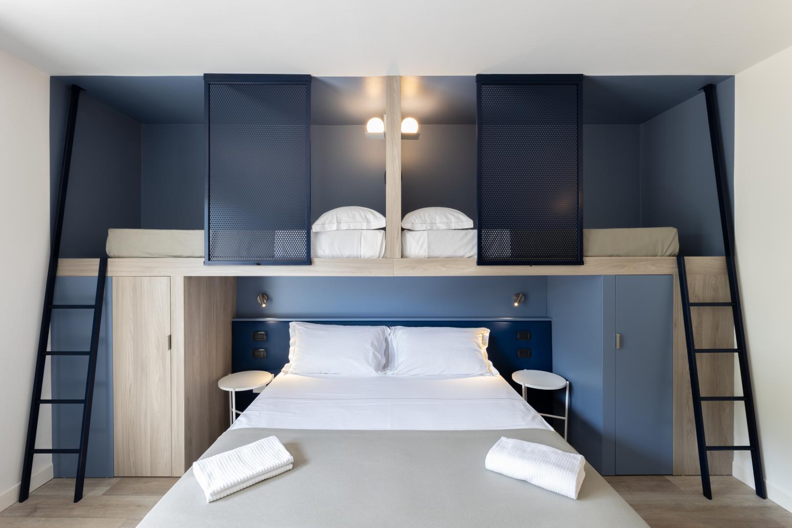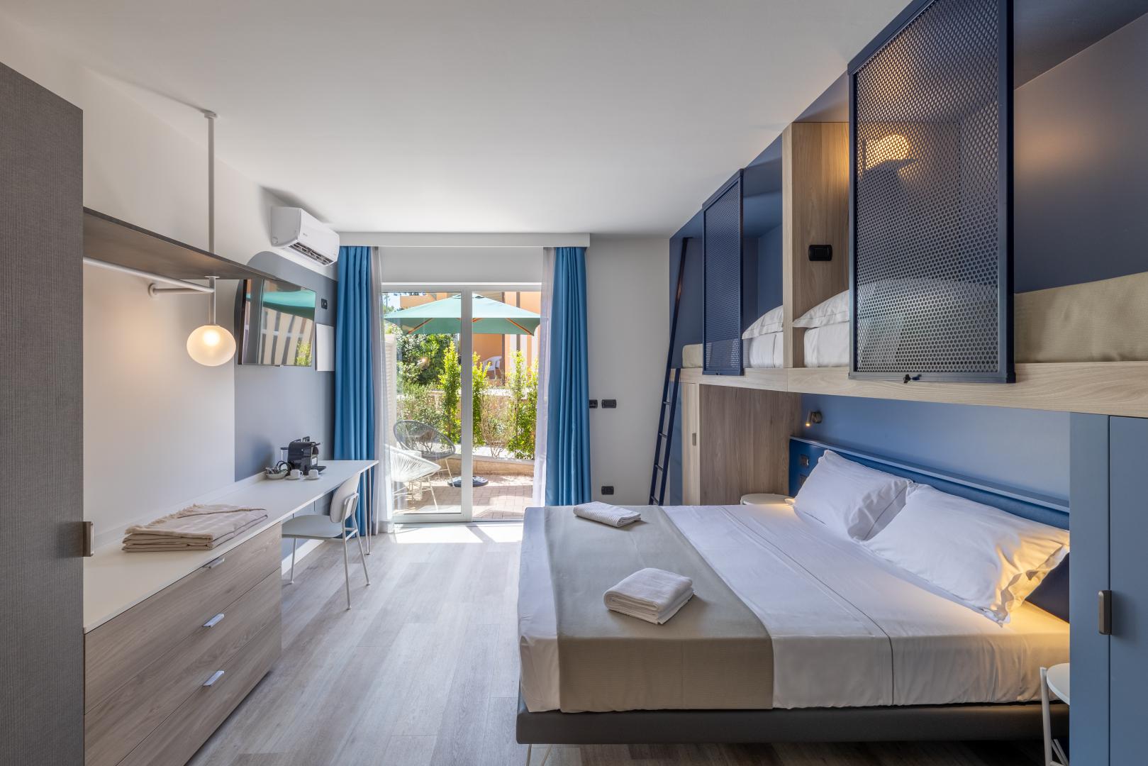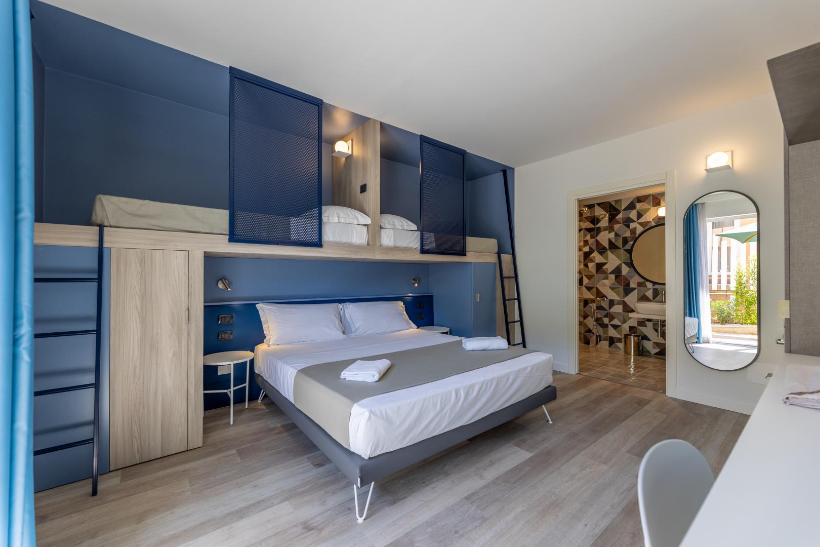 La camera è allestita con un letto matrimoniale King Size e materasso Dorelan (180x200) e un pratico letto a ponte per i bambini che ottimizza i movimenti e l’accessibilità.