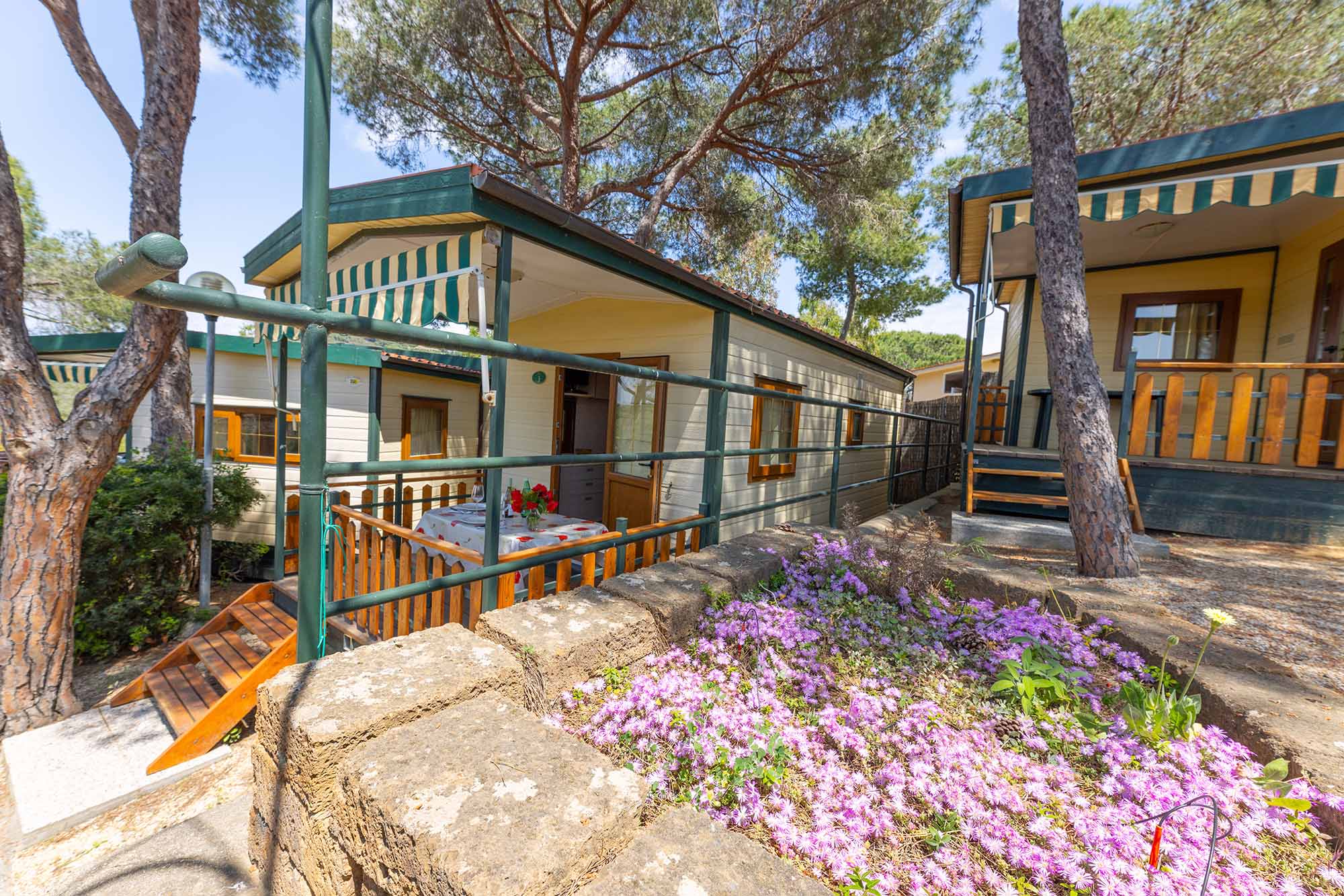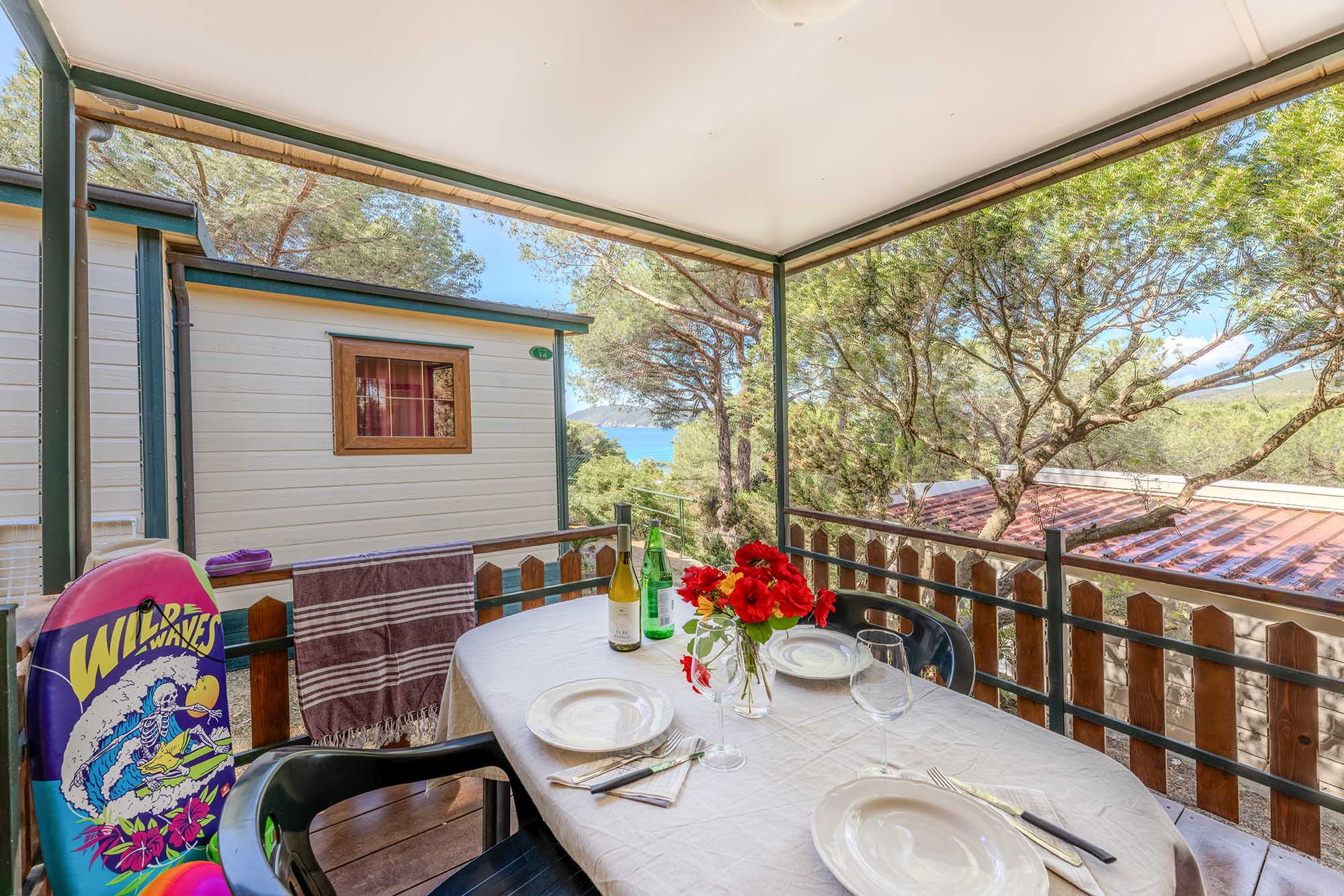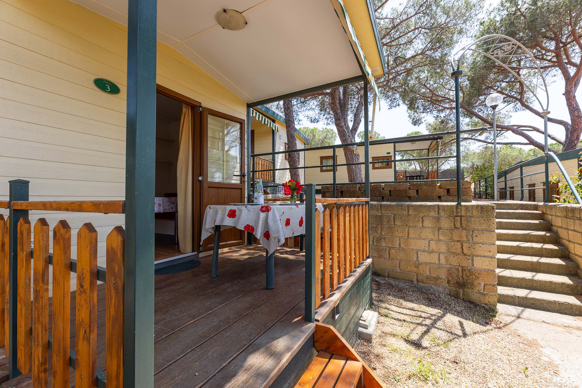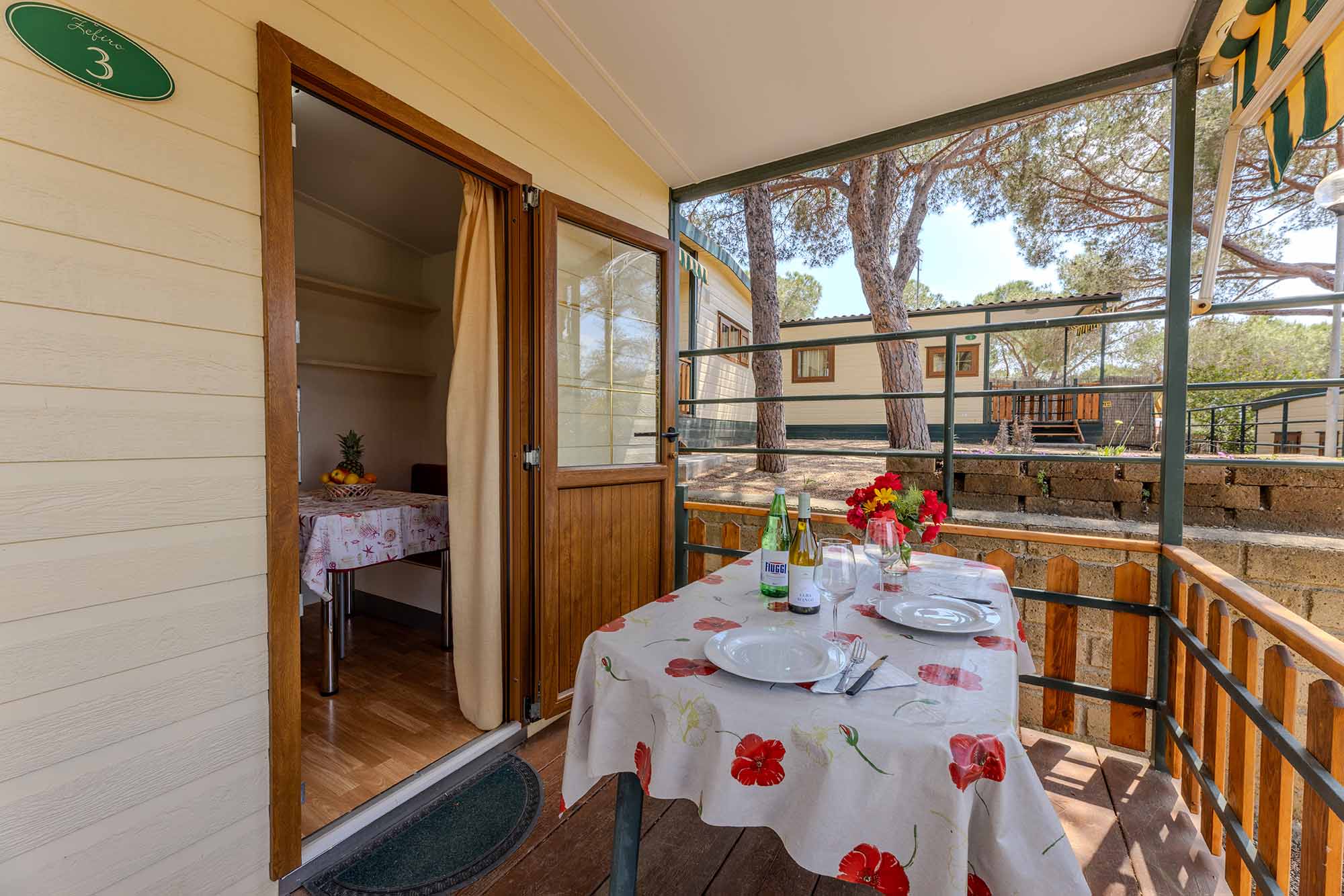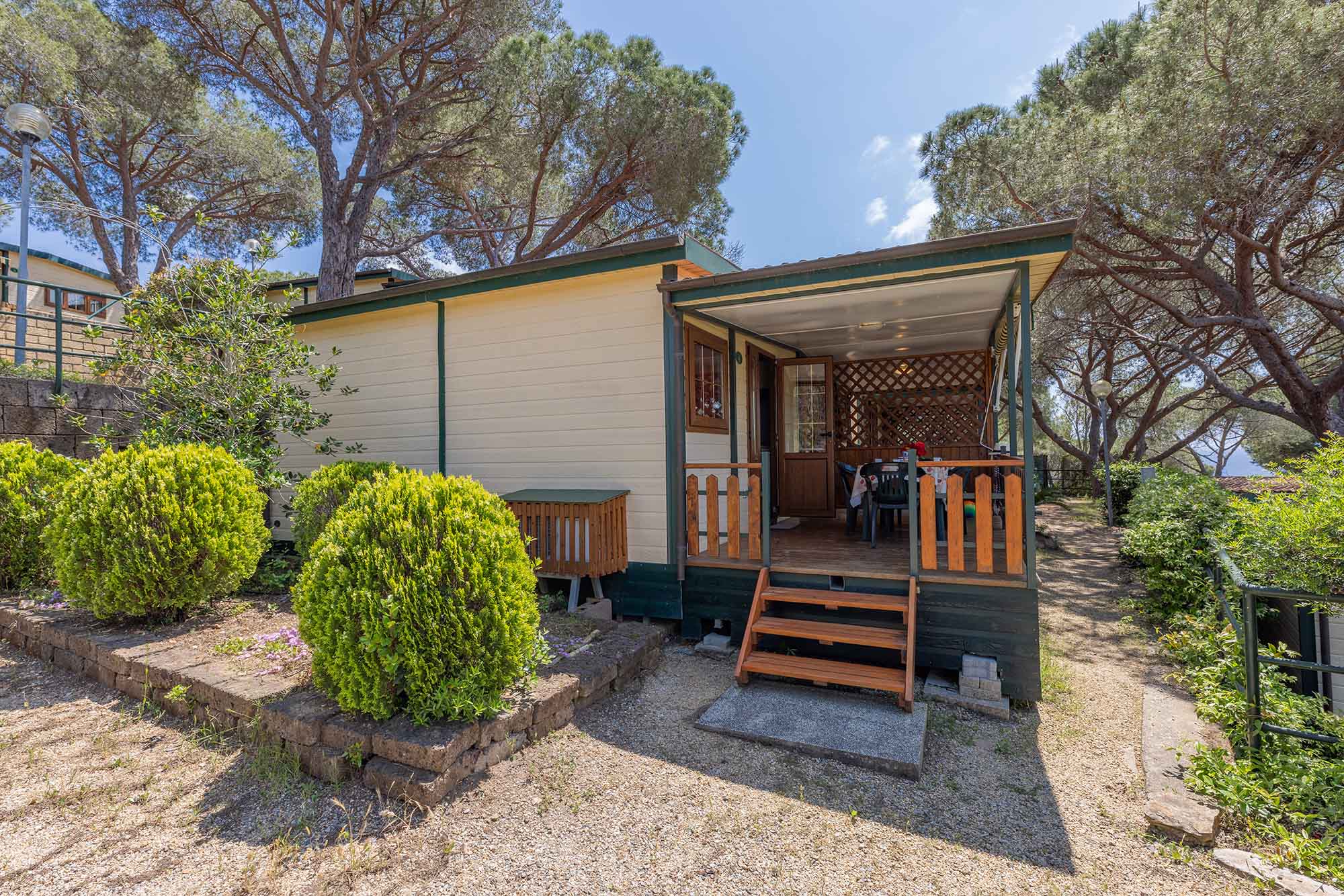 Bungalow trilocale composto da un soggiorno con angolo cottura, una camera matrimoniale e una camera con due letti singoli, bagno con doccia, aria condizionata, TV-sat e una veranda attrezzata dove potete trascorrere le vostre serate in tranquillità.
