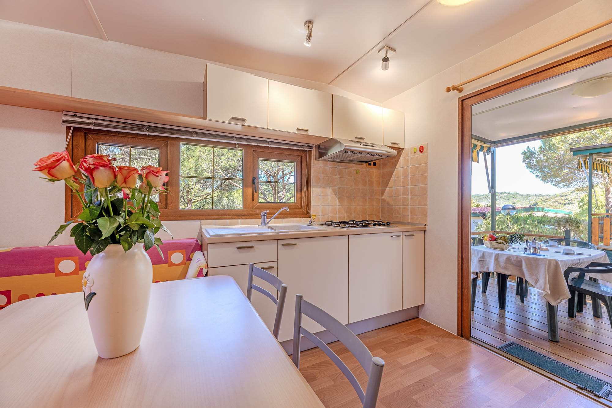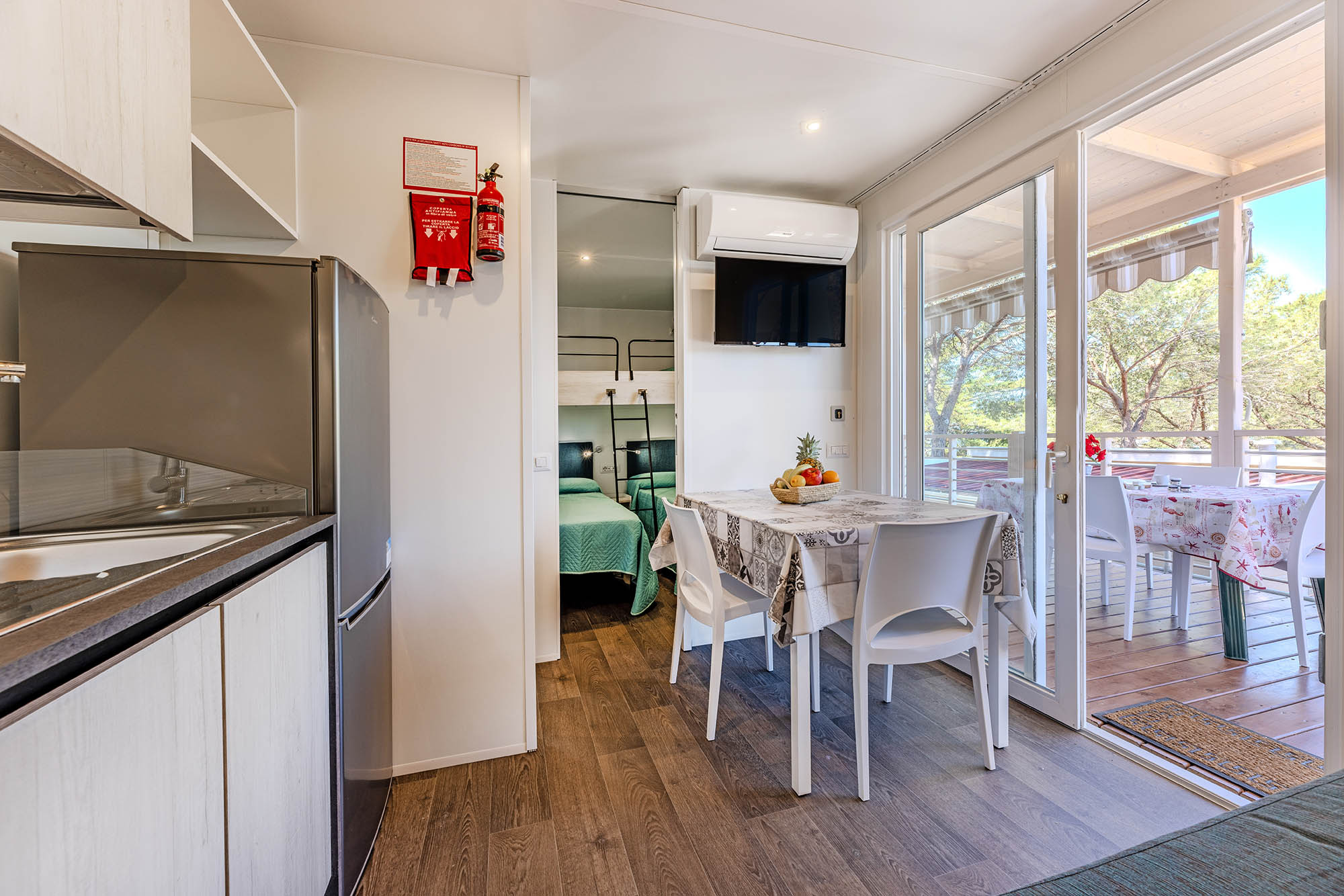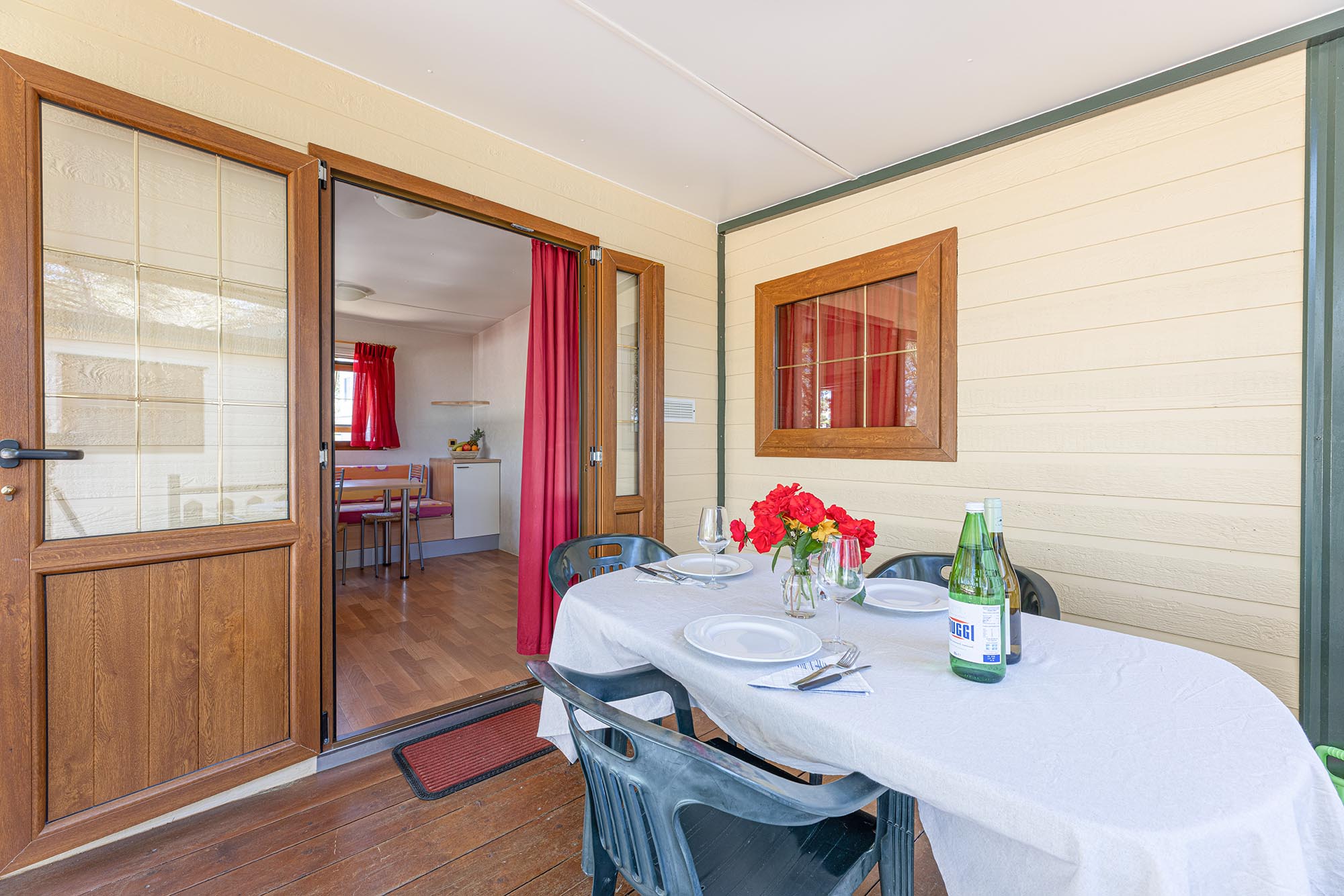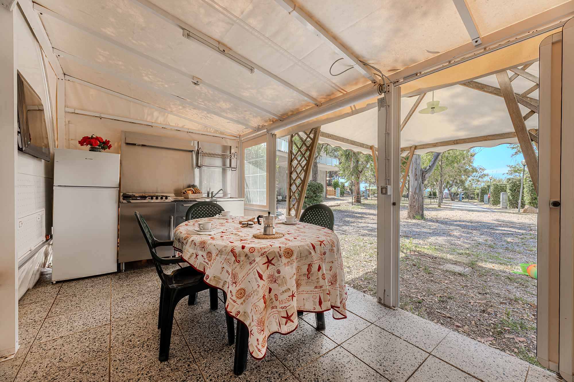 Bungalow trilocale composto da un soggiorno con angolo cottura, una camera matrimoniale e una camera con due letti singoli, bagno con doccia, aria condizionata, TV-sat e una veranda attrezzata dove potete trascorrere le vostre serate in tranquillità.