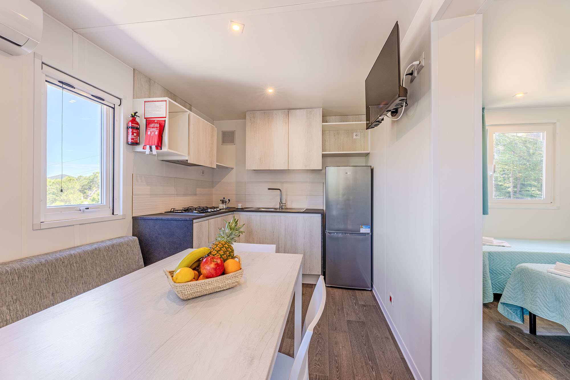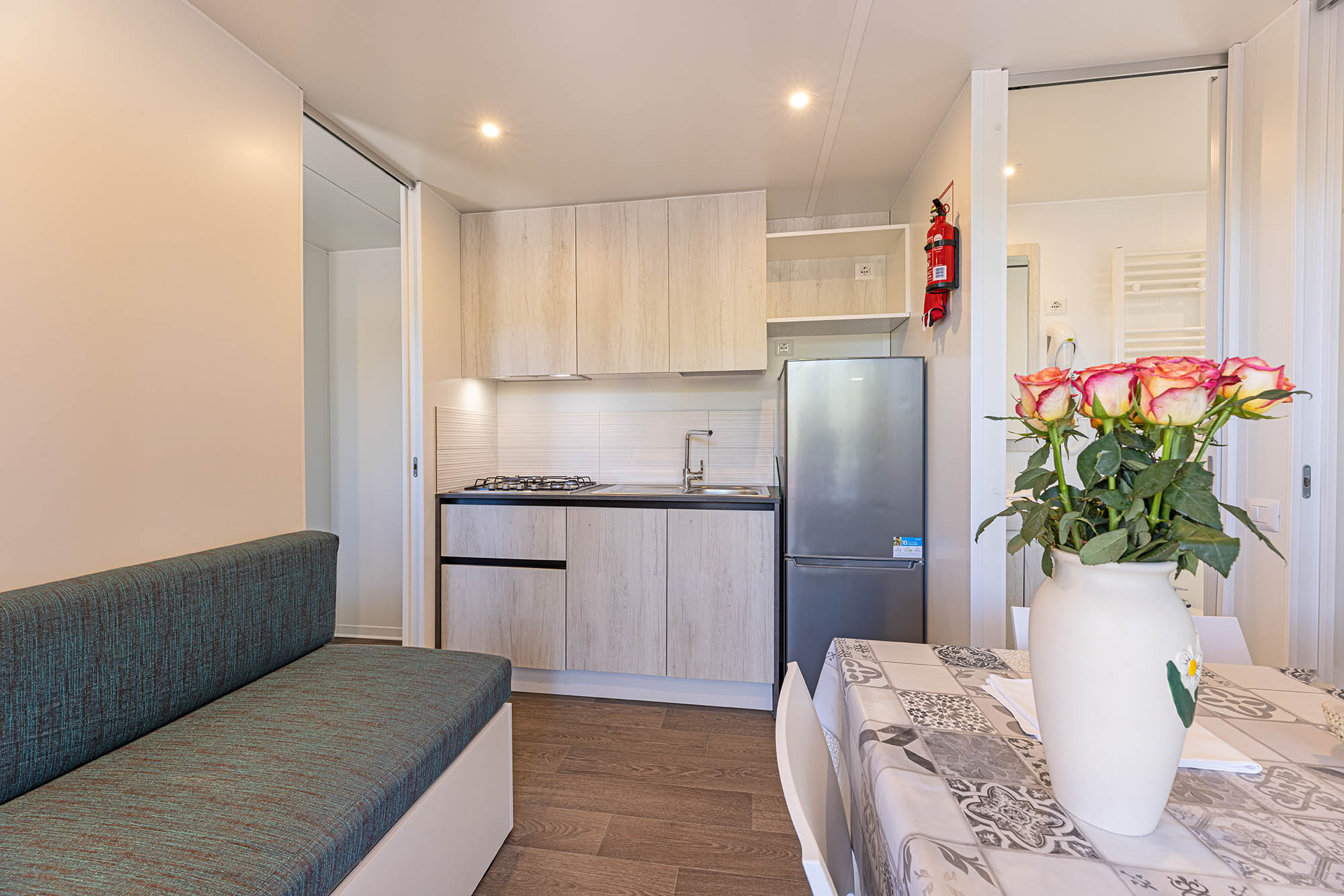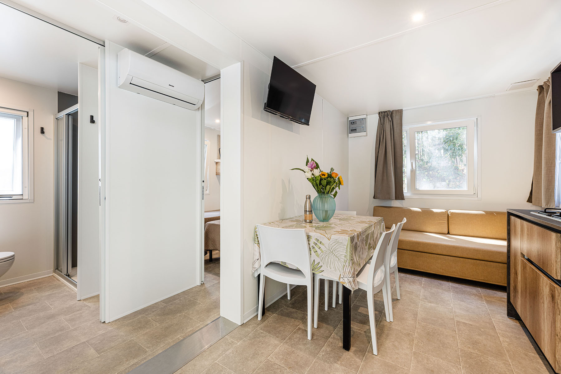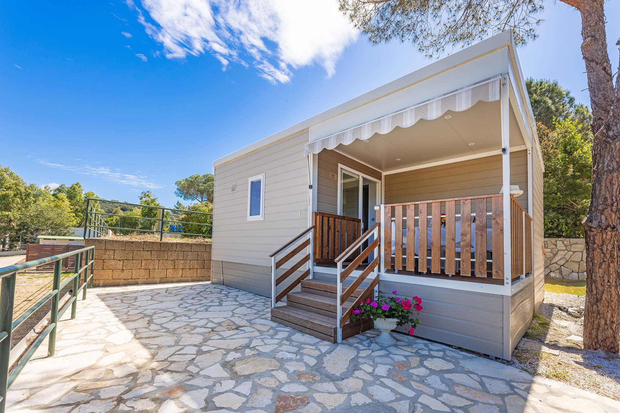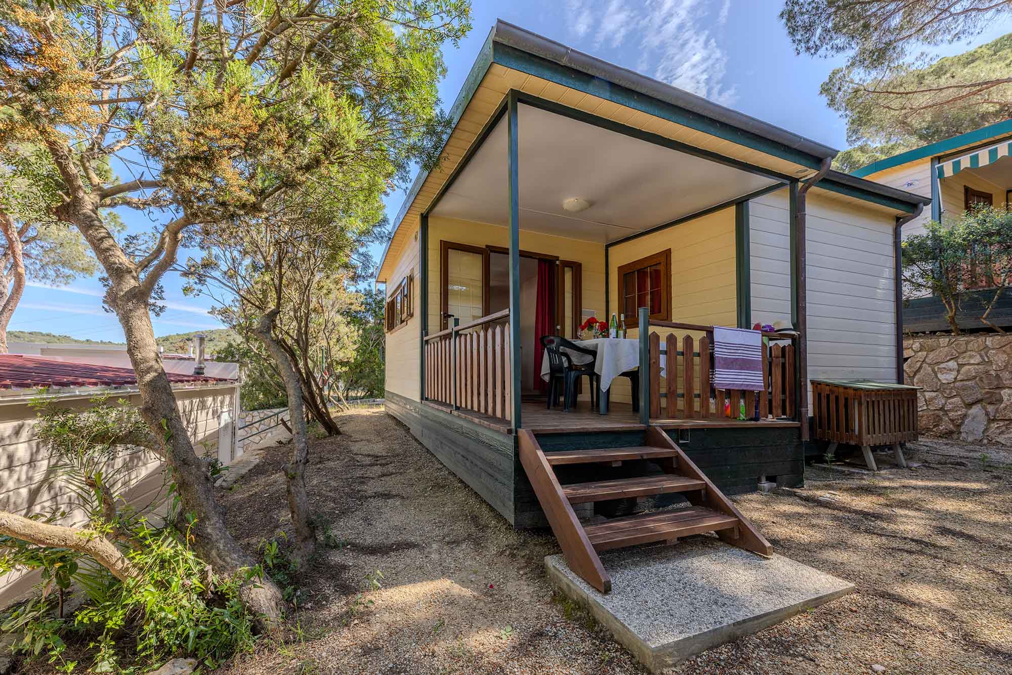 Bungalow trilocale composto da un soggiorno con angolo cottura, una camera matrimoniale e una camera con due letti singoli, bagno con doccia, aria condizionata, TV-sat e una veranda attrezzata dove potete trascorrere le vostre serate in tranquillità.