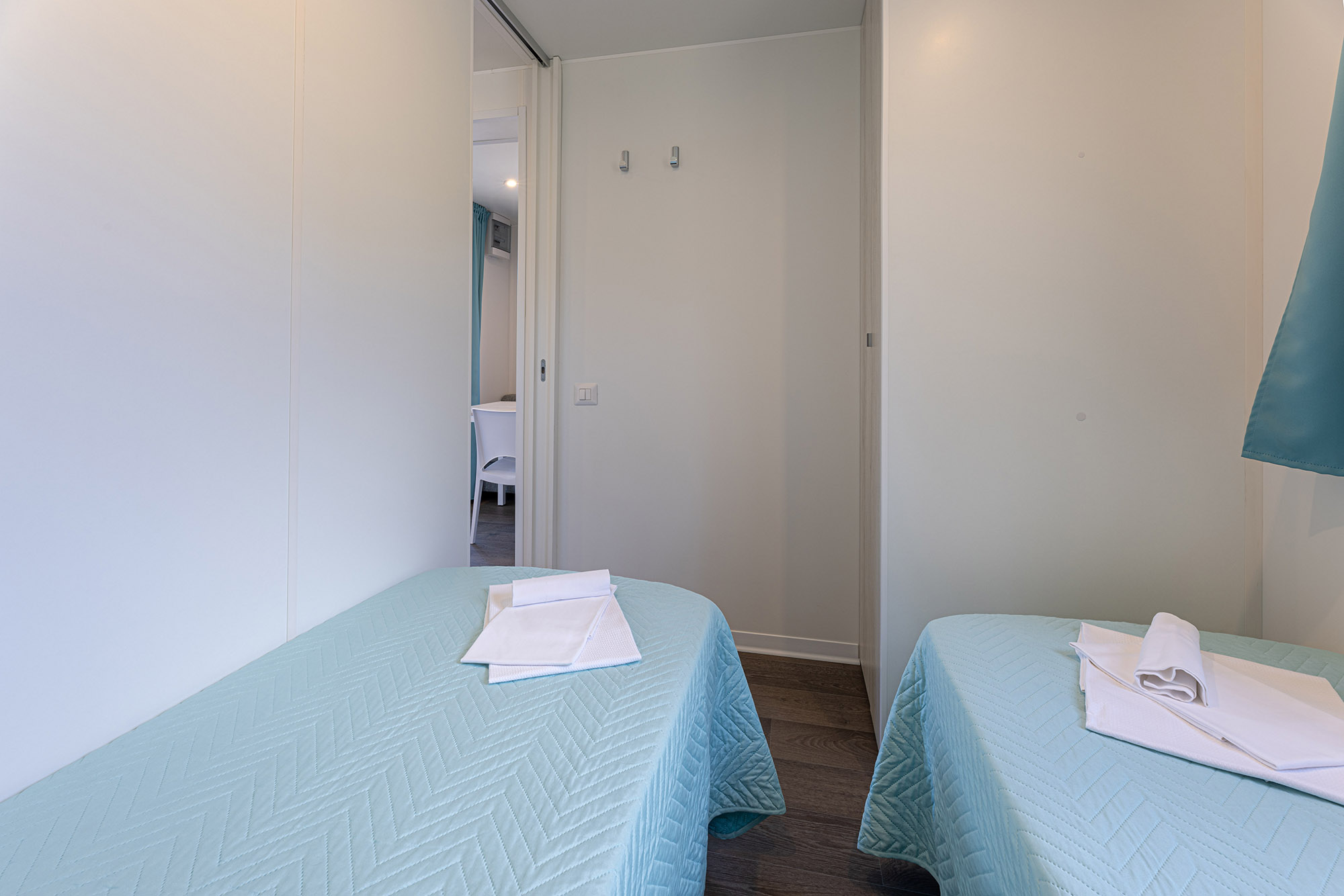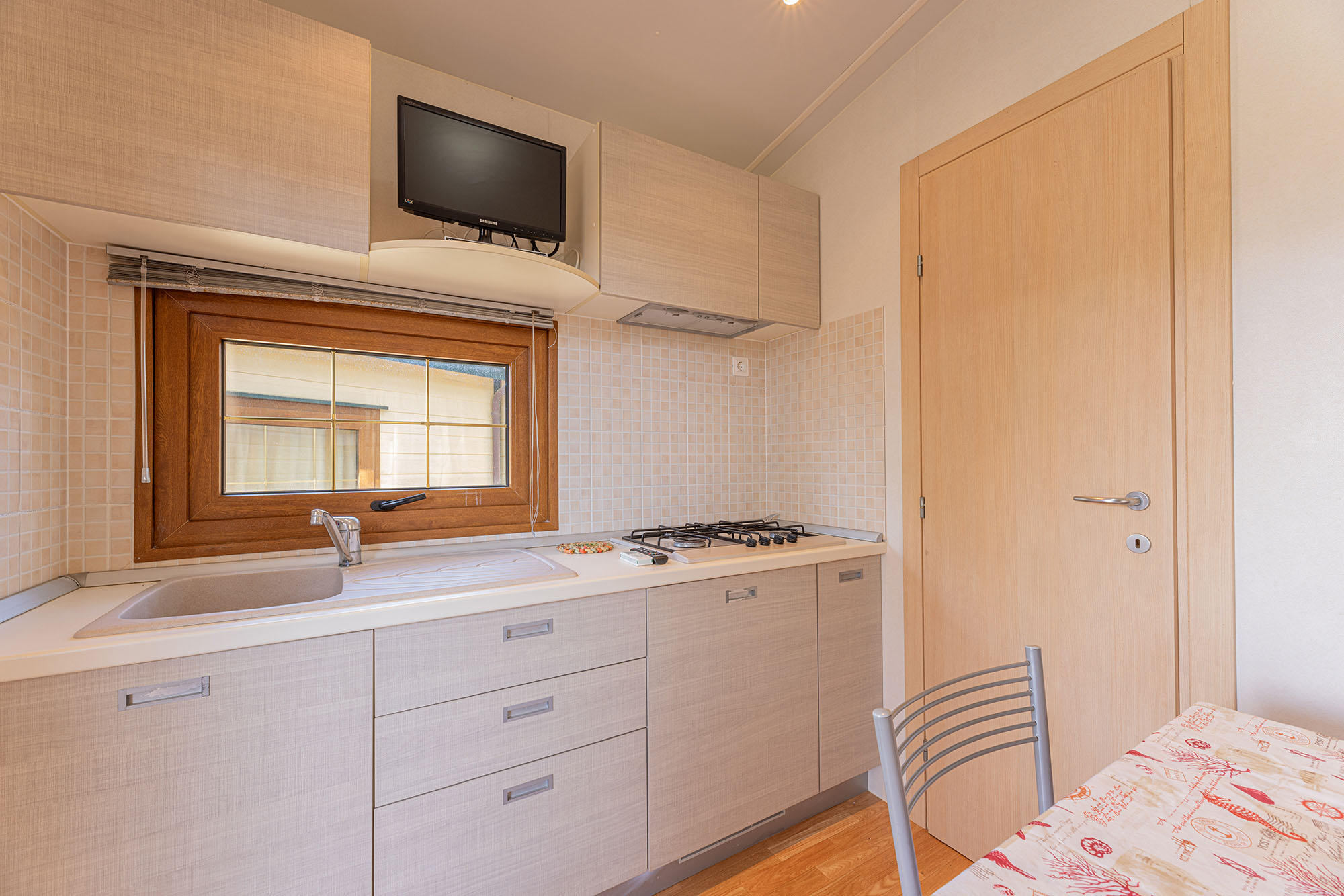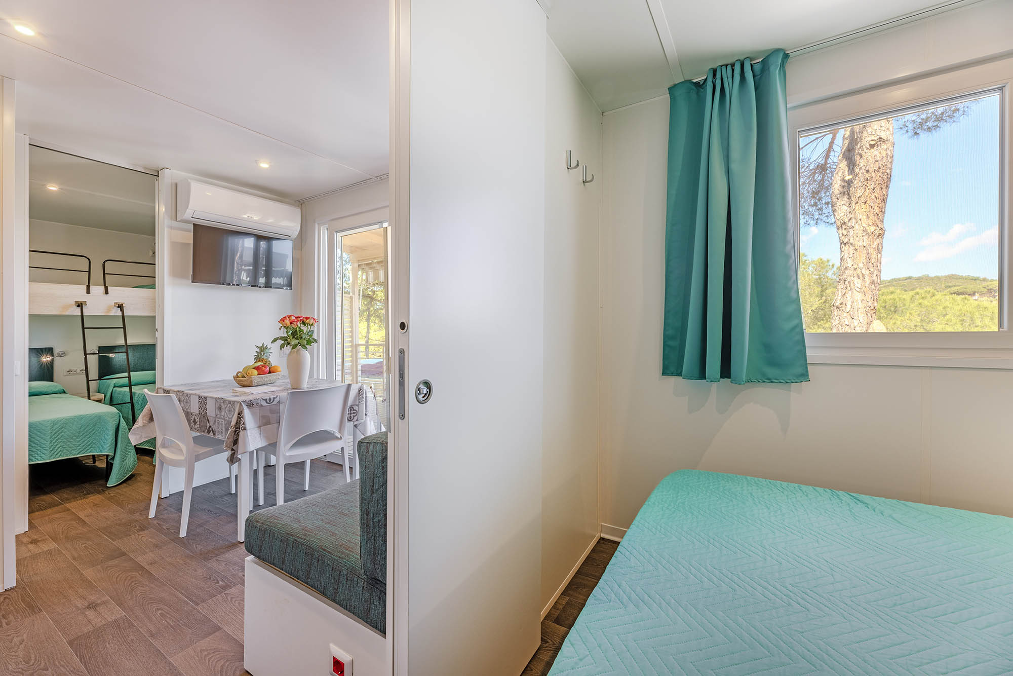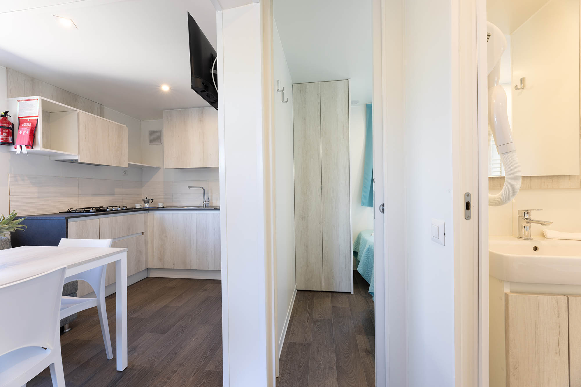 Bungalow trilocale composto da un soggiorno con angolo cottura, una camera matrimoniale e una camera con due letti singoli, bagno con doccia, aria condizionata, TV-sat e una veranda attrezzata dove potete trascorrere le vostre serate in tranquillità.