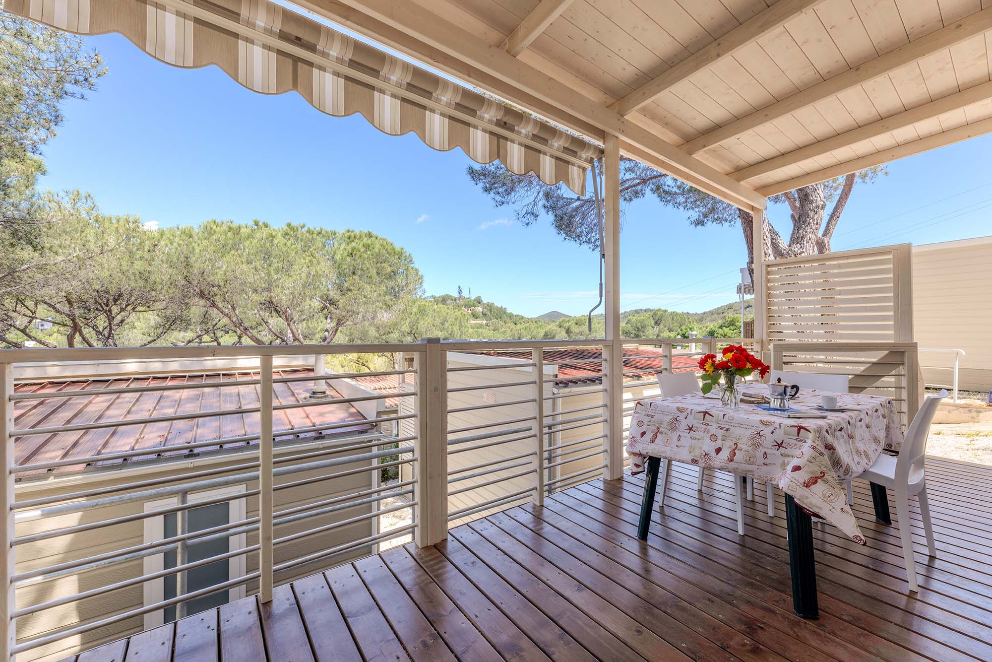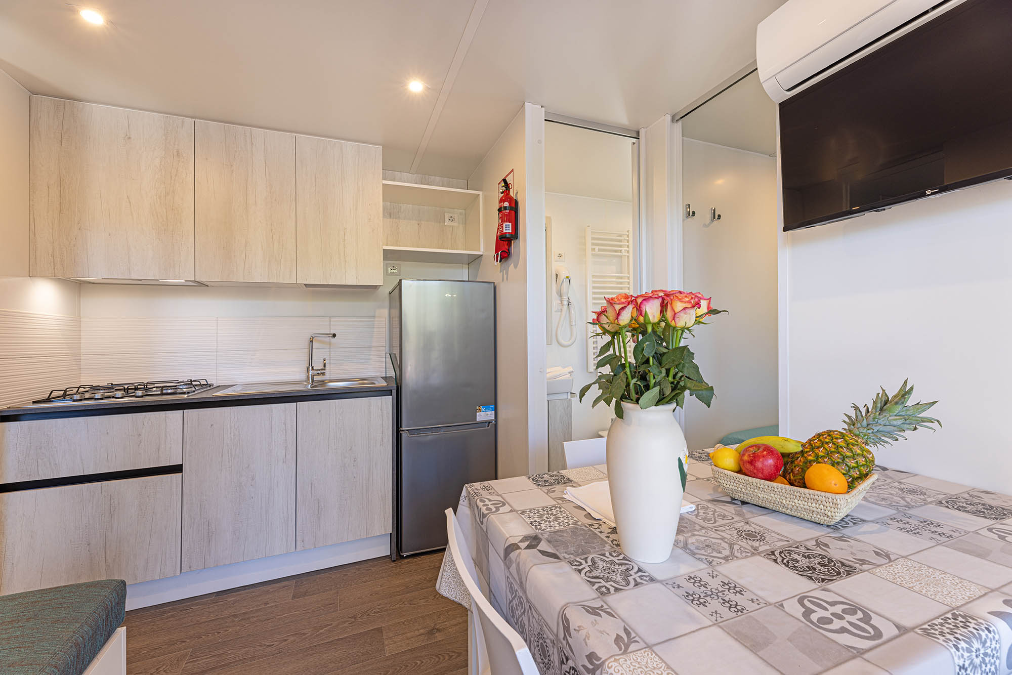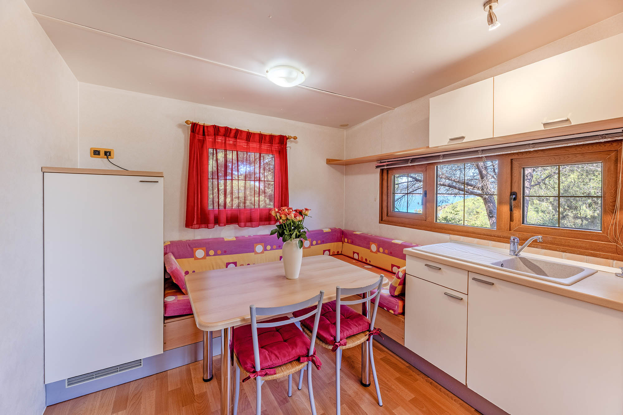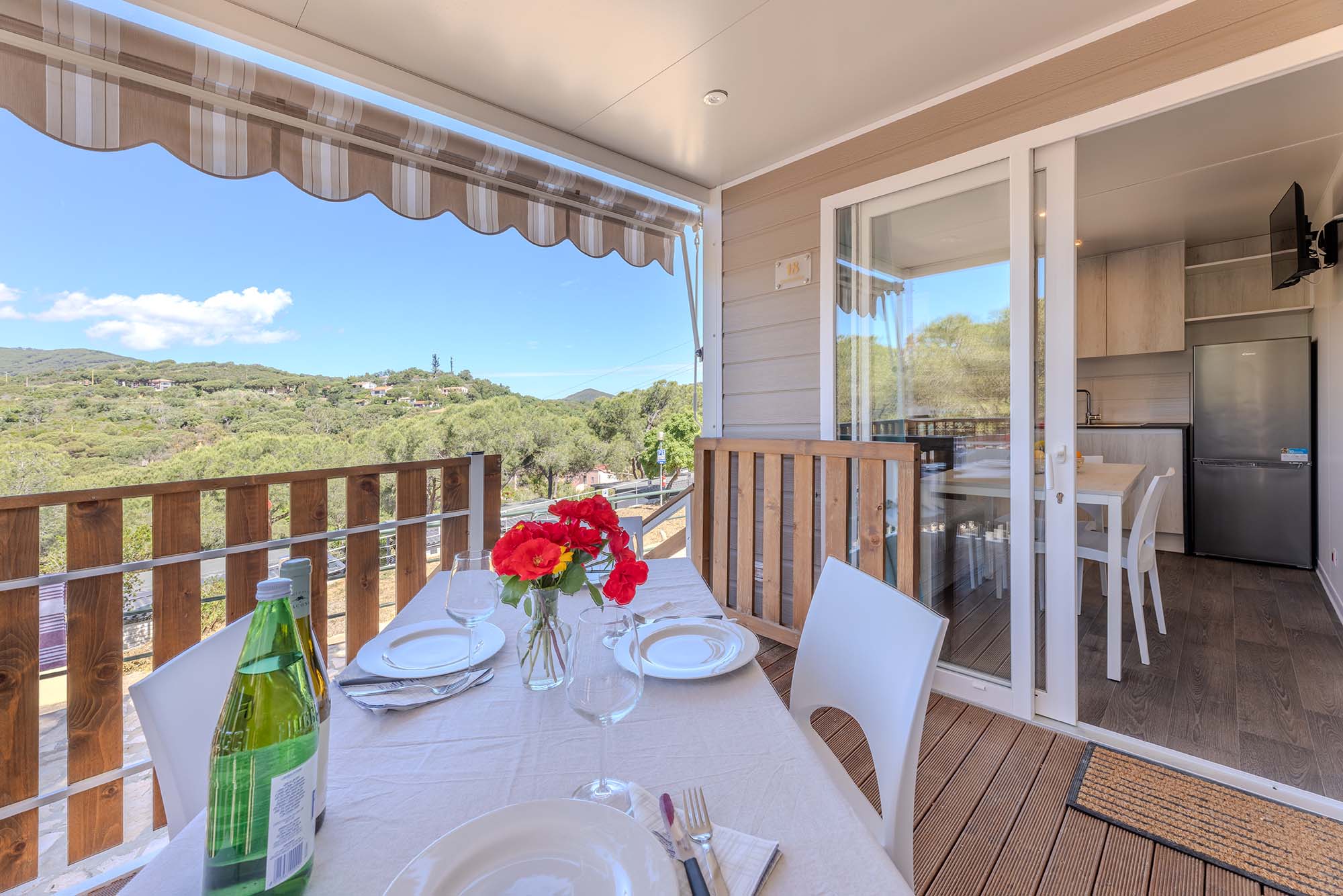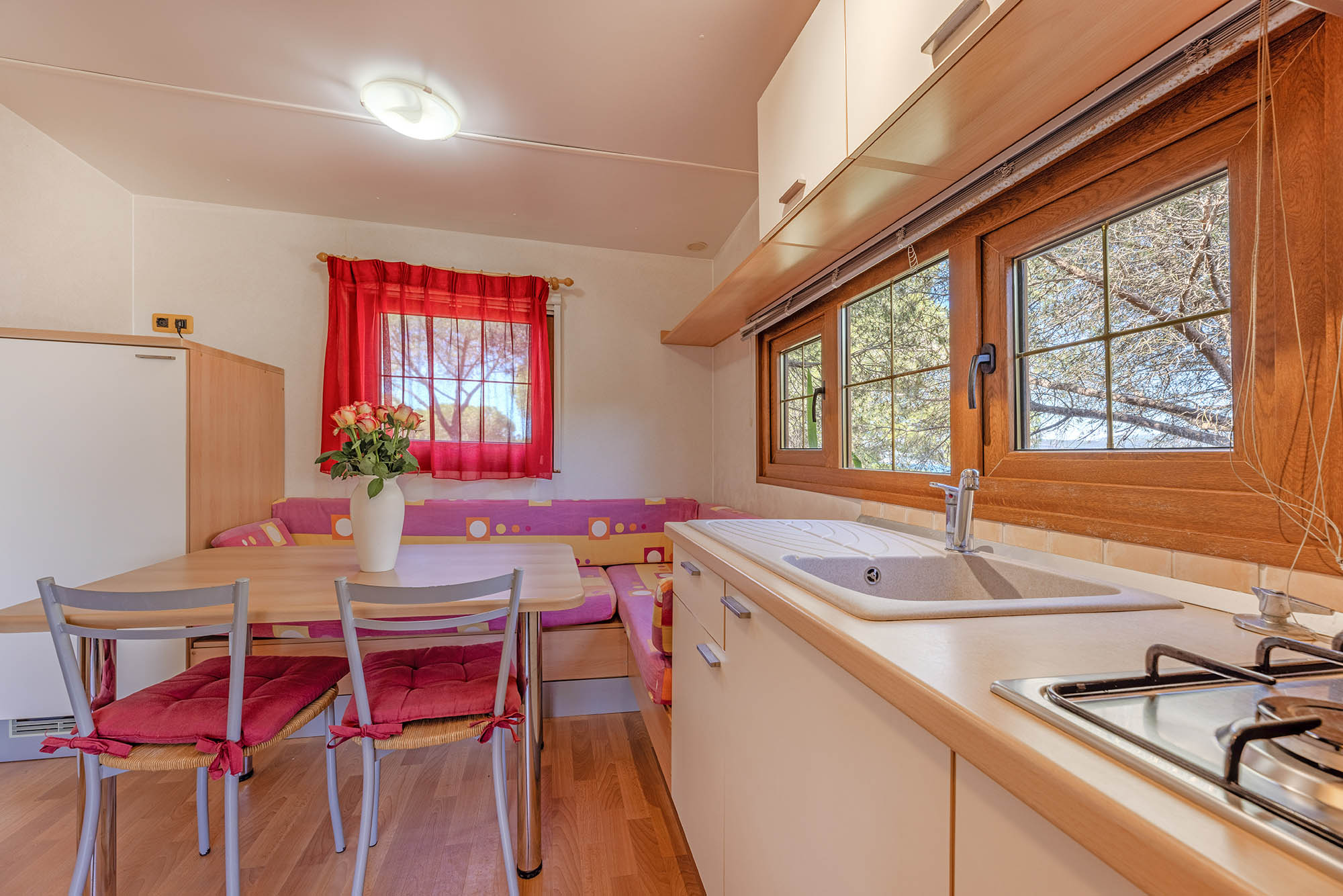 Bungalow trilocale composto da un soggiorno con angolo cottura, una camera matrimoniale e una camera con due letti singoli, bagno con doccia, aria condizionata, TV-sat e una veranda attrezzata dove potete trascorrere le vostre serate in tranquillità.