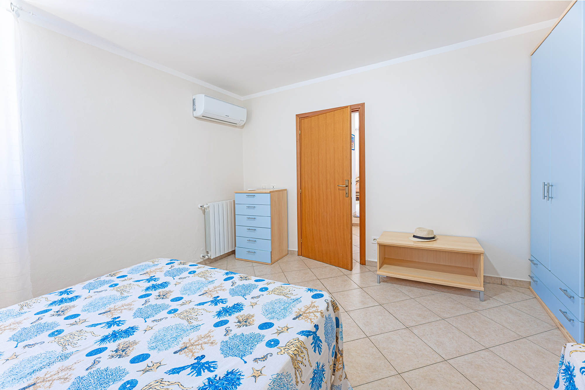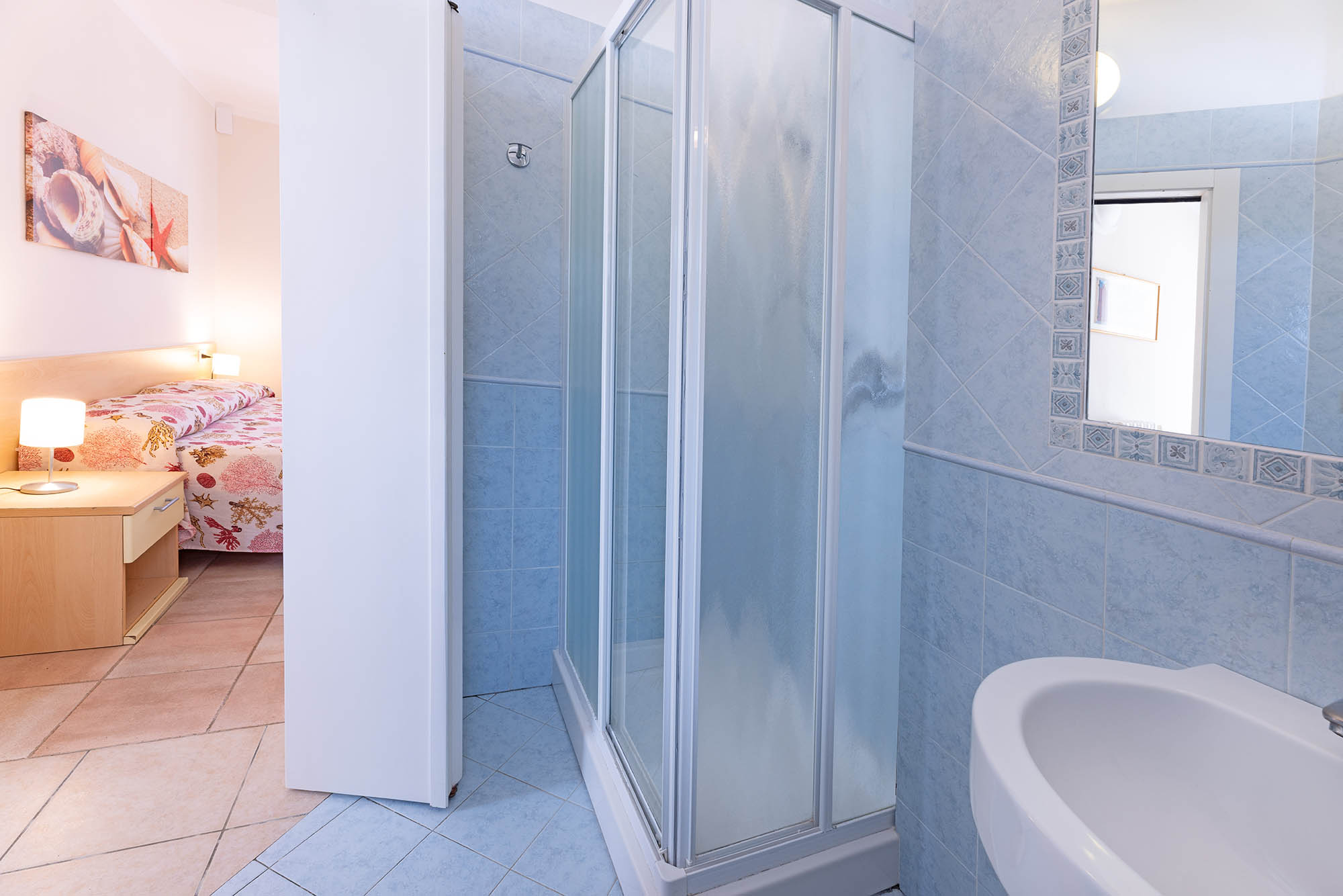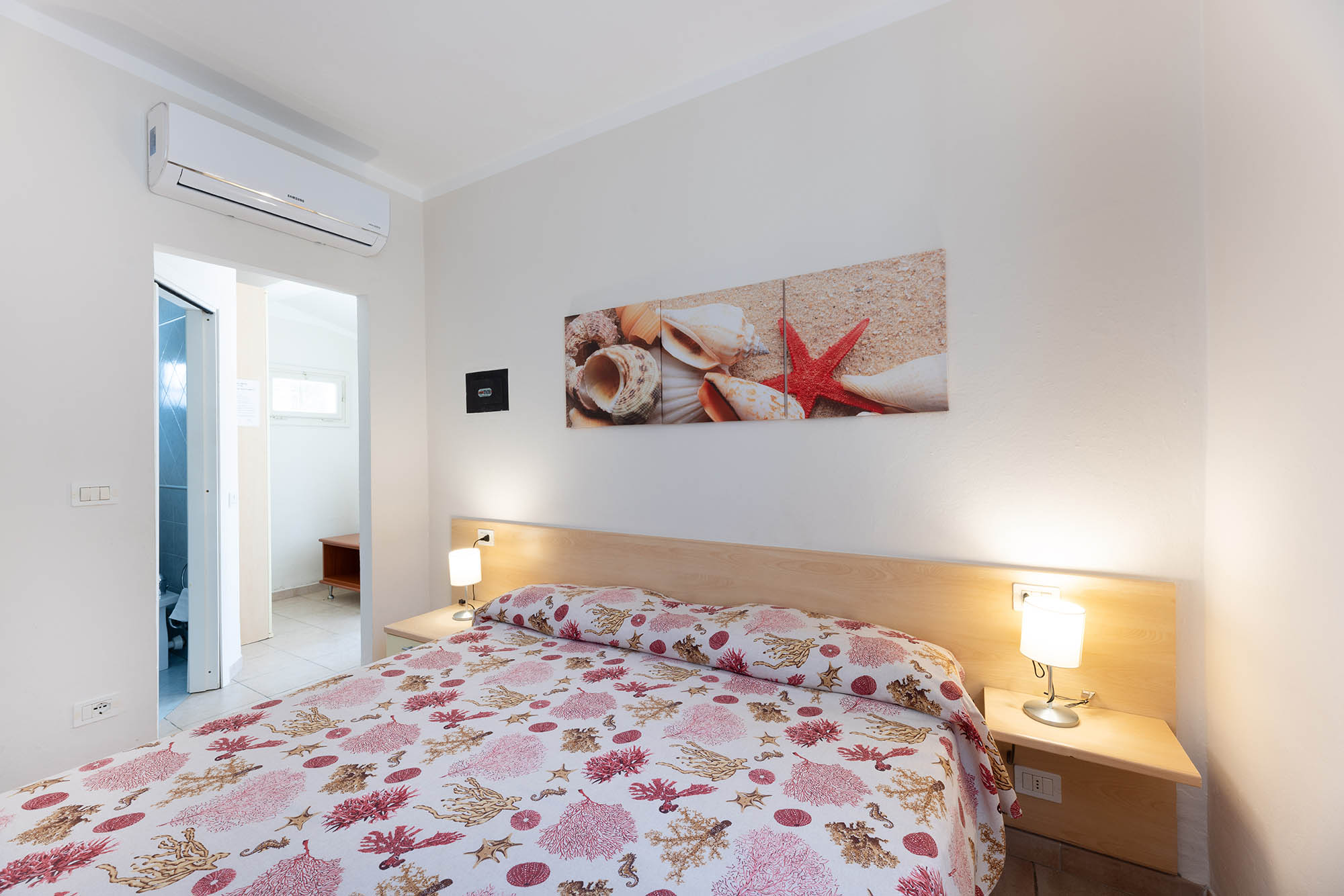 Camera con letto matrimoniale, bagno con doccia, aria condizionata, tv-sat e parcheggio privato. Camera vicino al mare.