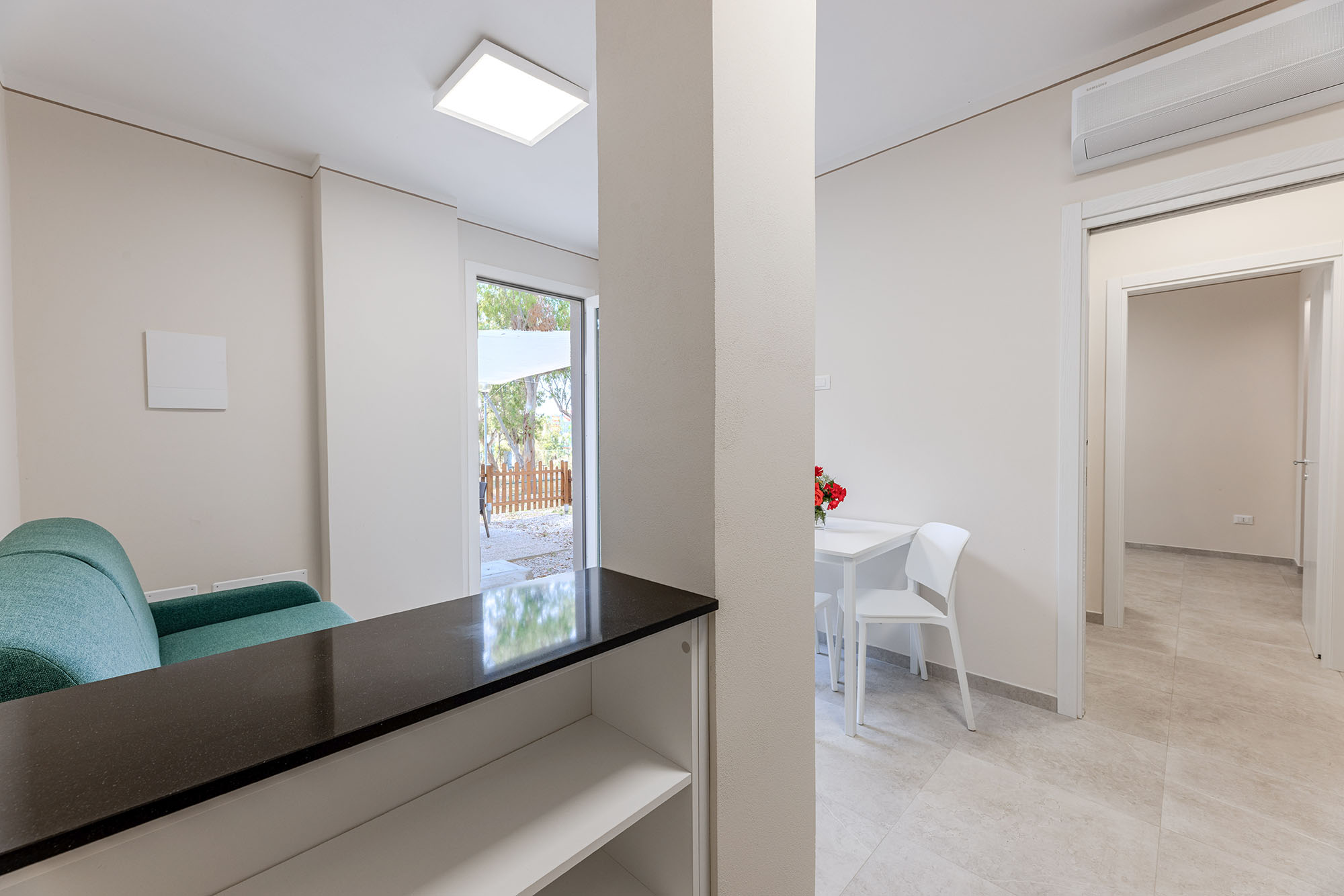 Bungalow bilocale composto da camera matrimoniale e un letto singolo, soggiorno con angolo cottura, dinette, tv-sat, aria condizionata e bagno con doccia, e una veranda attrezzata dove potete trascorrere le vostre serate in tranquillità.
