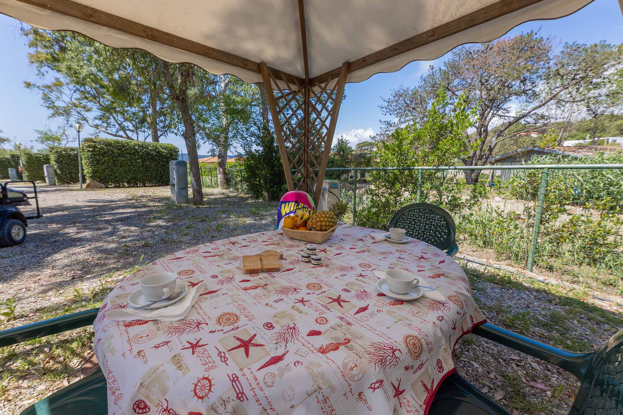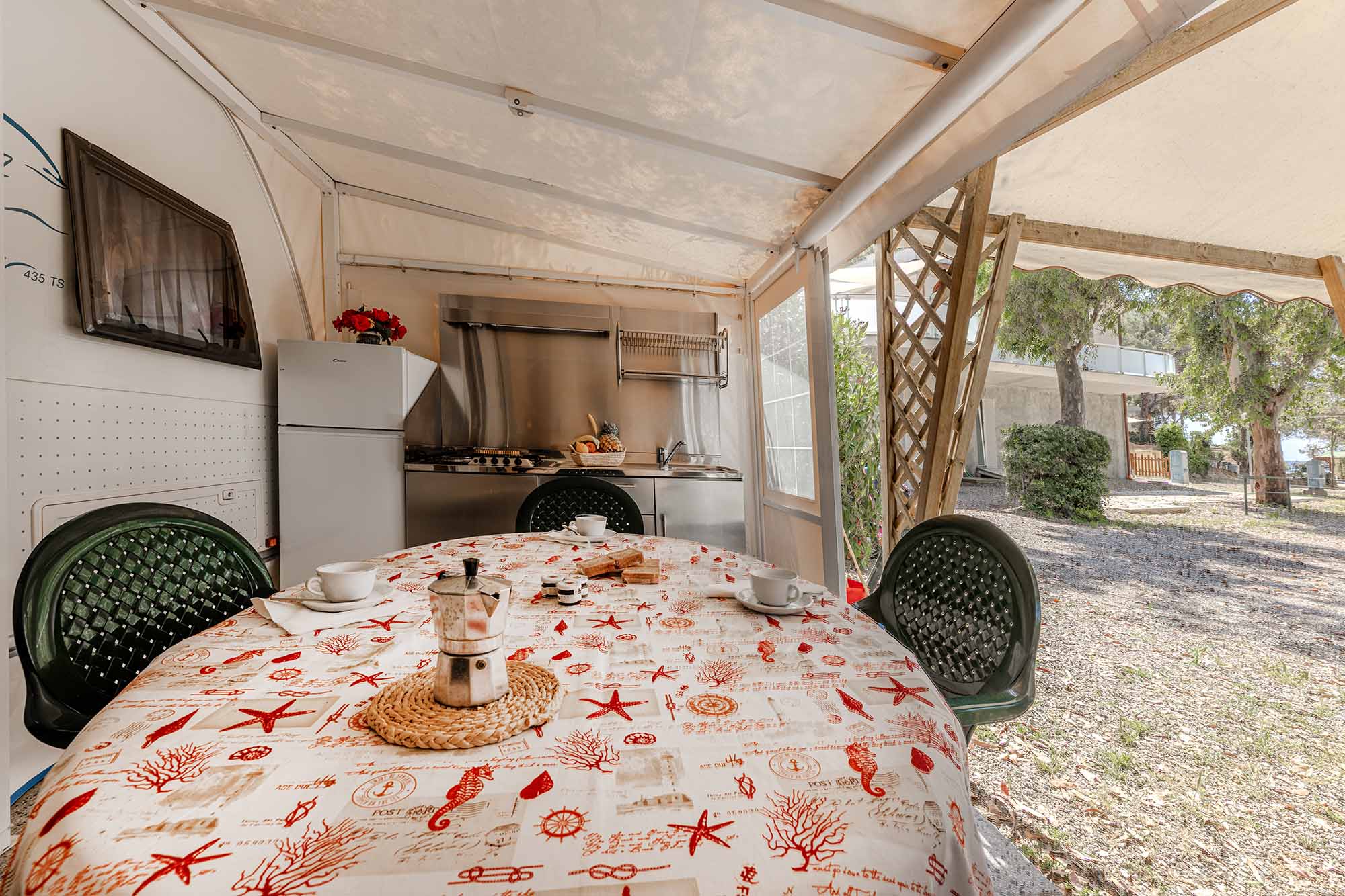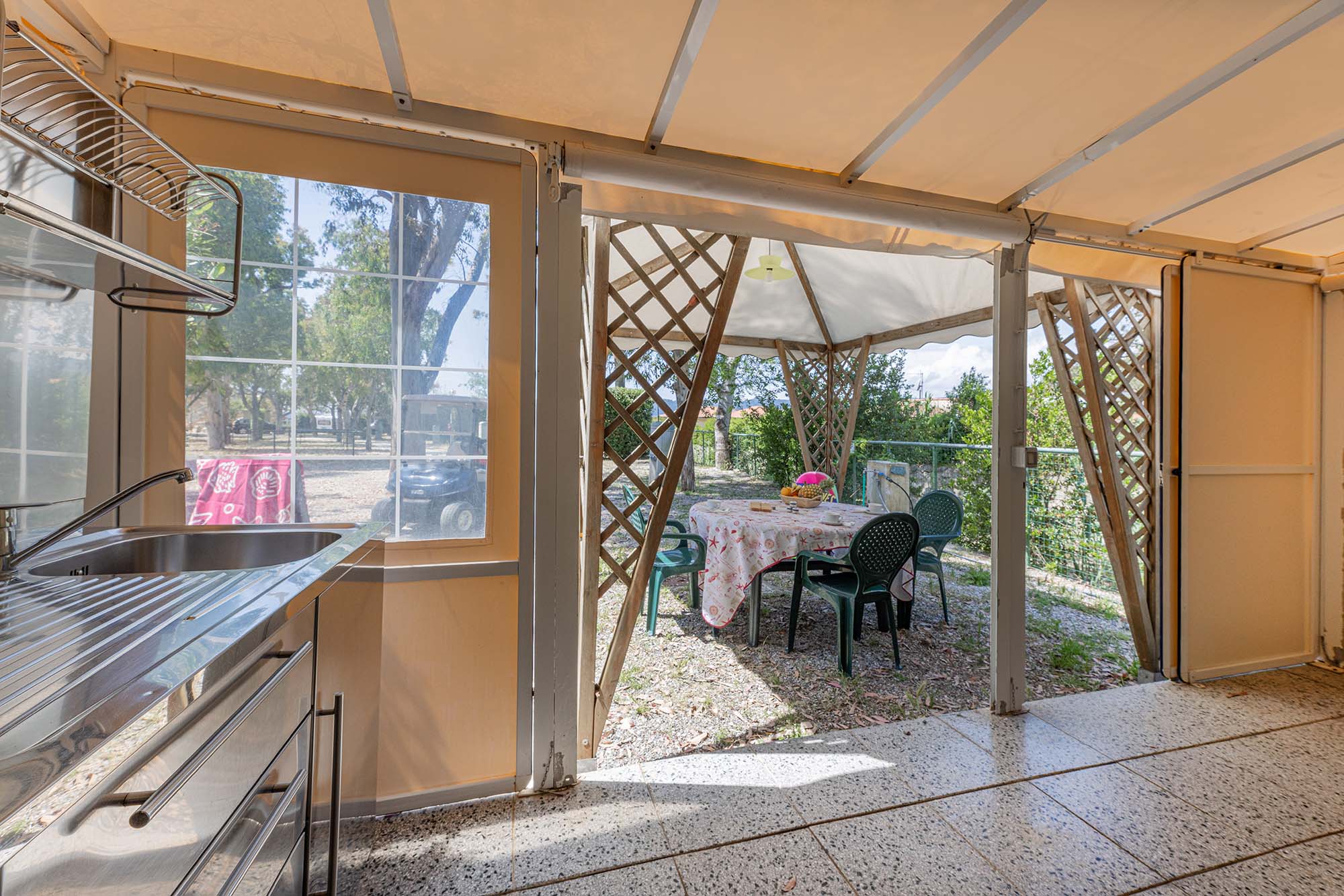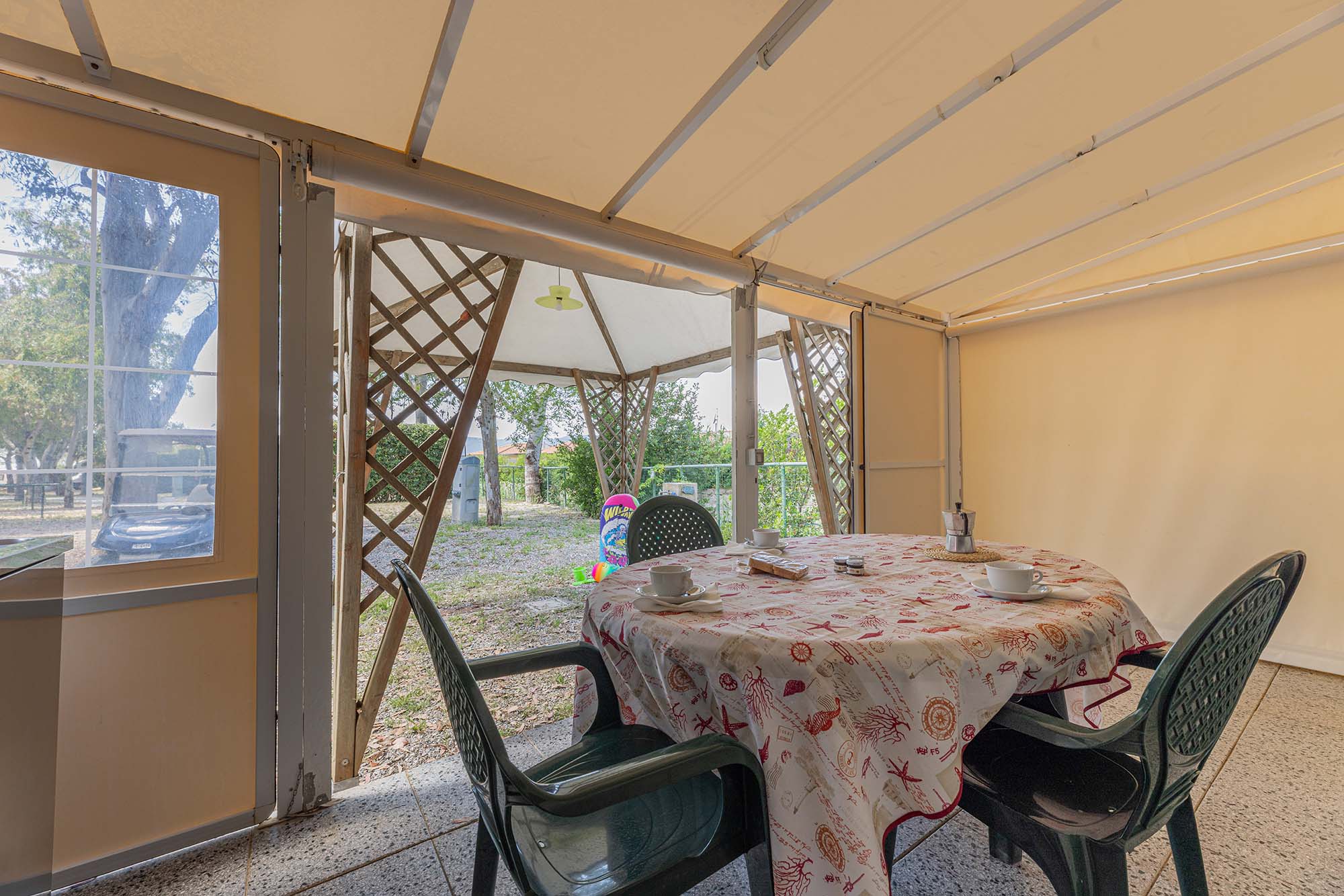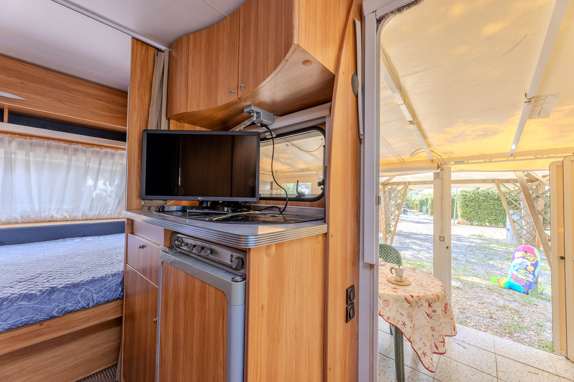 Caravan adibito a zona notte con due letti matrimoniali e un piccolo bagno con solo wc, ampia veranda con cucina in acciaio inox dotata di 4 fuochi, lavello con acqua corrente e frigorifero. Gazebo esterno con tavolo e sedie, tv-sat e ventilatore a piantana. Parcheggio.