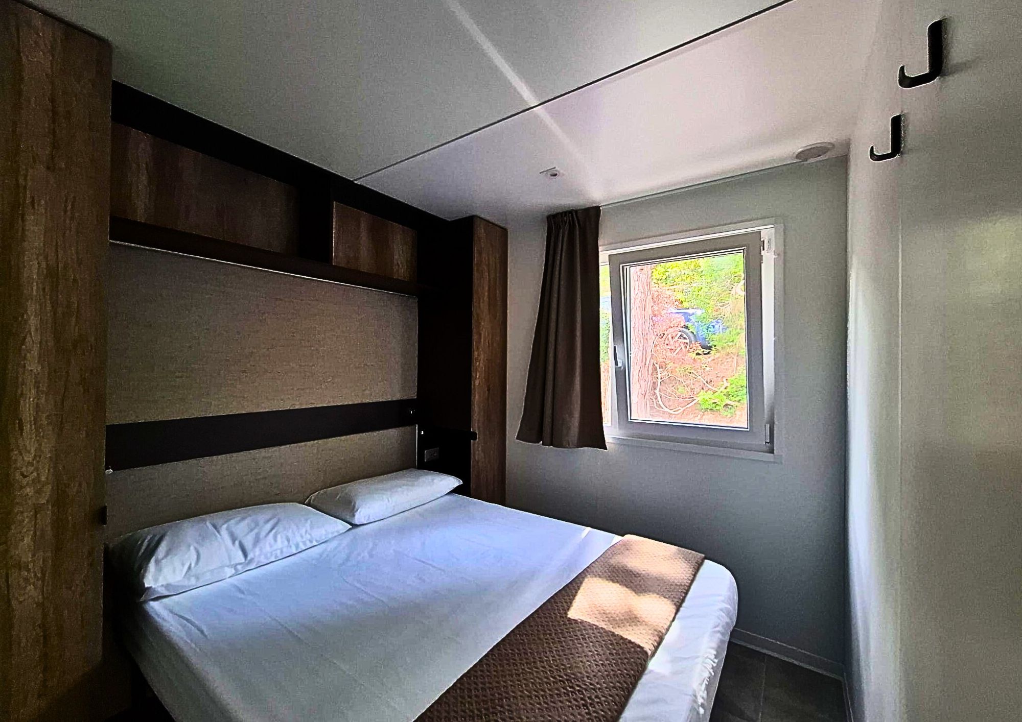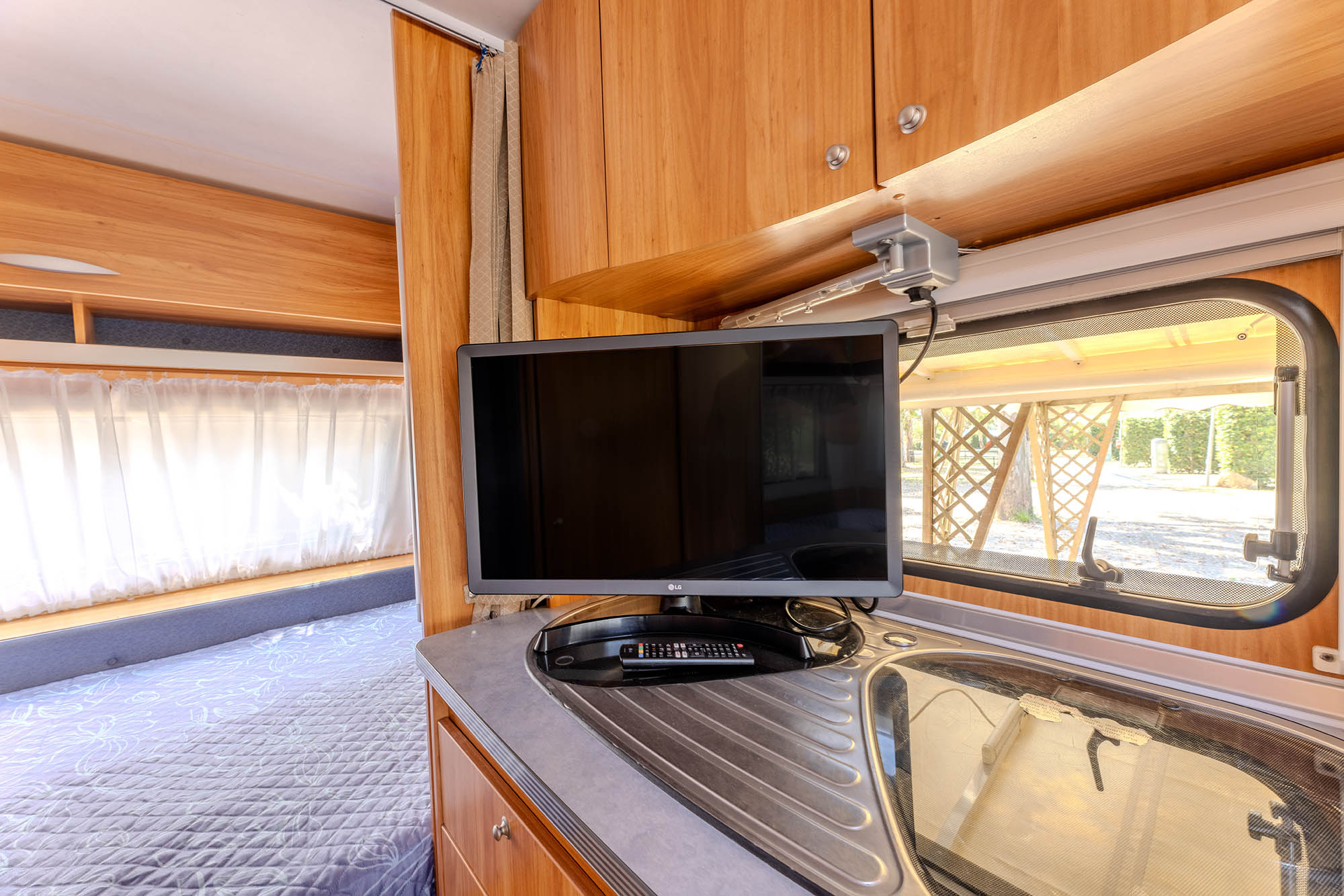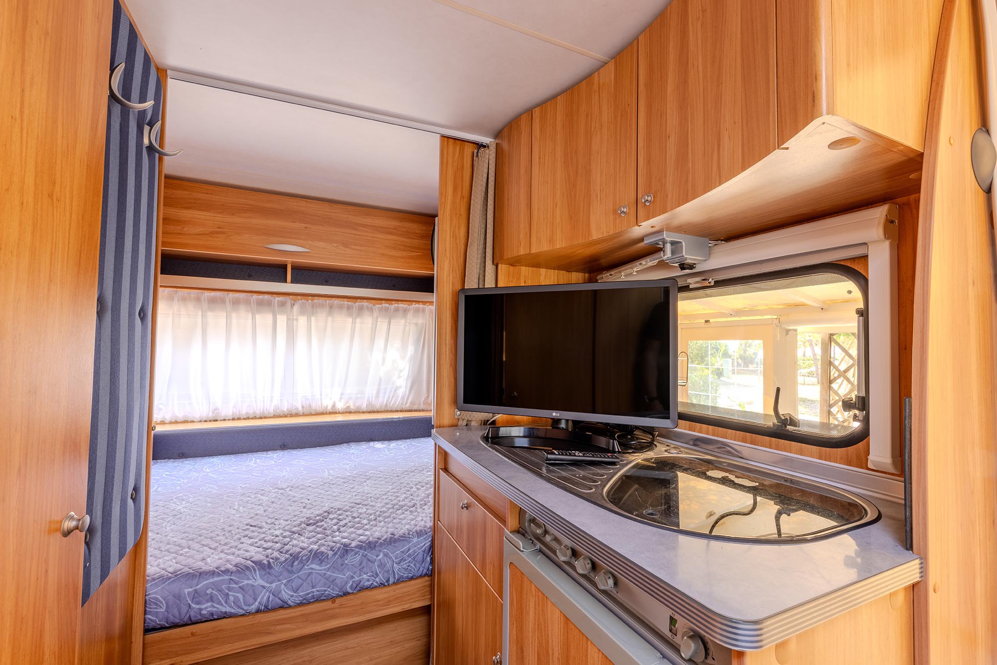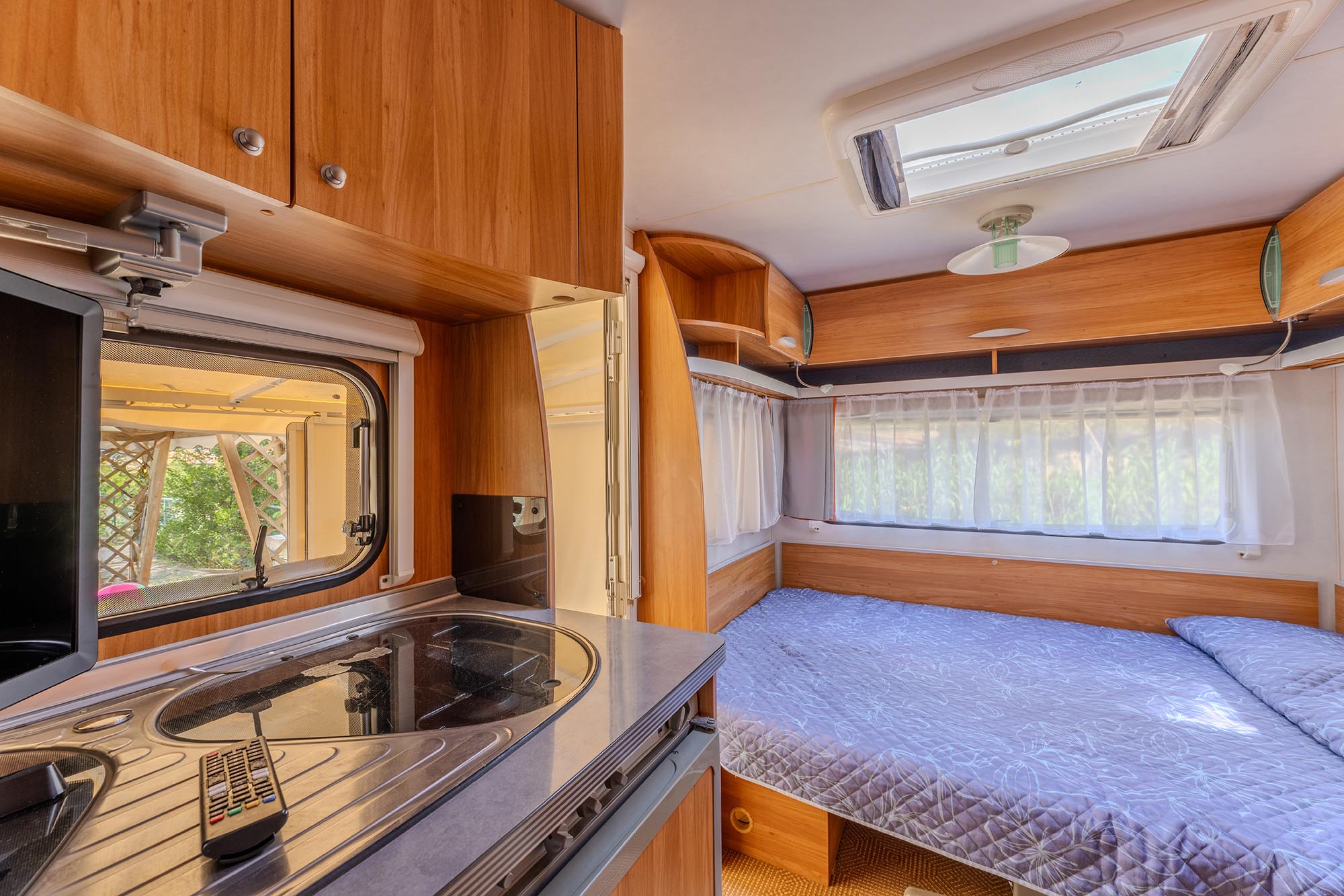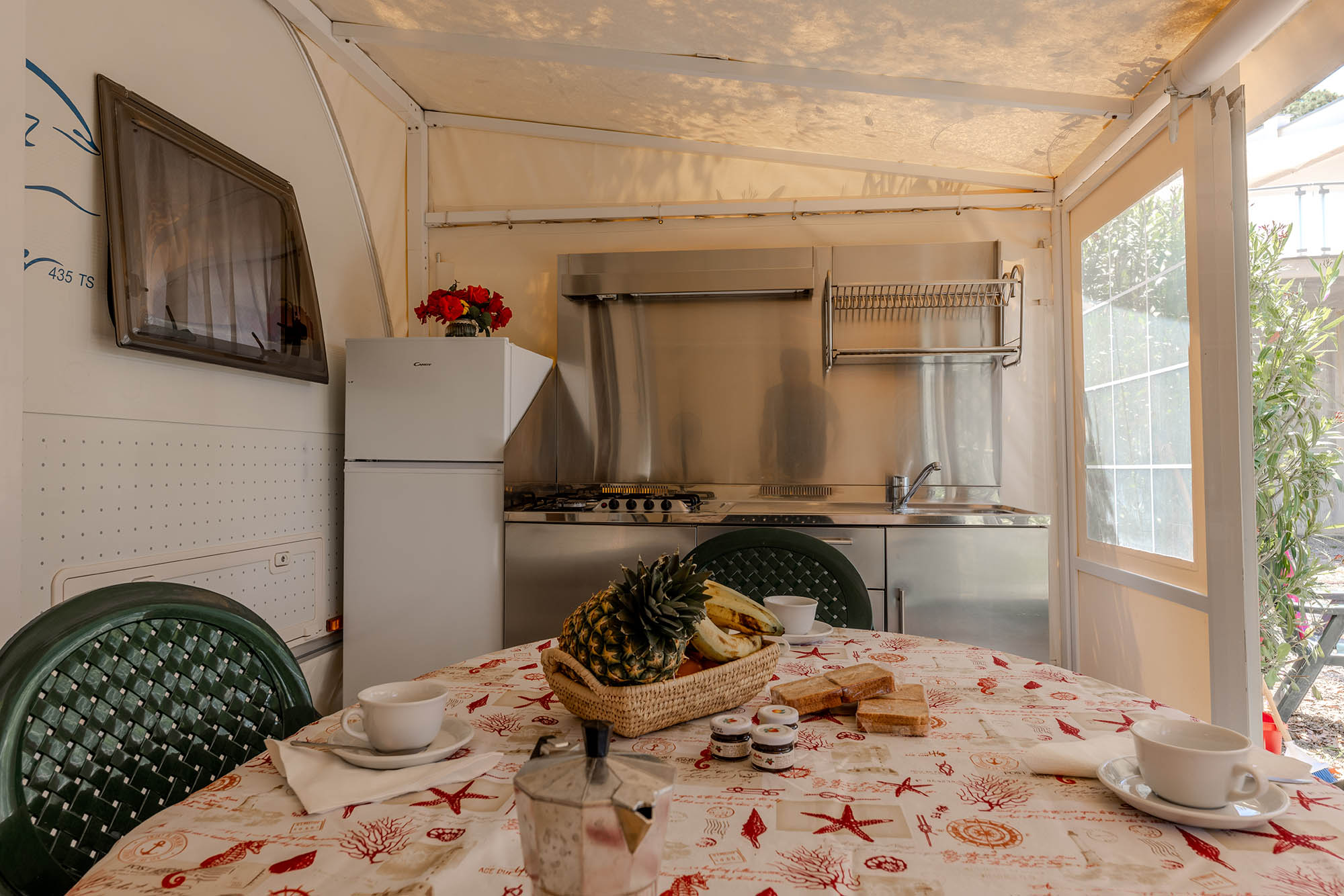 Caravan adibito a zona notte con due letti matrimoniali e un piccolo bagno con solo wc, ampia veranda con cucina in acciaio inox dotata di 4 fuochi, lavello con acqua corrente e frigorifero. Gazebo esterno con tavolo e sedie, tv-sat e ventilatore a piantana. Parcheggio.