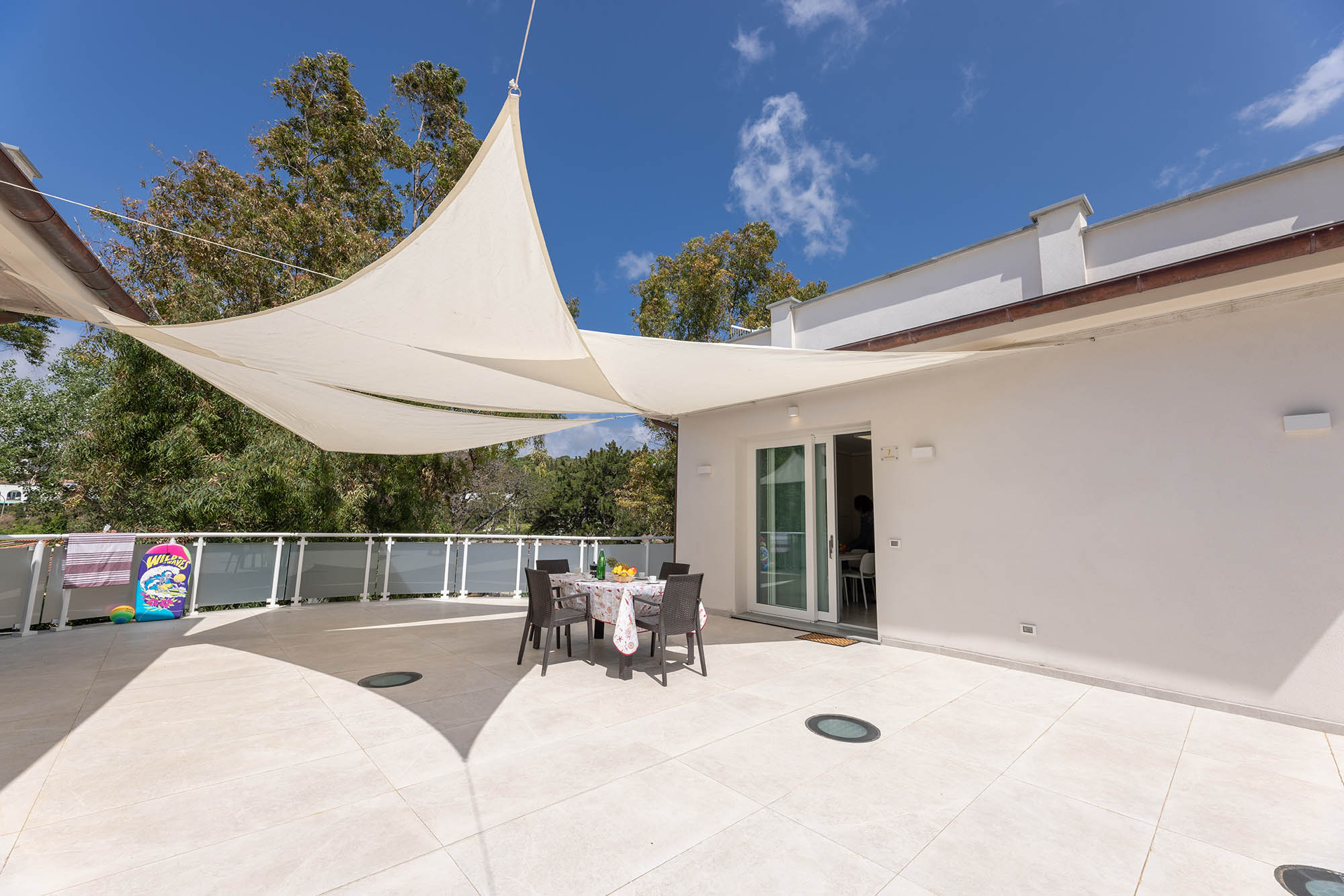 Ampio appartamento trilocale sul mare, composto da un soggiorno con divano letto, cucina dotata di forno e lavastoviglie, una camera con letto matrimoniale e un letto singolo e bagno con doccia, una camera mansardata con letto matrimoniale e un letto singolo e bagno senza doccia, aria condizionata, tv-sat e una veranda coperta, inoltre in giardino un gazebo con tavolo e sedie dove potete trascorrere le vostre serate in tranquillità. Parcheggio privato.