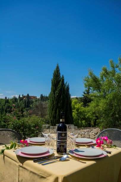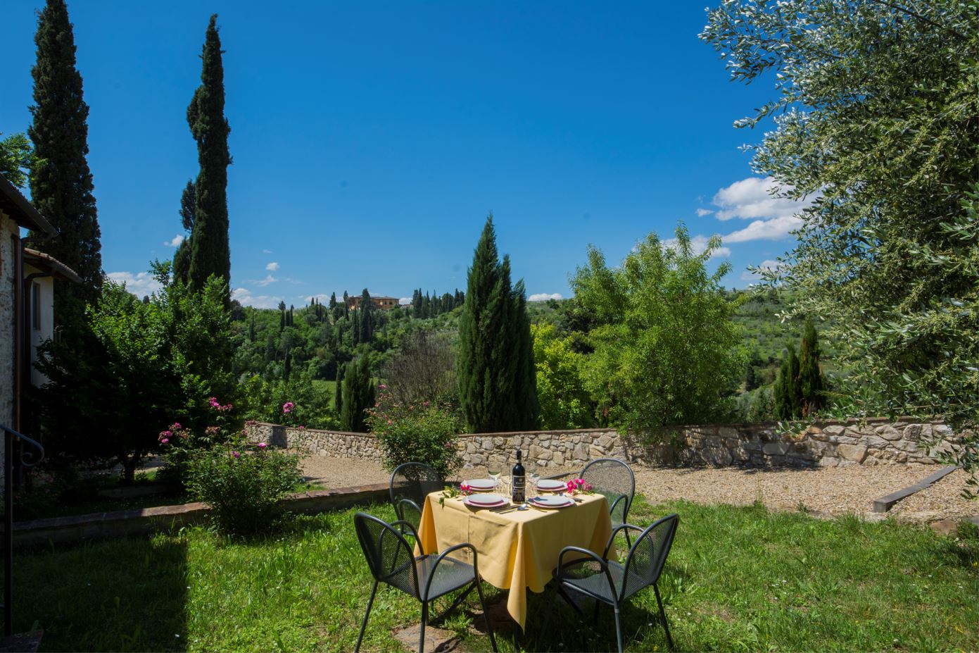 Il Melo (46 m2) è un appartamento panoramico al primo piano, con scala esterna, pavimento in cotto dell’Impruneta e travi a vista.