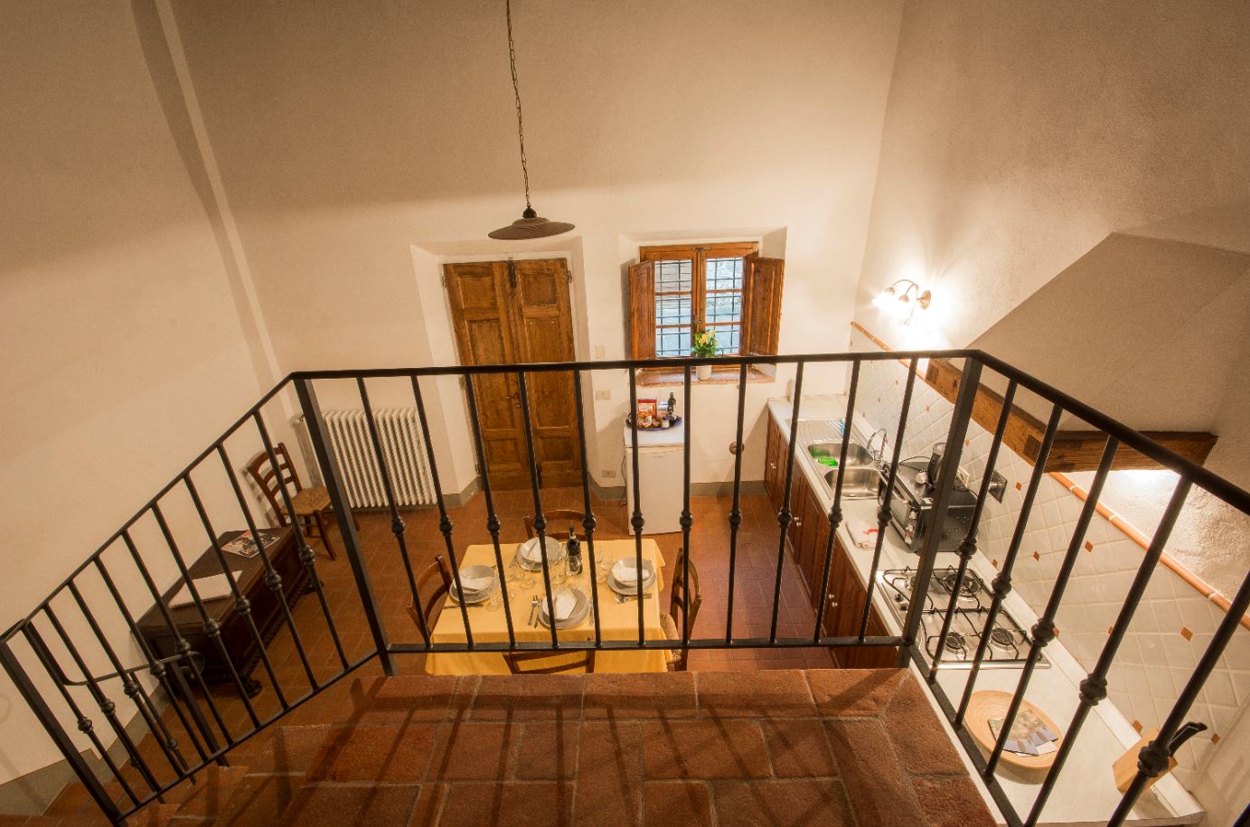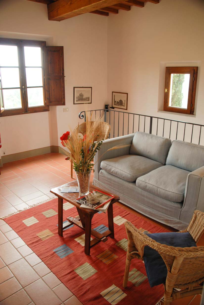 L’Angolo (80 m2) è un piacevole appartamento su due livelli, con pavimento in cotto dell’ Impruneta e travi a vista.