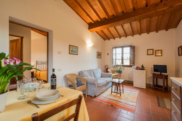 Il Mandorlato (59 m2) è un caratteristico appartamento su un unico livello, con pavimento in cotto dell’Impruneta e travi a vista.