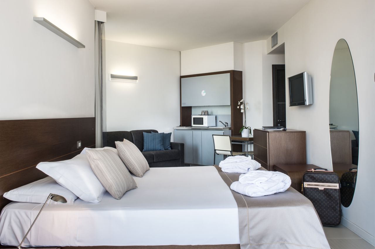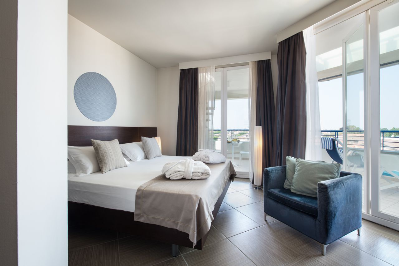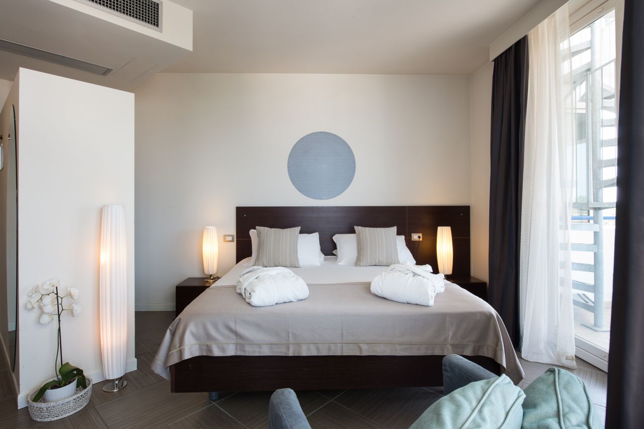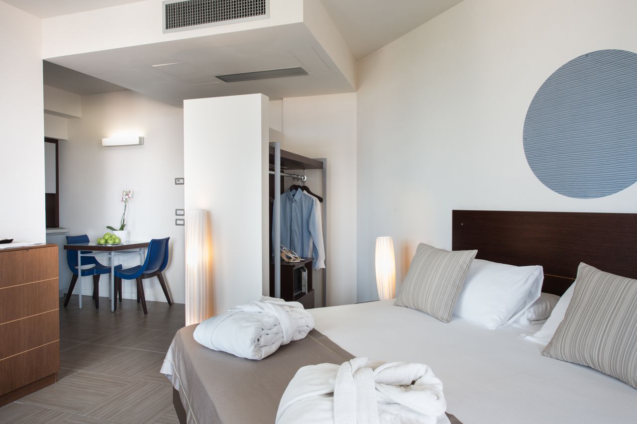 The 2-room suites at Blu Suite Hotel are actually small apartments with a view,ideal for a busy family or anyone looking for space and comfort. The bedroom isseparate from the living room with sofa-bed, guaranteeing privacy for everyone in thefamily. And the kitchenette is ideal for whoever needs to prepare a quick snack.This suite offer:Private beach access (from Easter to 15th September) with umbrella, 2 sunbeds and beach towels (with free change every 7 days)Access to outdoor pool heated (from Easter to 15th September) , with umbrellas and sunbedsUnlimited access to spaSpa kit with slippers and robeMini-bar restocked dailyWi-FiTV with SKYVideo surveilled private parking