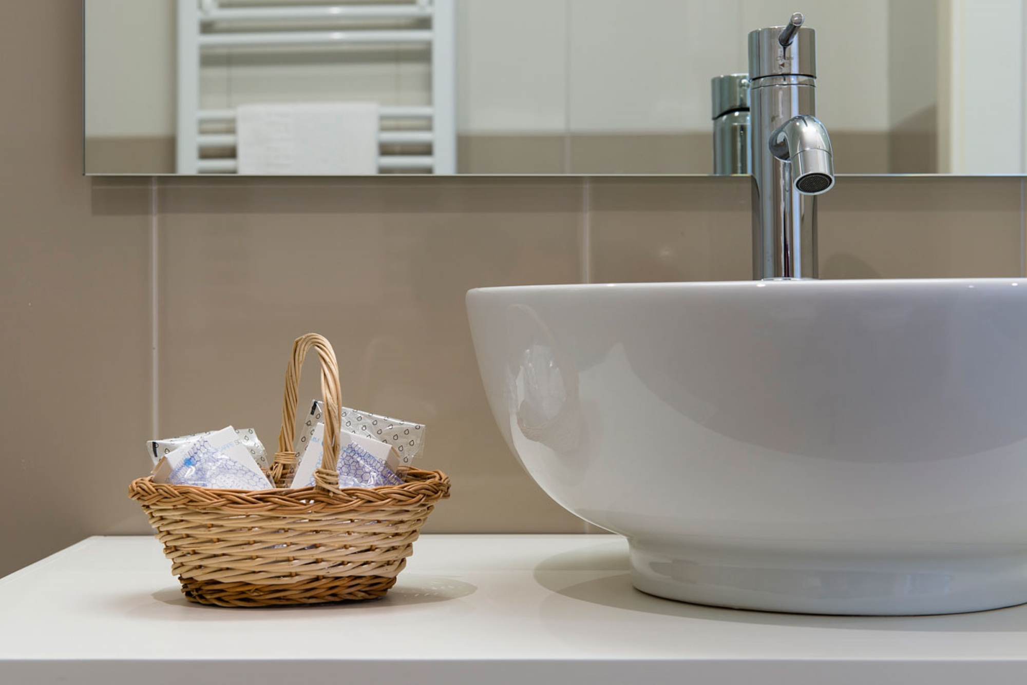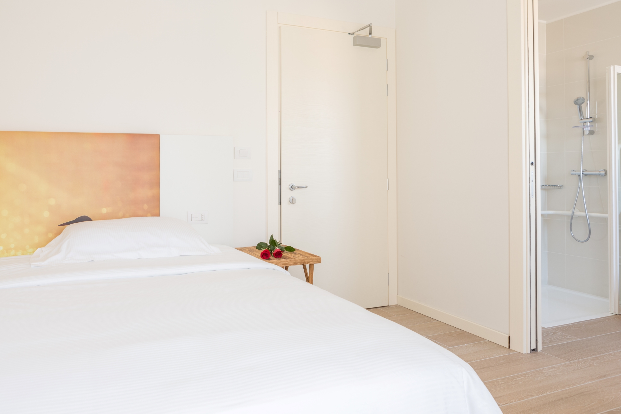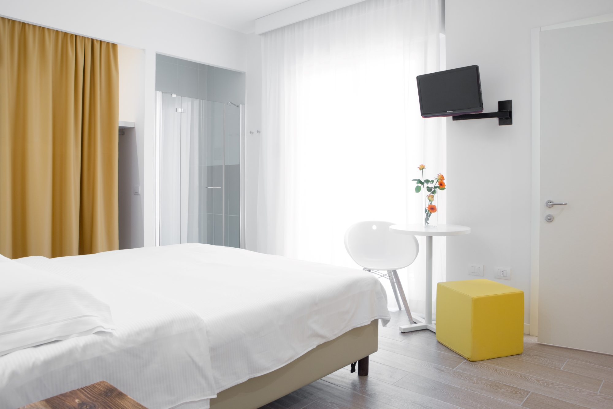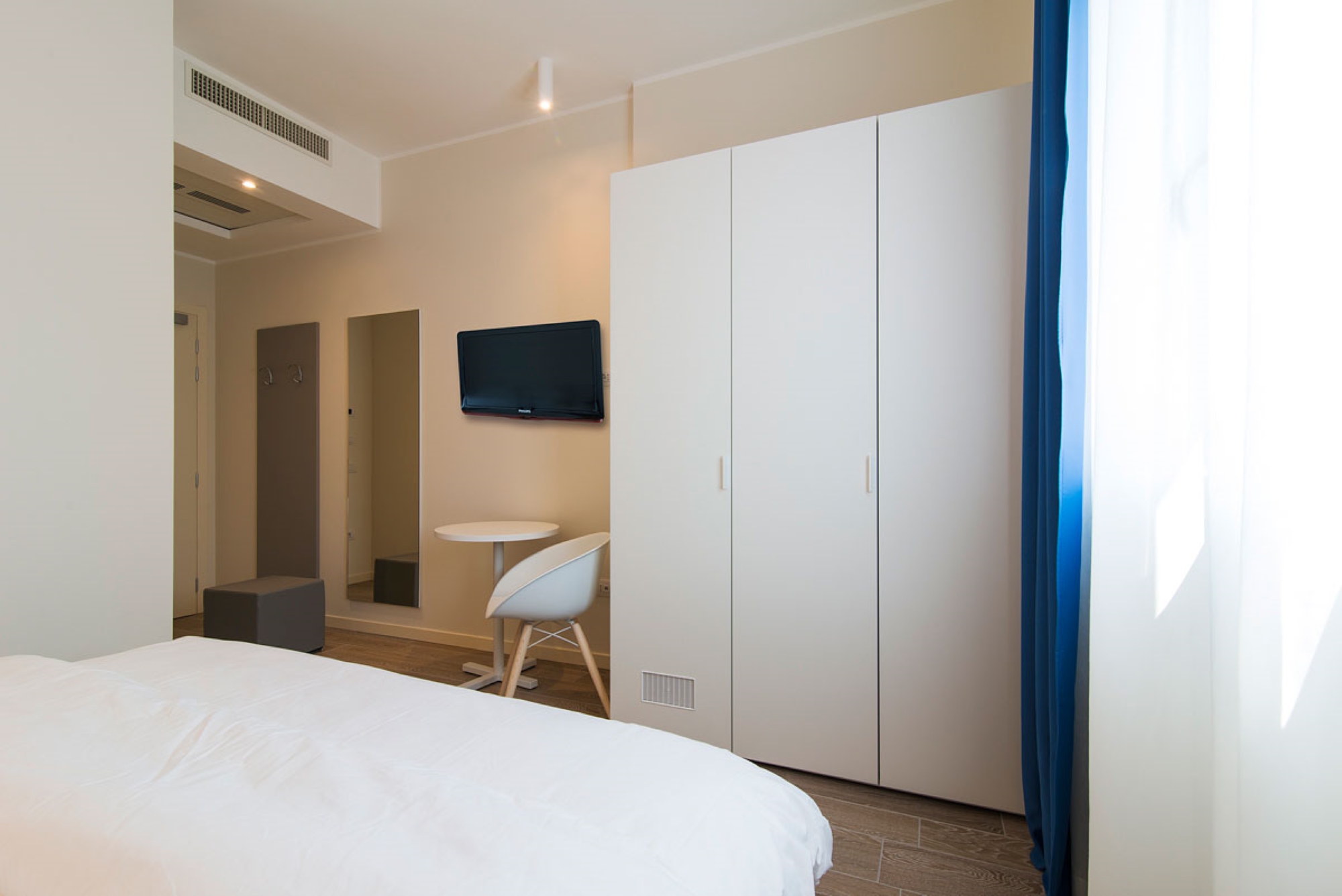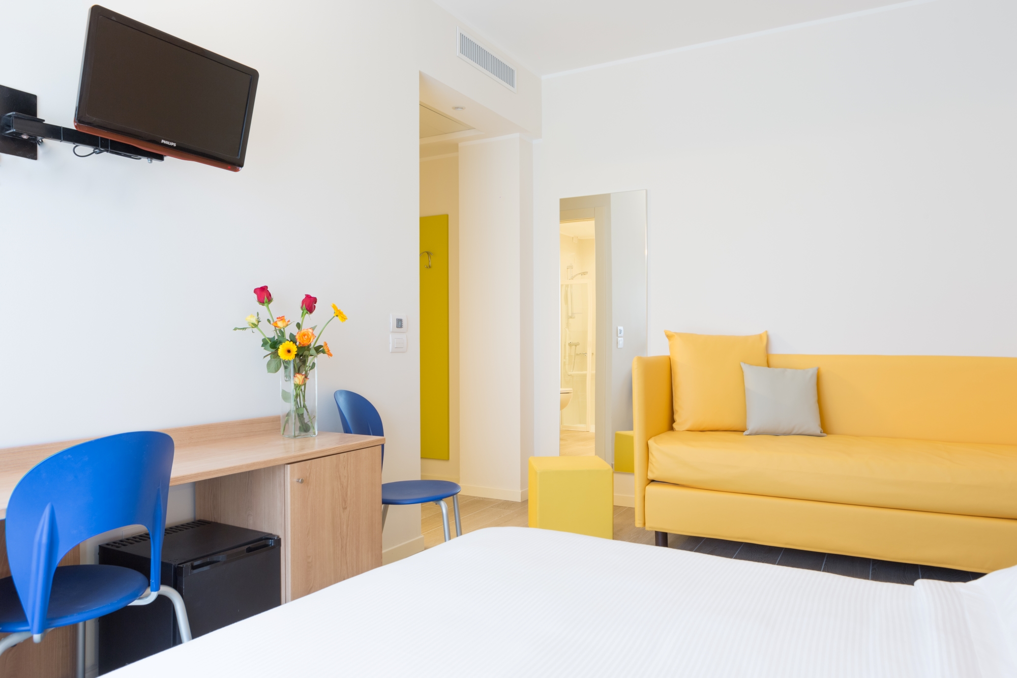 Seitenzimmer ohne Balkon, ausgestattet mit einem Doppelbett oder zwei Einzelbetten. Es ist in einem modernen Stil eingerichtet und ist sehr hell dank seiner Seitenfenster.