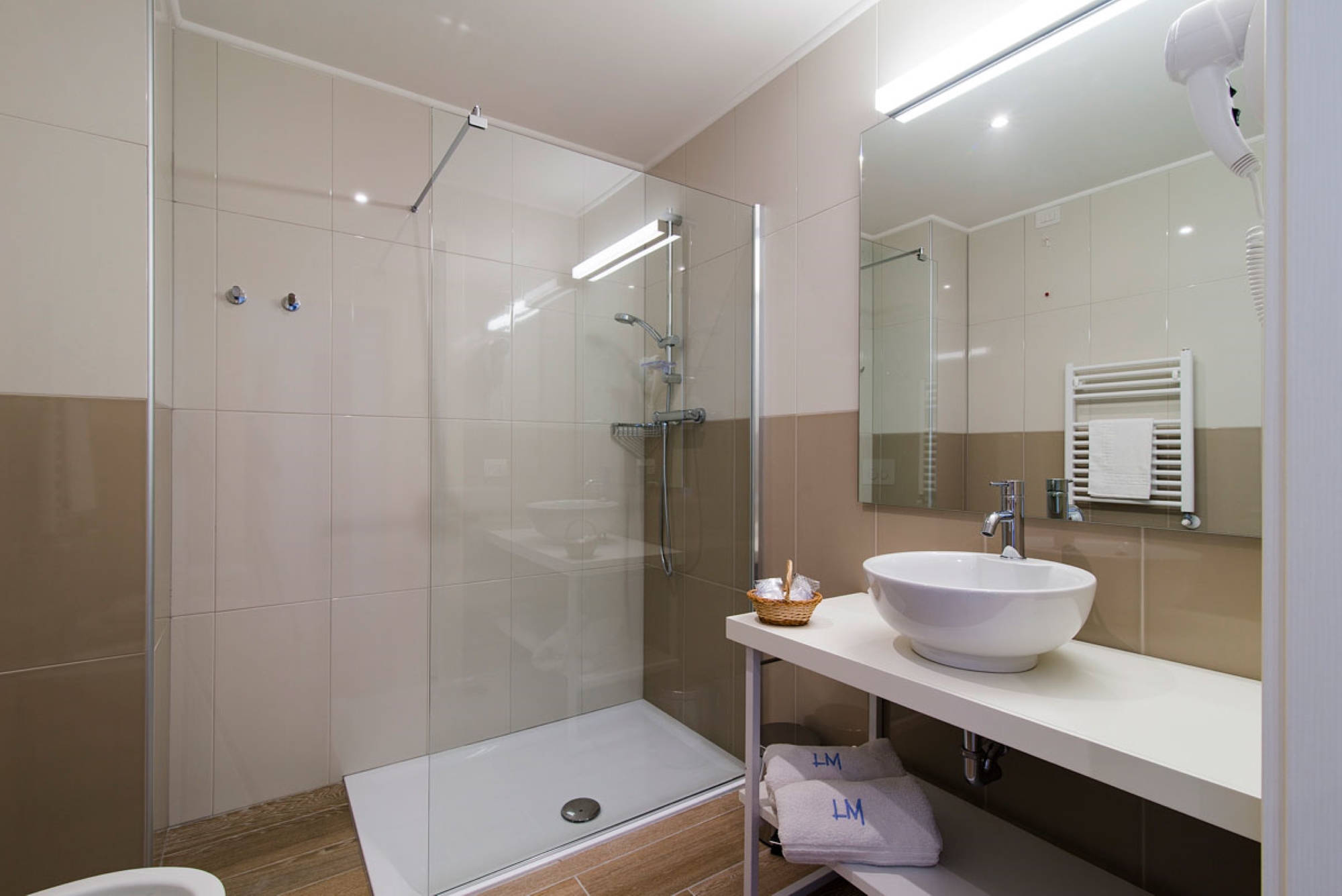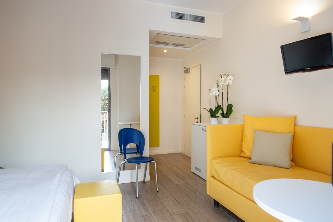 Dieses modern eingerichtete Zimmer ist mit einem Doppelbett oder zwei Einzelbetten ausgestattet. Es kann bis zu 3 Personen beherbergen, hat einen Balkon mit bequemen Sesseln und einen teilweisen Meerblick.