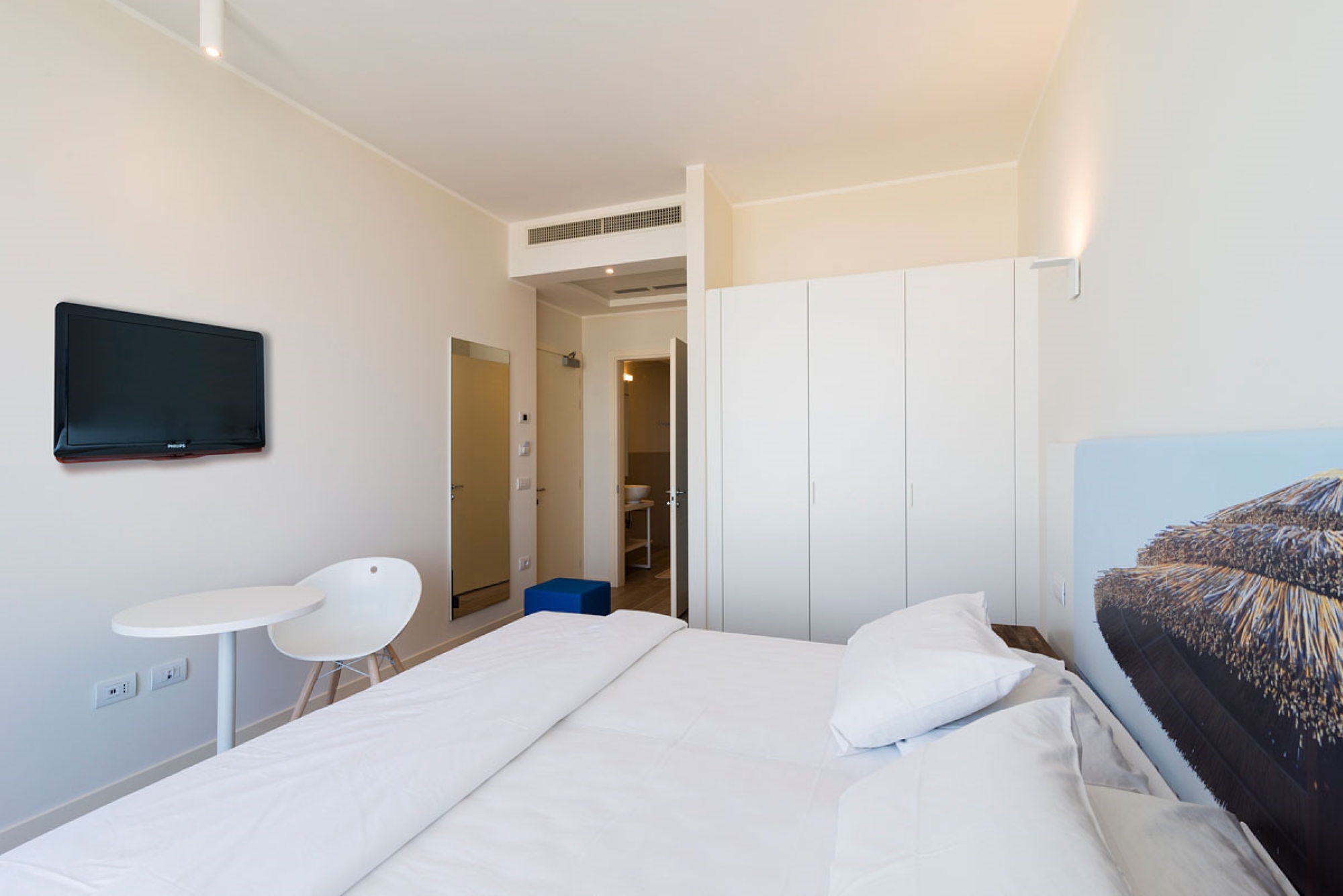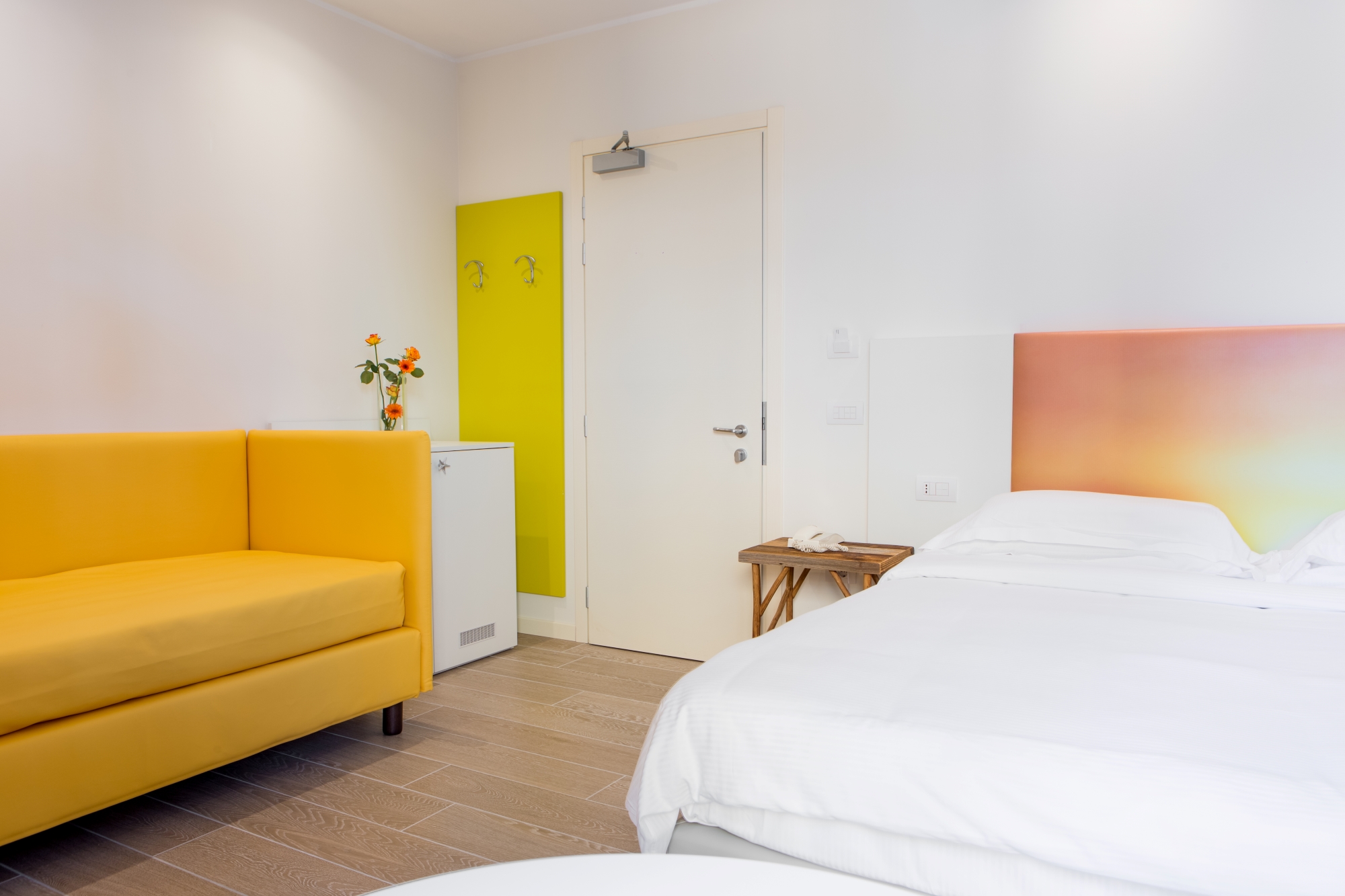 Dieses innovativ eingerichtete Zimmer ist mit einem Doppelbett oder zwei Einzelbetten ausgestattet. Es bietet Platz für bis zu drei Personen und verfügt über einen komfortablen Balkon mit direktem Blick auf das Meer.