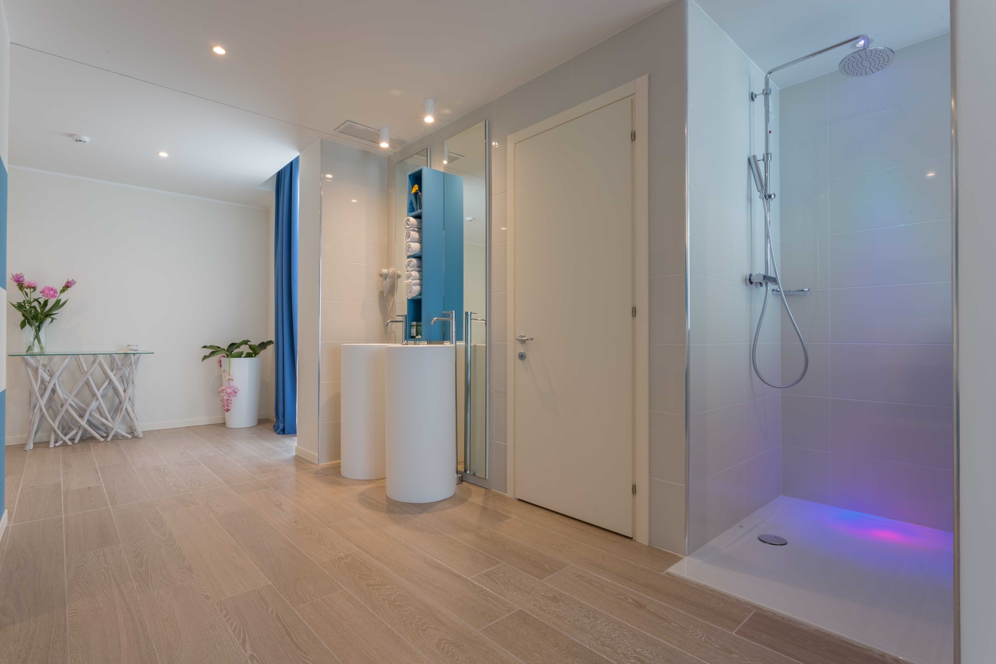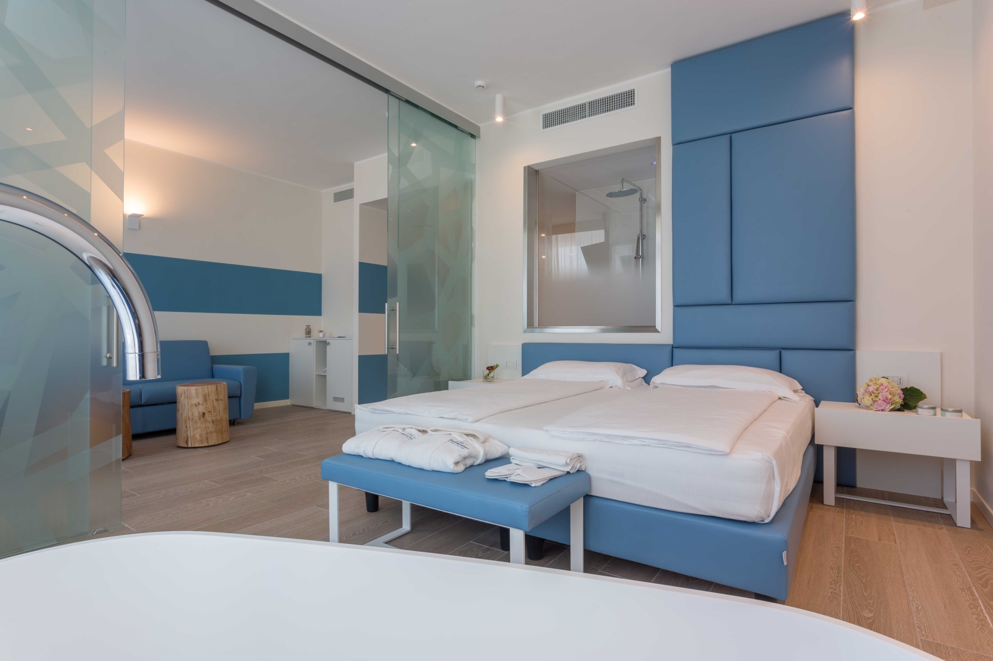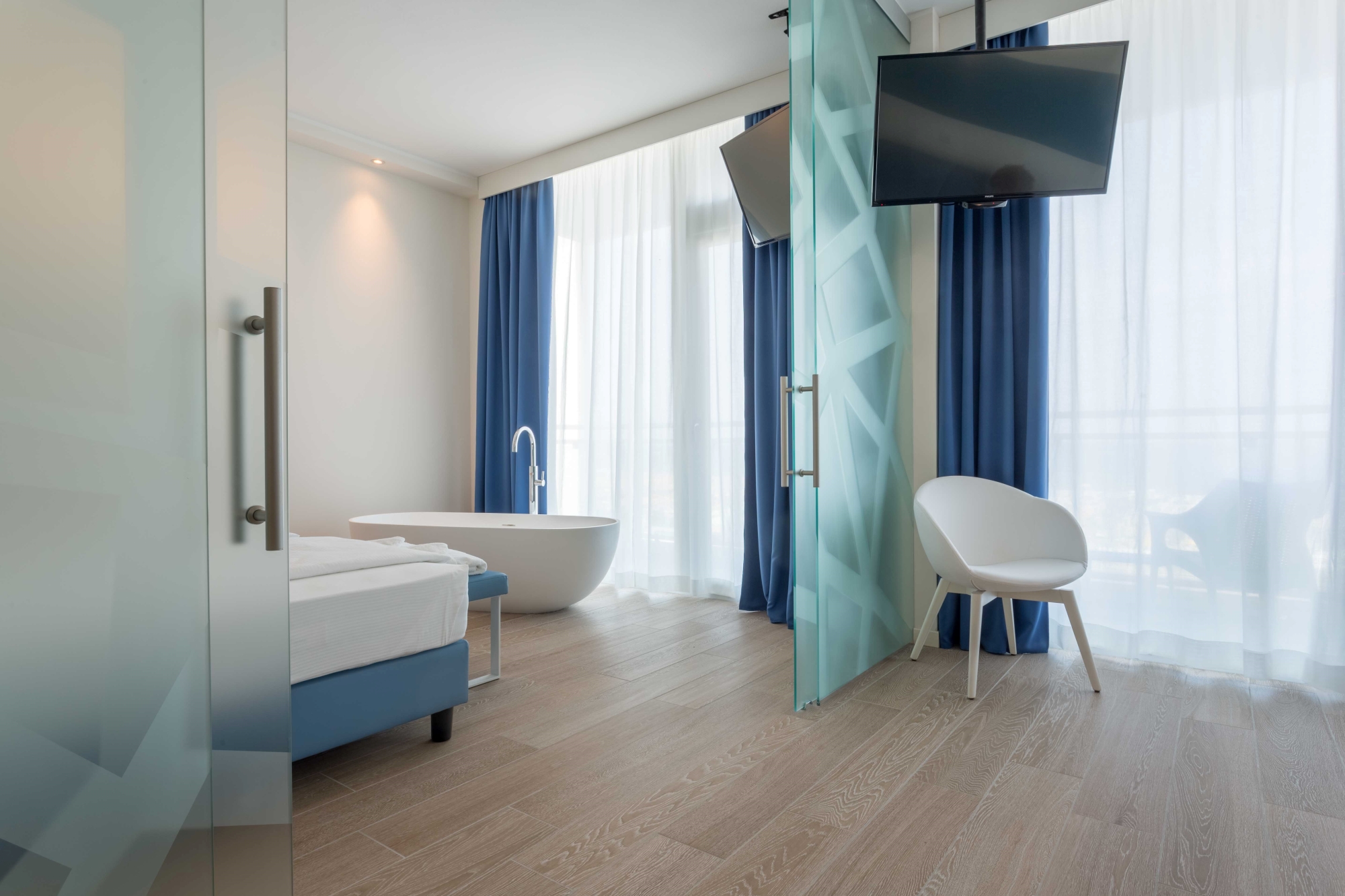 Modernes und innovatives Zimmer mit einem Wohnbereich, begehbarem Kleiderschrank, Doppelwaschbecken, Panoramadusche und Badewanne. Es befindet sich im siebten Stock und verfügt über einen komfortablen Balkon mit Sesseln und Panoramablick auf das Meer.