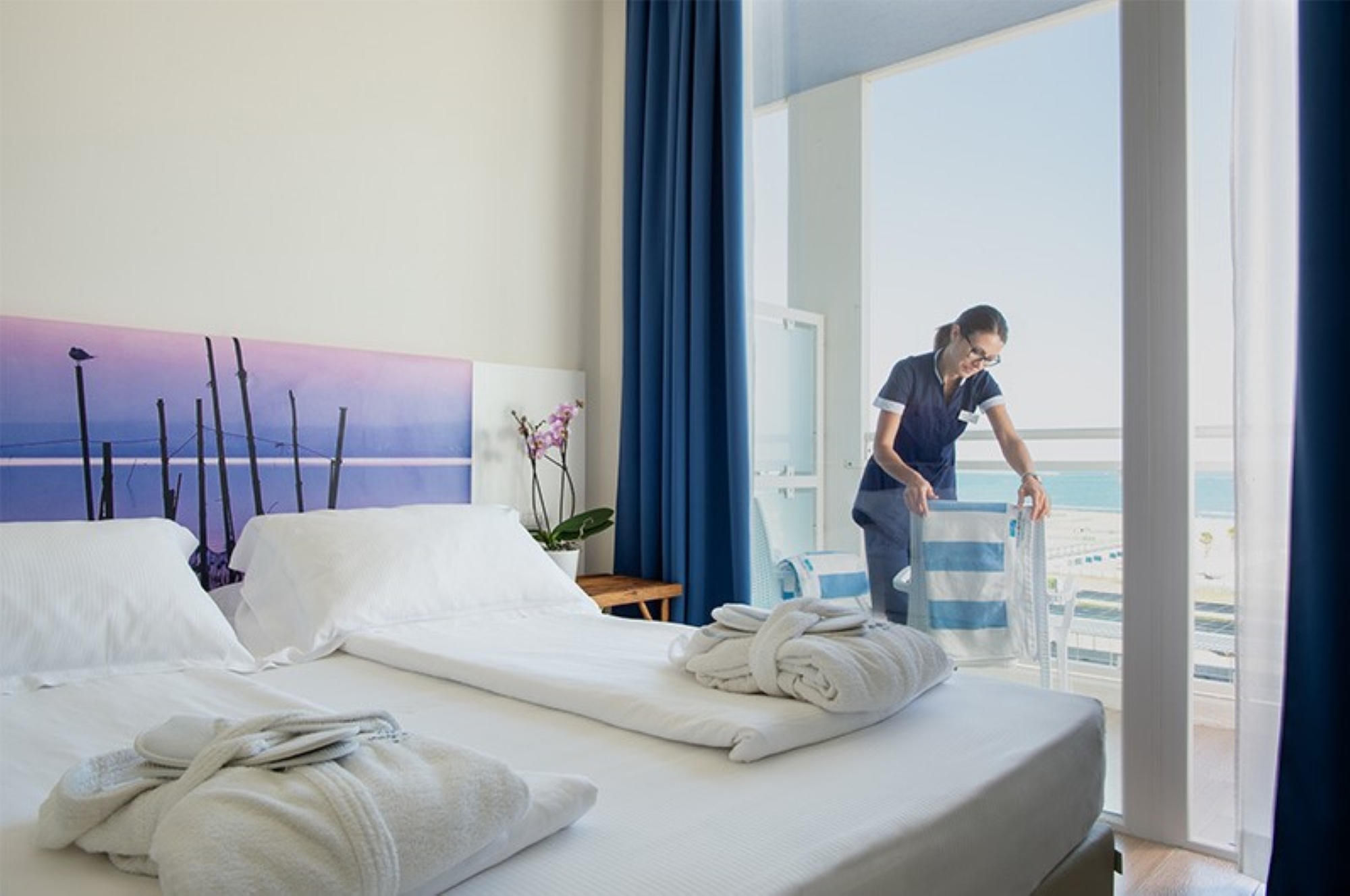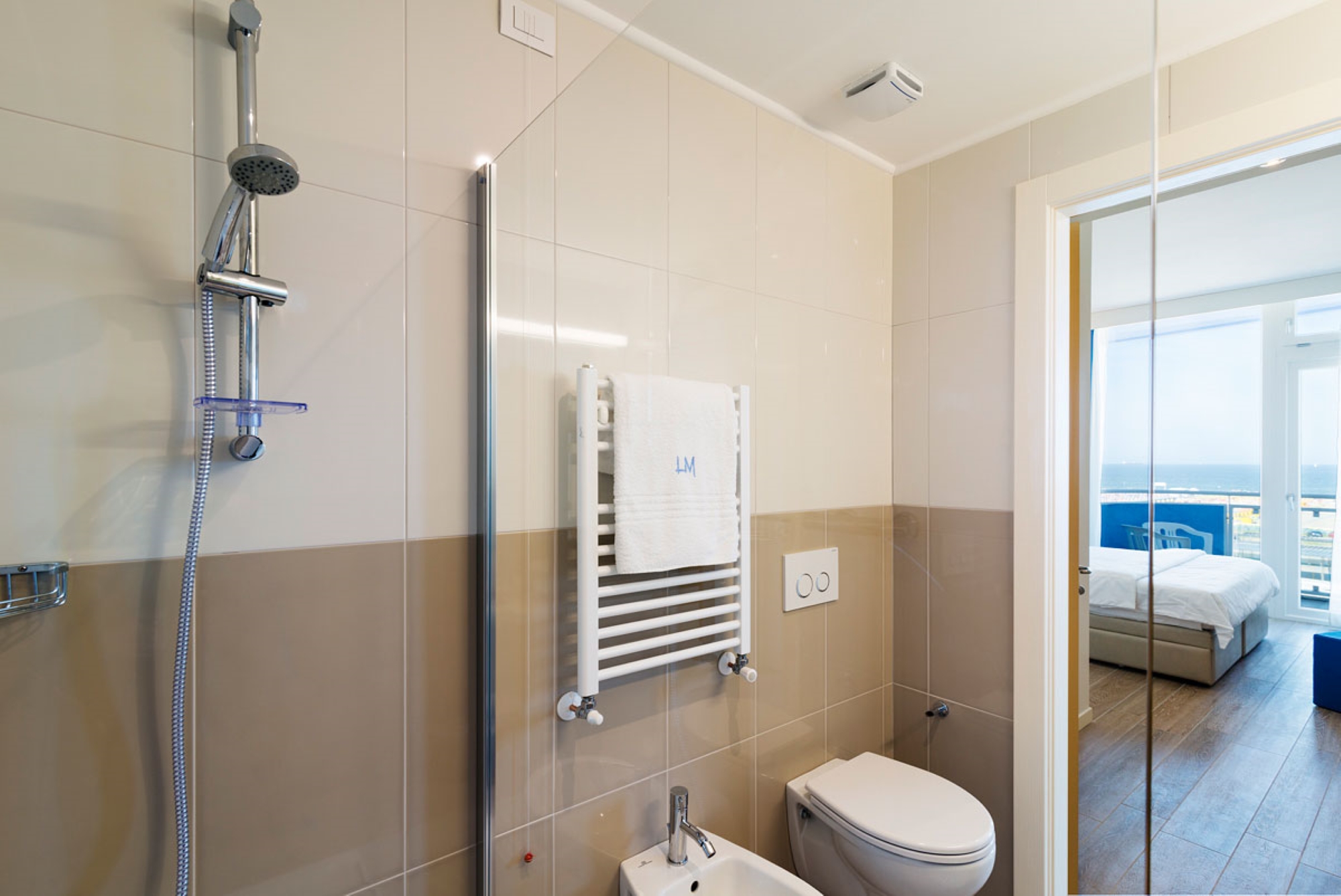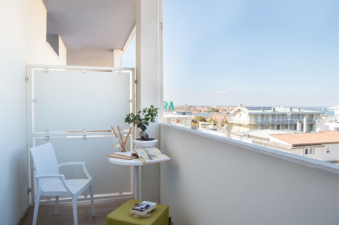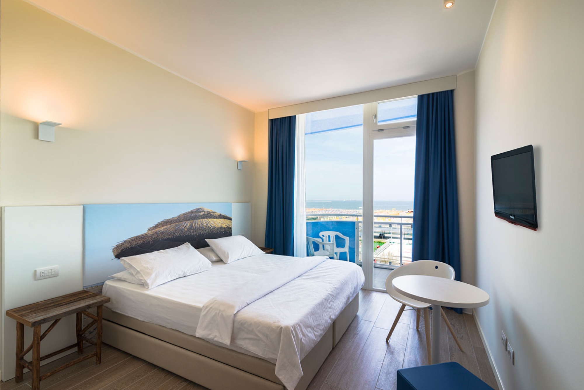 Das auf innovative Weise eingerichtete Zimmer mit Meerblick auf den höchsten Etagen des Gebäudes ist mit einem Doppelbett oder zwei Einzelbetten ausgestattet. Es bietet Platz für bis zu zwei Personen, liegt zwischen der fünften und siebten Etage des Gebäudes und verfügt über einen komfortablen, möblierten Balkon mit Panoramablick auf das Meer.