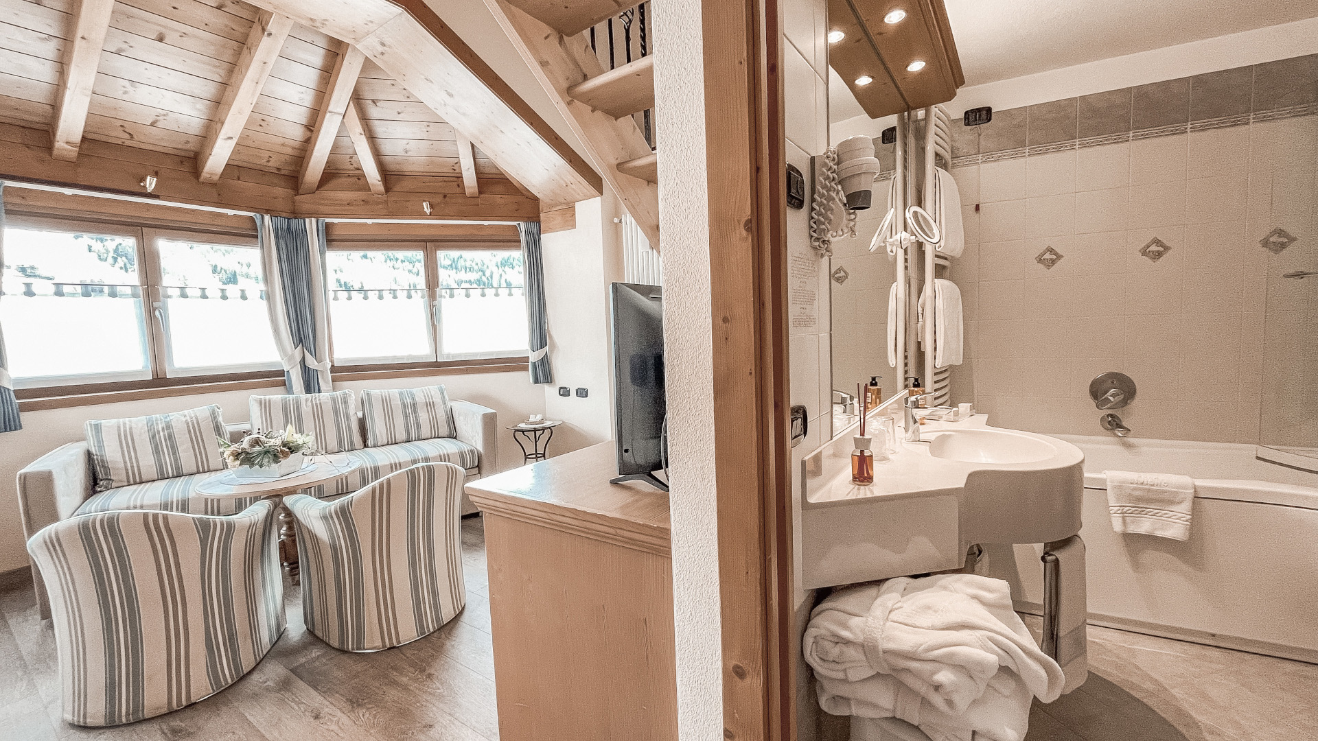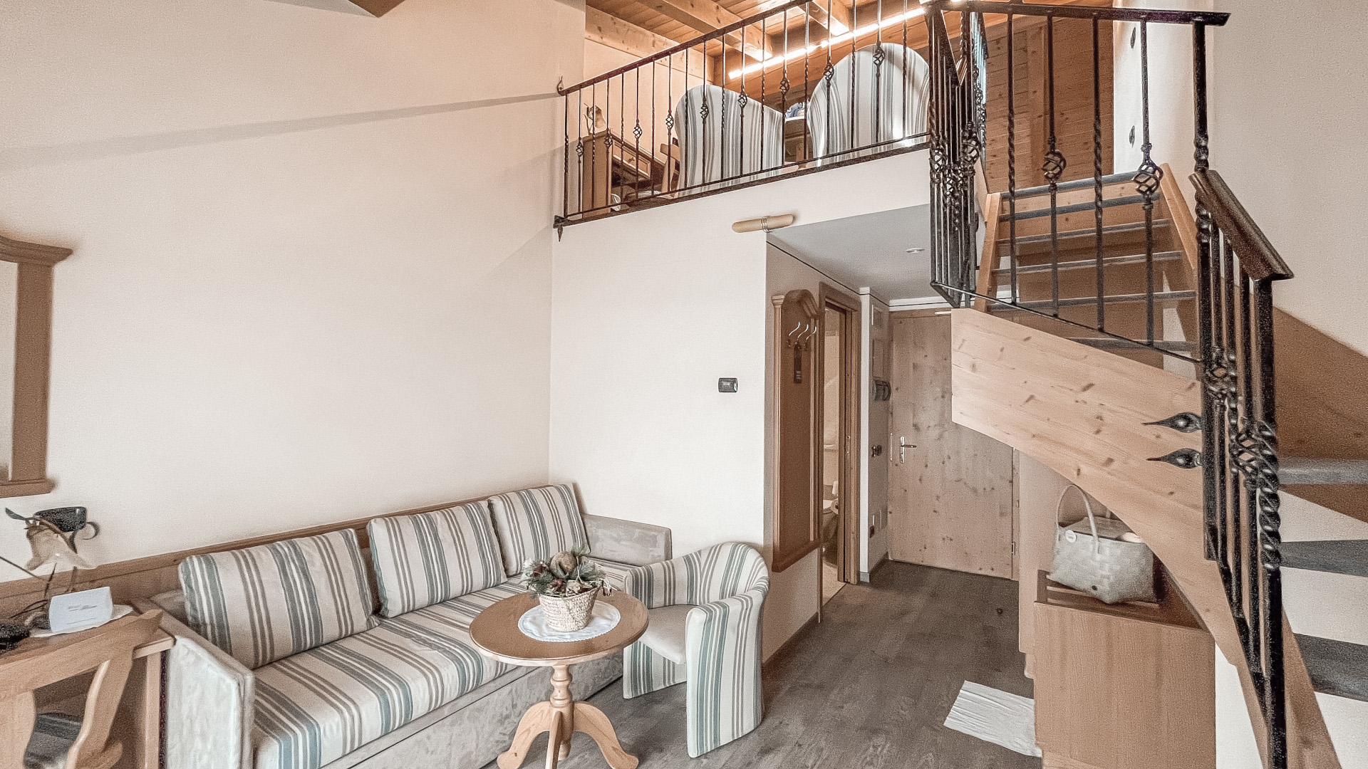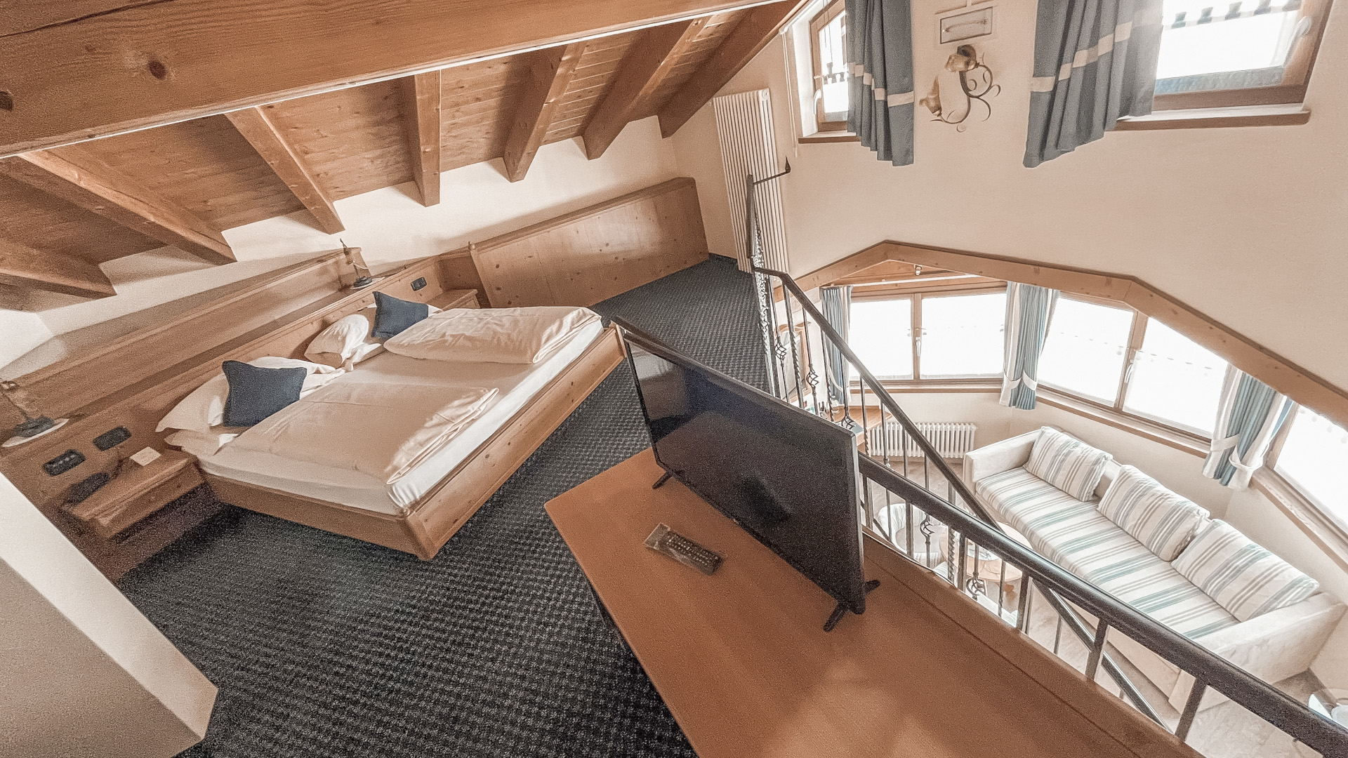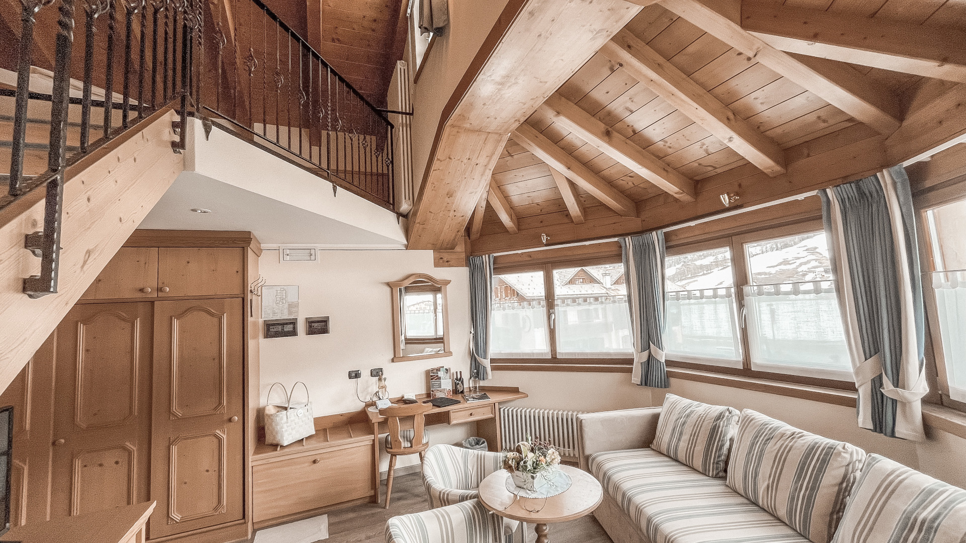 Caratteristica stanza giorno e notte con balcone panoramico esposto a sud. Goditi il lusso di una Junior Suite su due livelli (35mq) arredata con cura in stile montano. A renderla unica le travi a vista e un curato arredamento classico. Ideale per chi desidera spazi ampi e la possibilità di ammirare la bellezza della montagna godendo di uno spazio intimo e riservato.