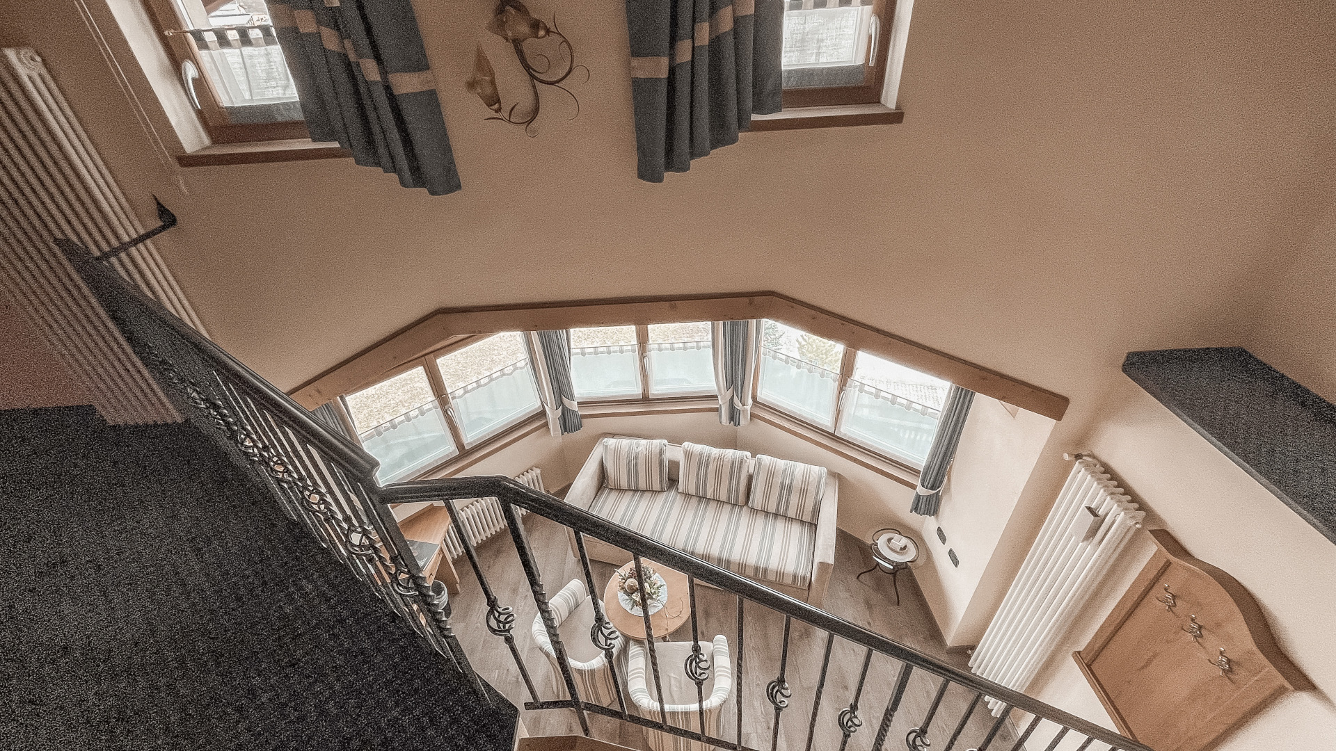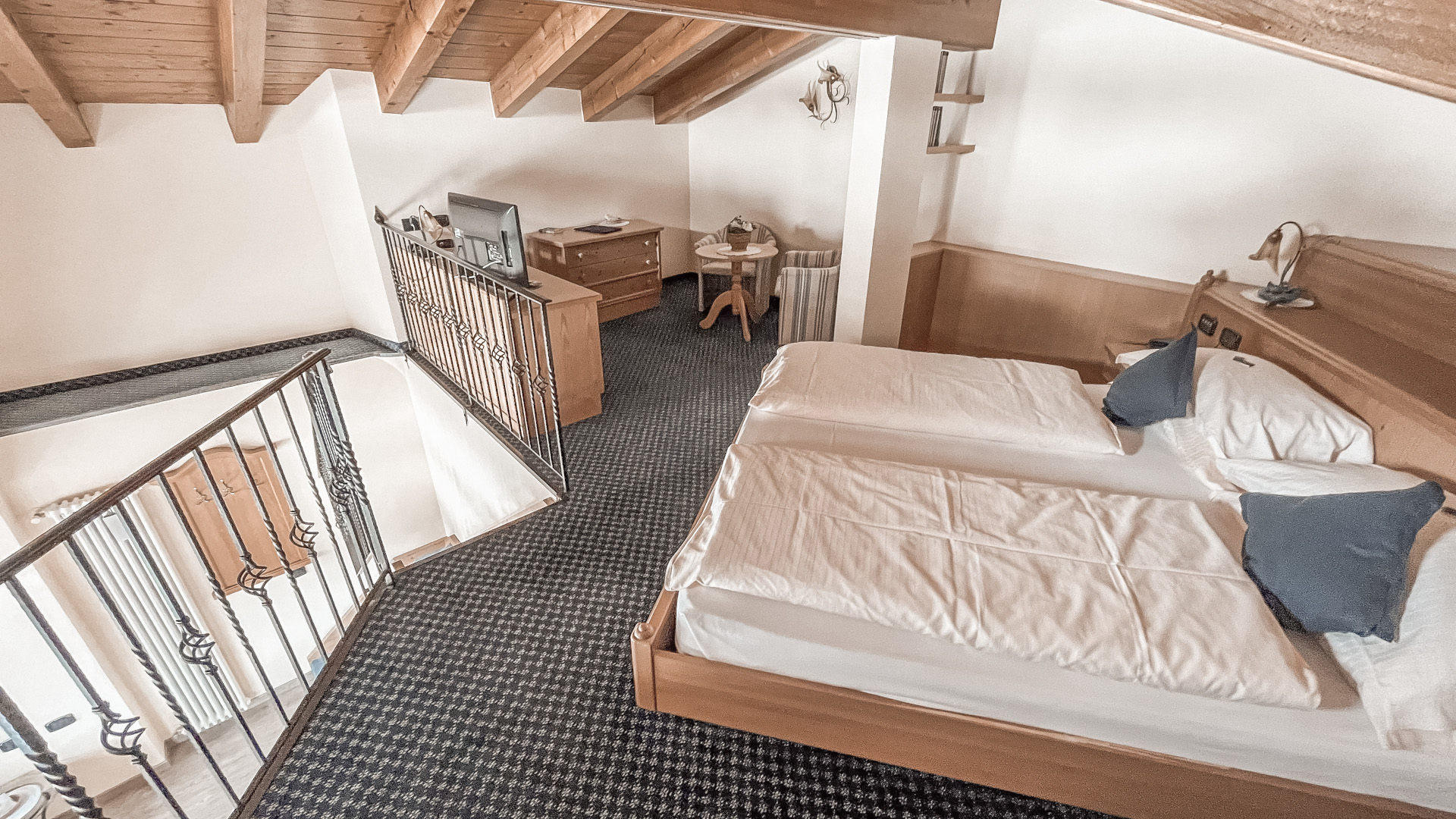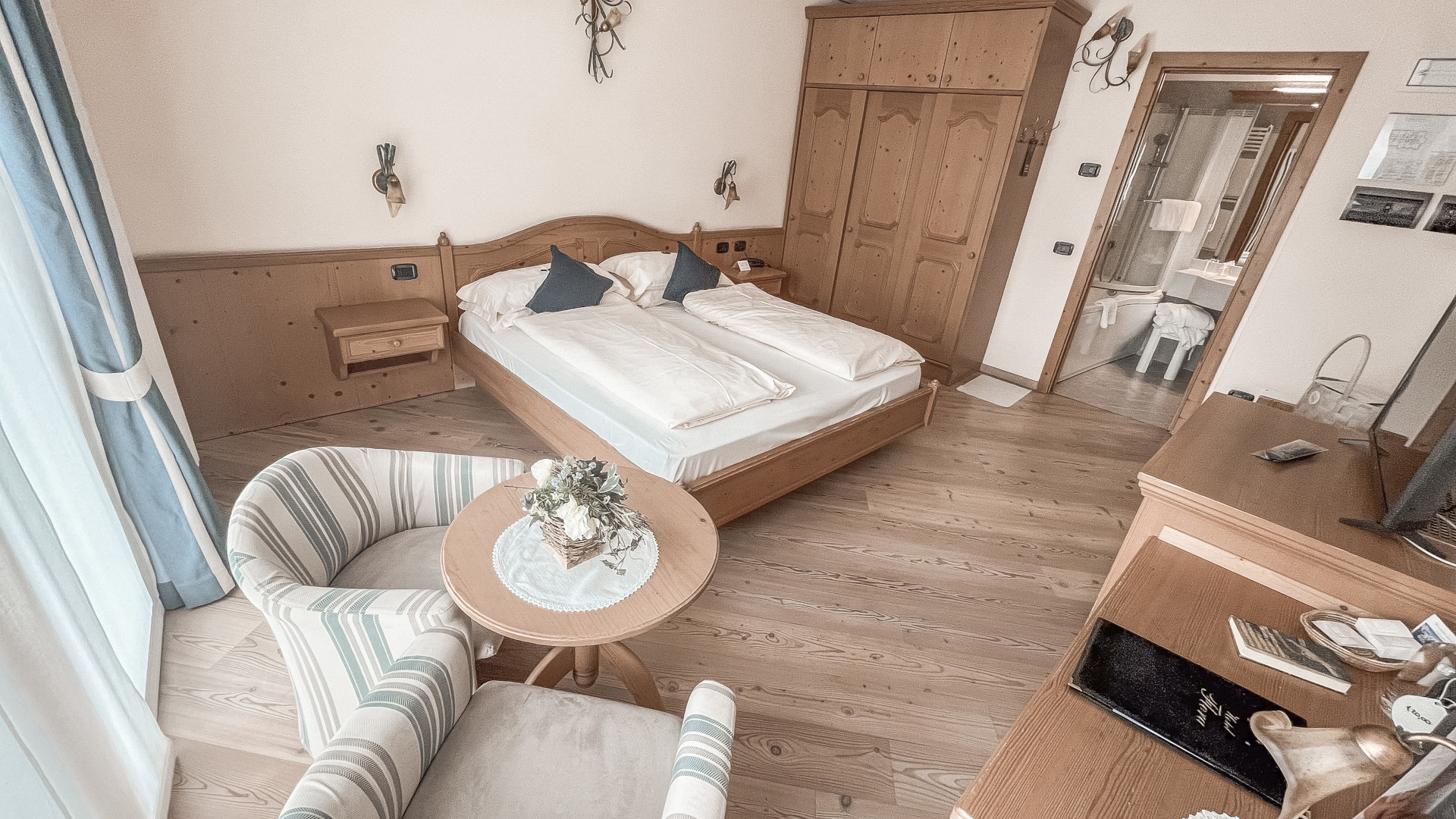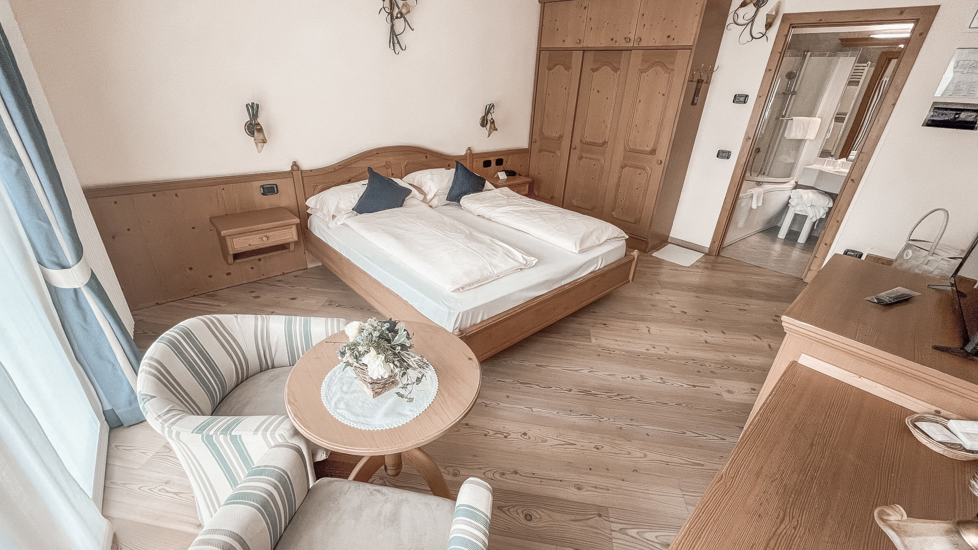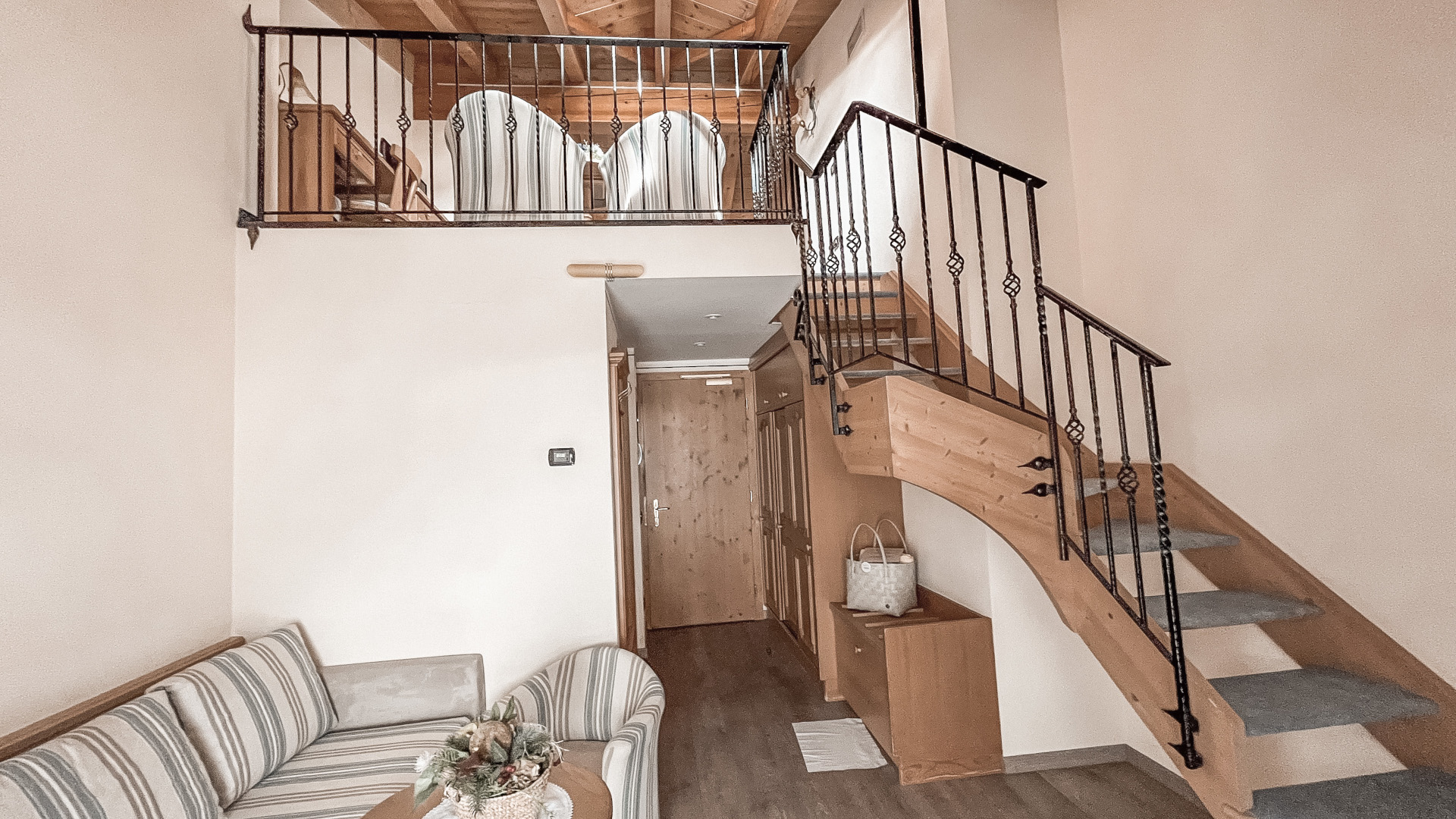 Caratteristica stanza giorno e notte con balcone panoramico esposto a sud. Goditi il lusso di una Junior Suite su due livelli (35mq) arredata con cura in stile montano. A renderla unica le travi a vista e un curato arredamento classico. Ideale per chi desidera spazi ampi e la possibilità di ammirare la bellezza della montagna godendo di uno spazio intimo e riservato.