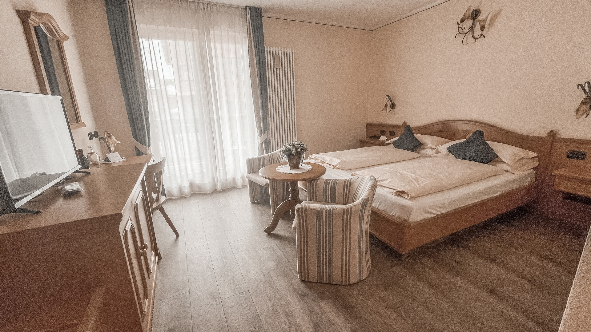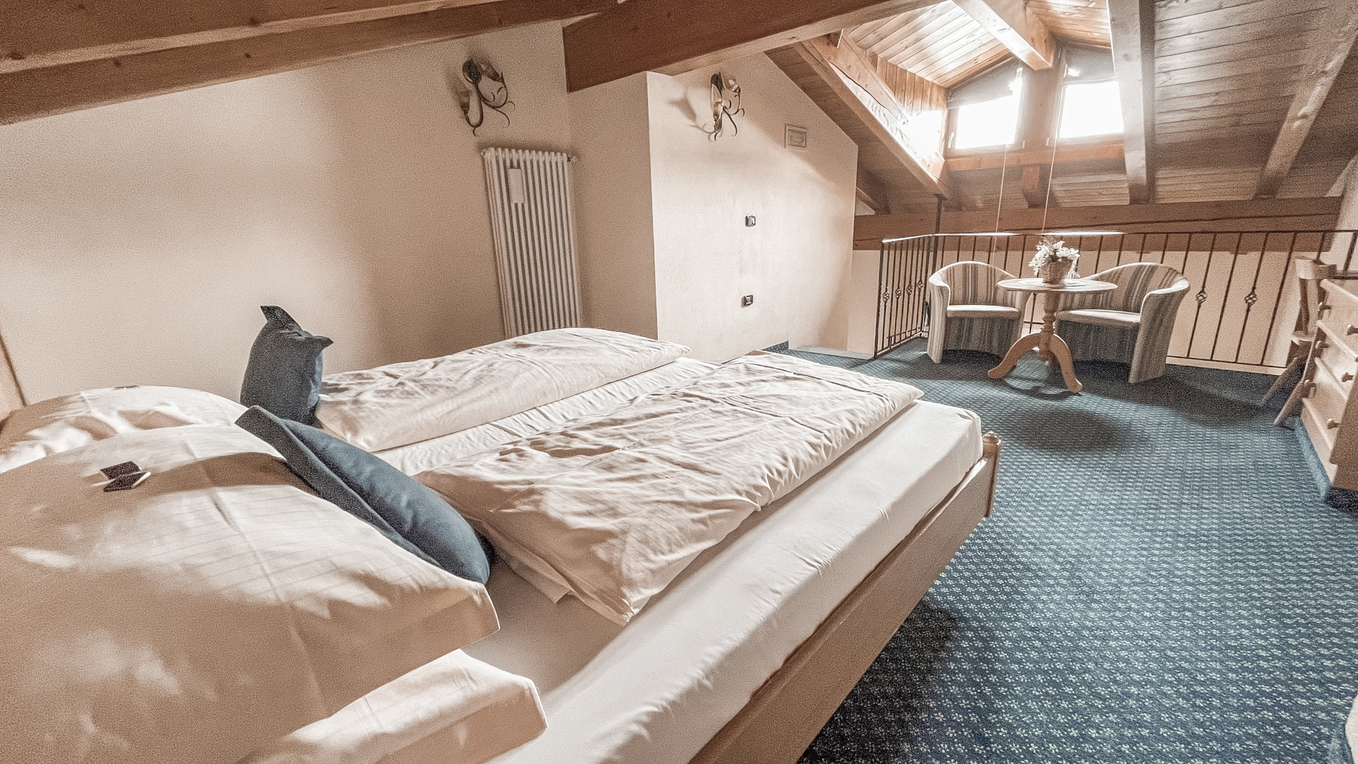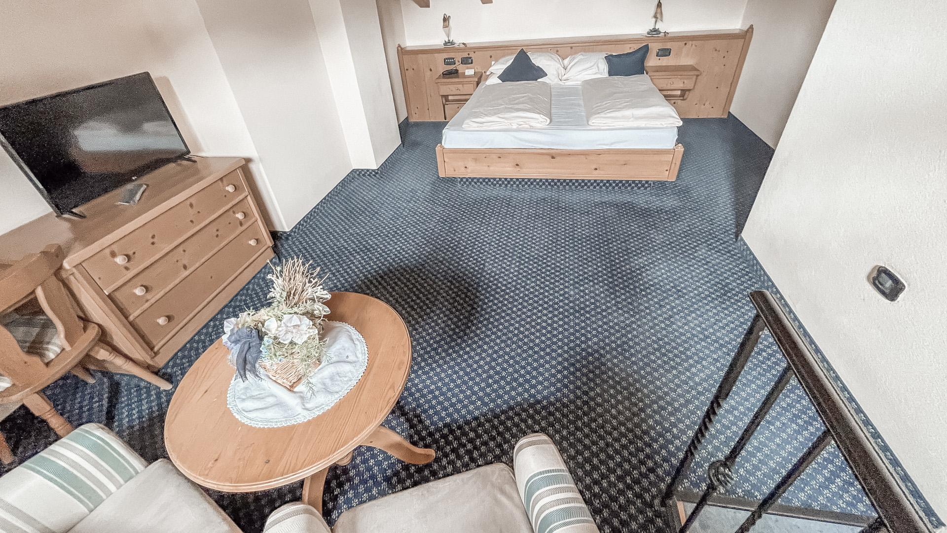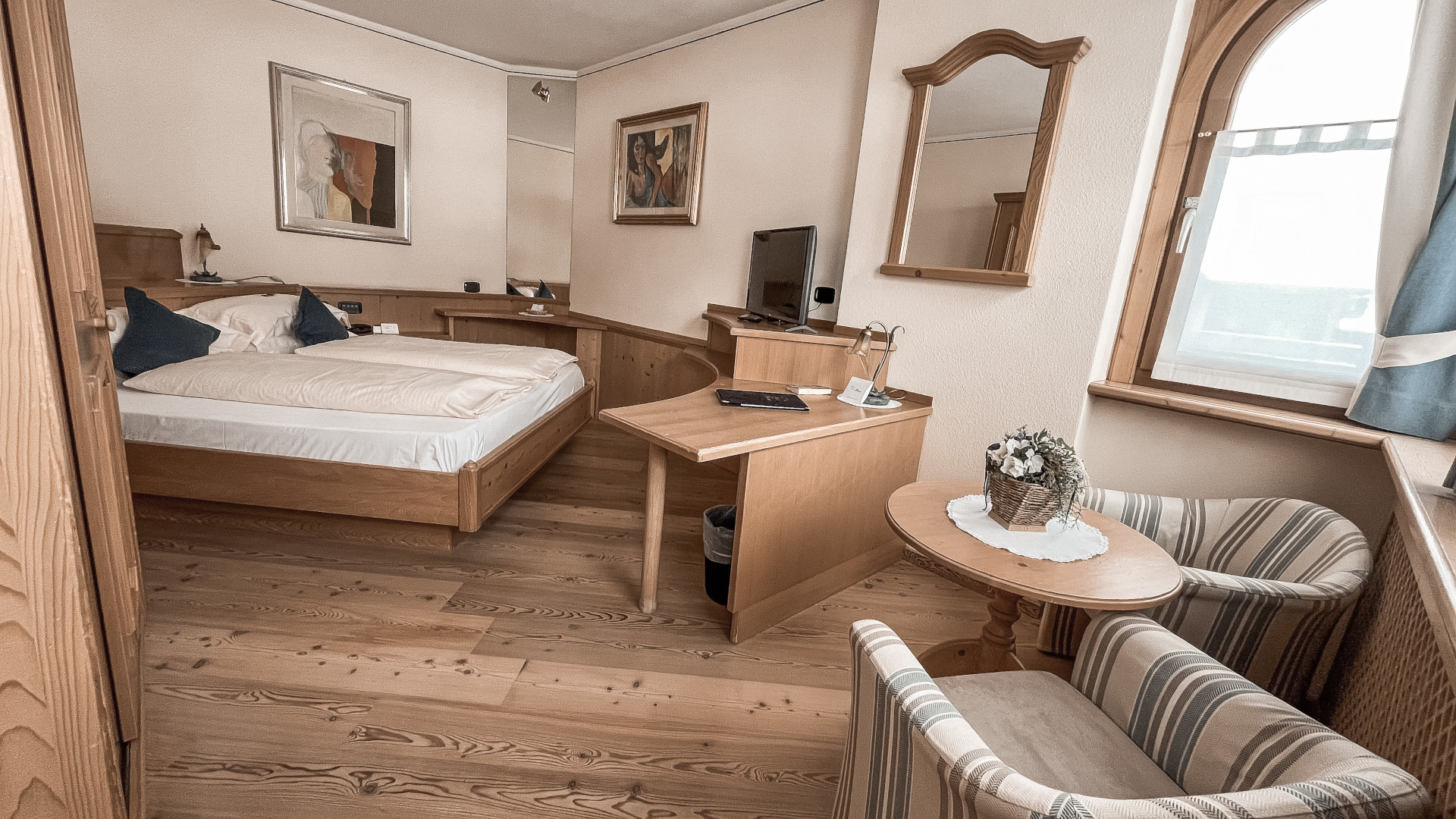 Caratteristica stanza giorno e notte con balcone panoramico esposto a sud. Goditi il lusso di una Junior Suite su due livelli (35mq) arredata con cura in stile montano. A renderla unica le travi a vista e un curato arredamento classico. Ideale per chi desidera spazi ampi e la possibilità di ammirare la bellezza della montagna godendo di uno spazio intimo e riservato.