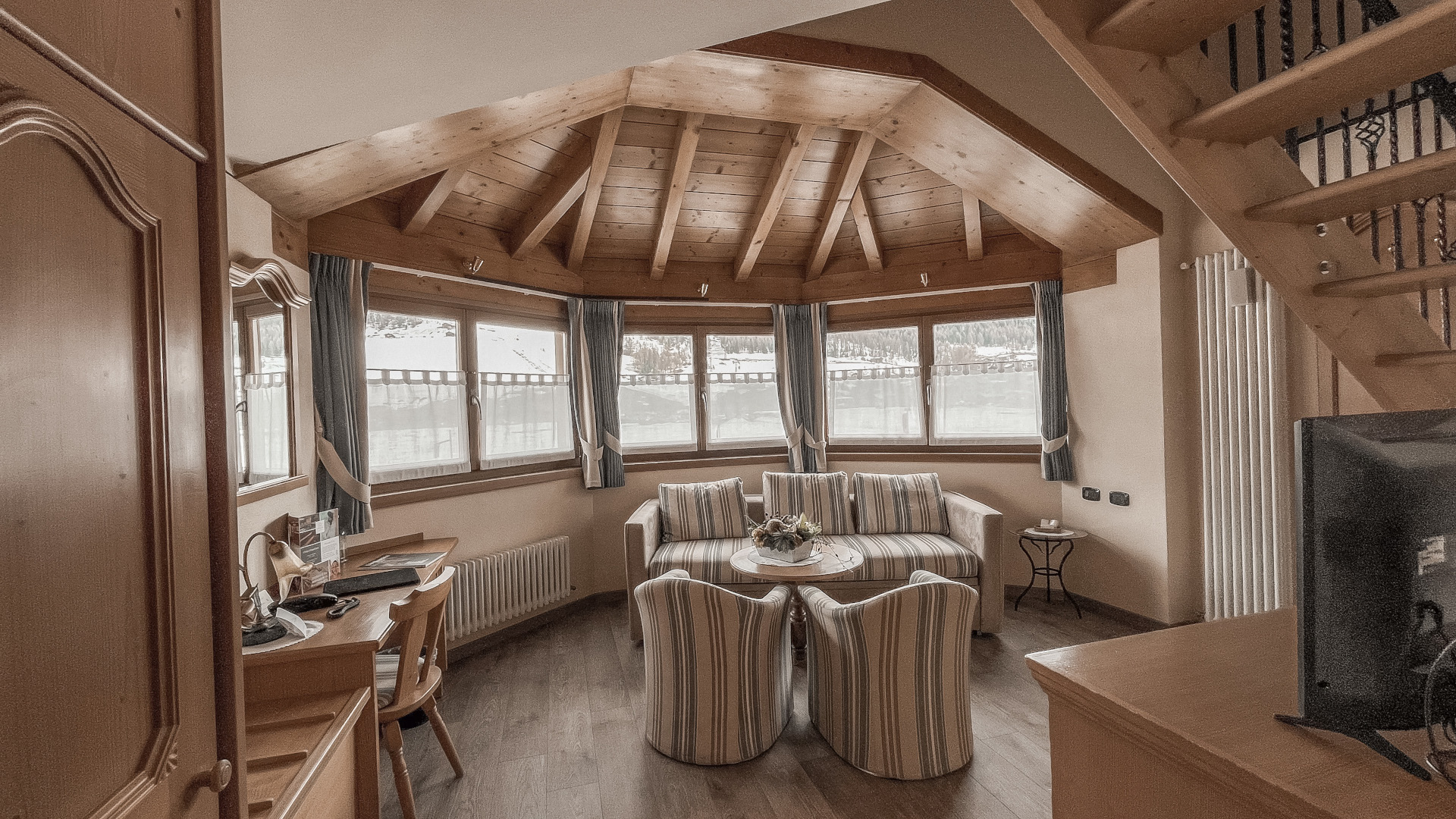 Calda ed accogliente, caratterizzata dalle travi a vista ed un ampia finestrata che circonda il salotto, la nostra Junior Suite è perfetta per chi ama il caratteristico stile montano e la comodità. A renderla unica è la sua disposizione “giorno/notte” su due livelli (35mq). Questa stanza, senza balcone, offre un’atmosfera unica in grado di rendere speciale ogni vacanza.