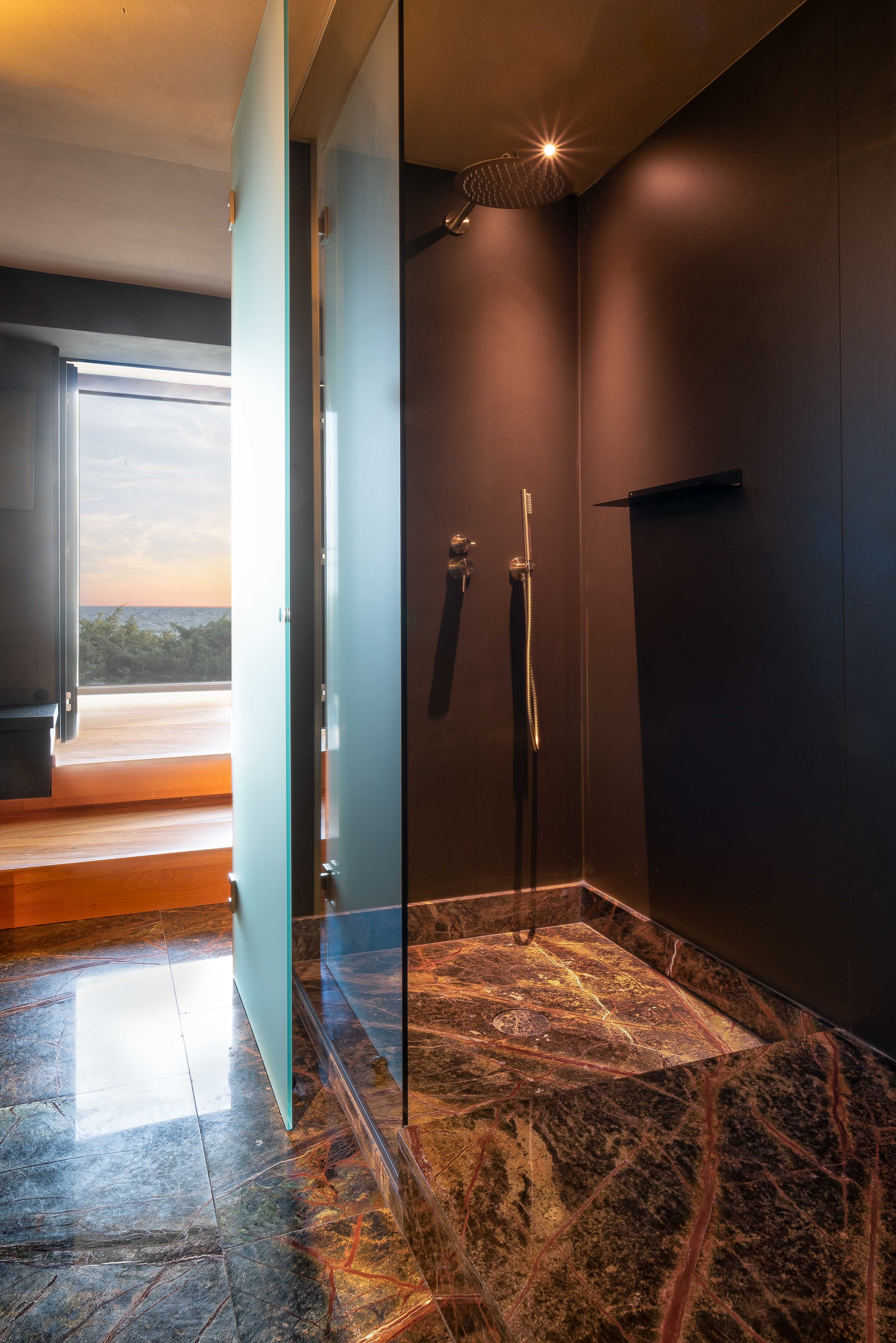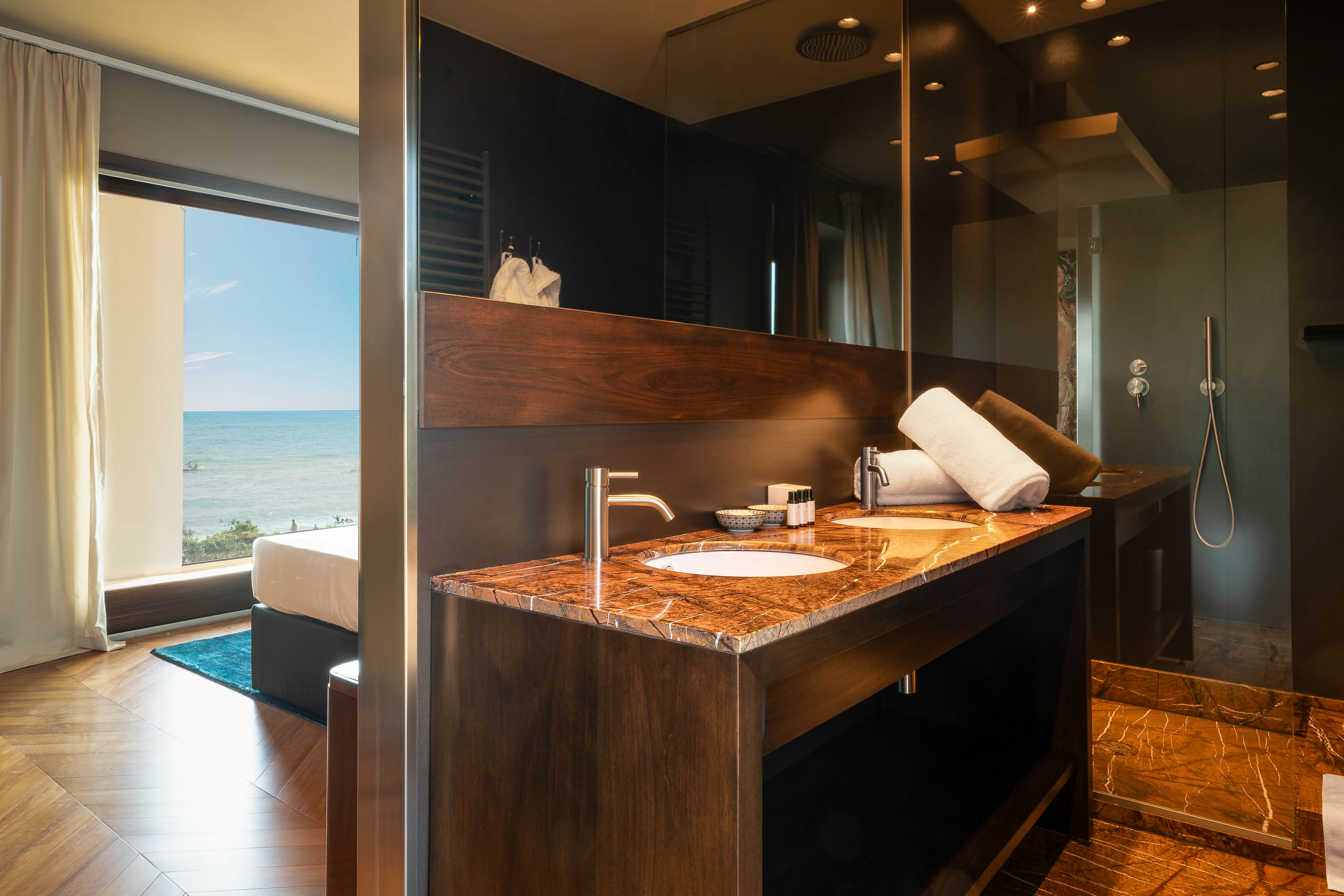 Grazie alle spaziose pareti di vetro, dalla Camera Deluxe Vista Mare si gode una vista spettacolare sul mare e sulle isole. La combinazione armoniosa della mobilia di design con la natura circostante crea un’atmosfera accogliente e rilassante.