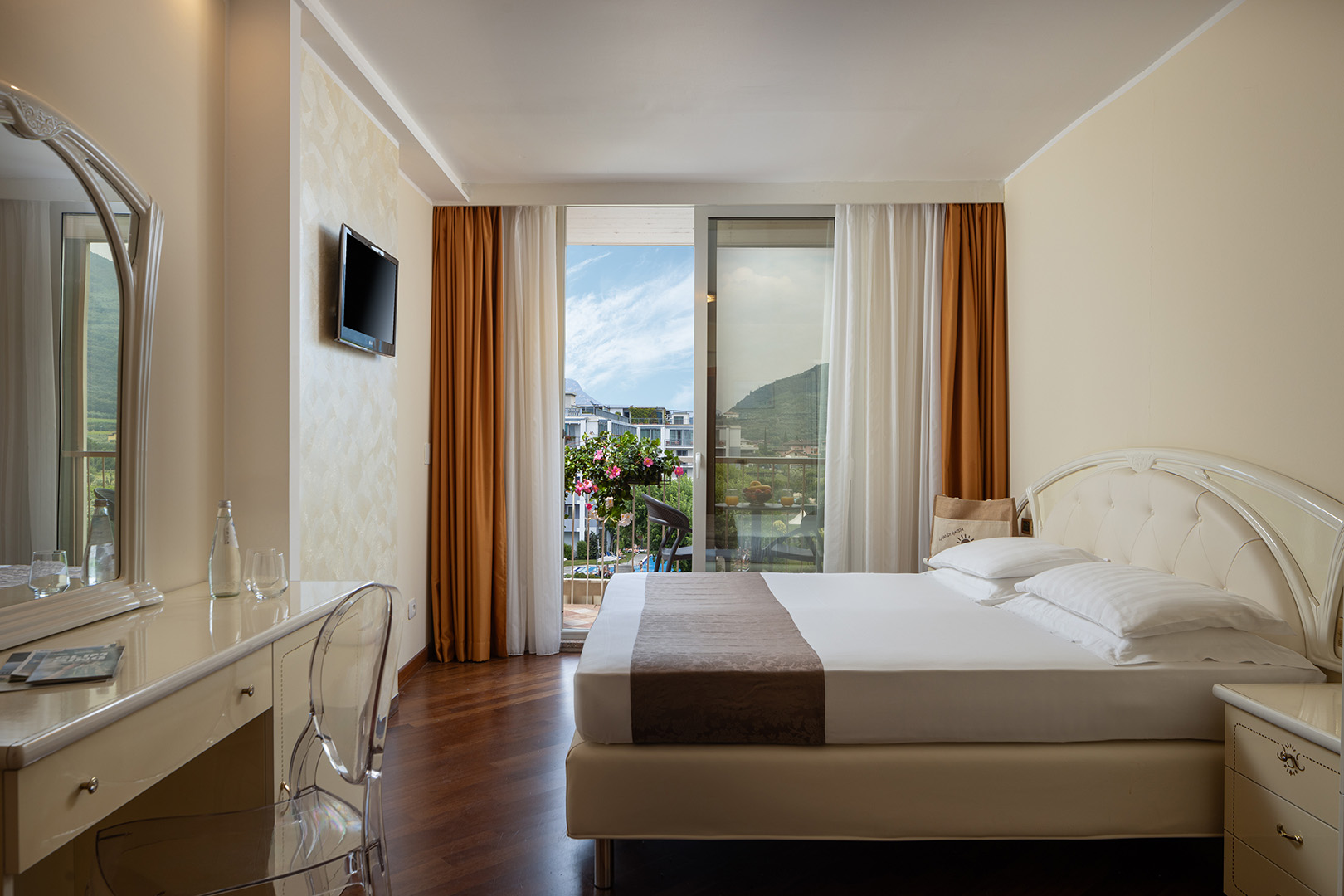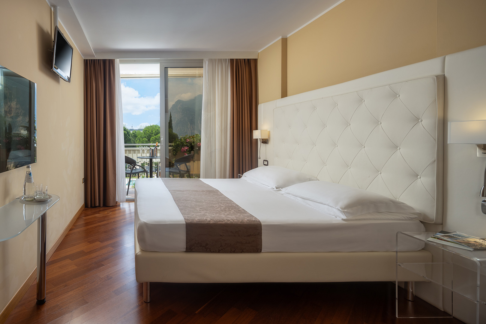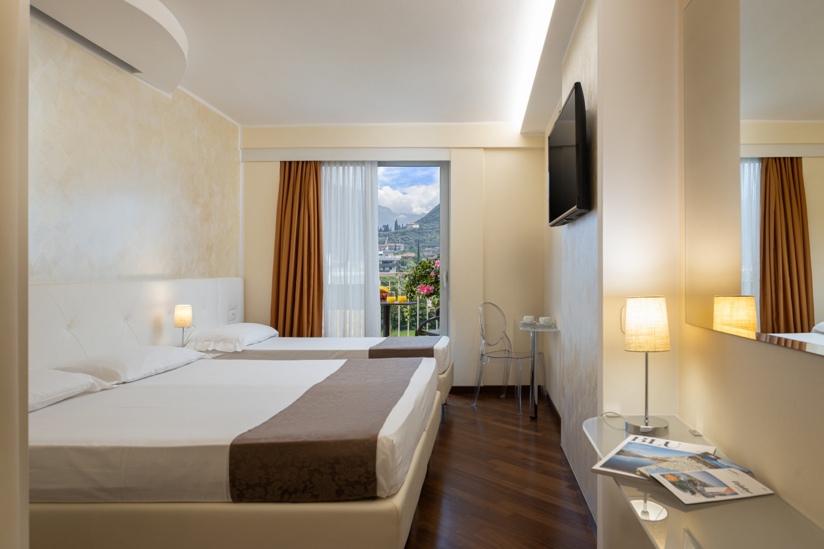 The Deluxe rooms are the hotel's largest rooms. Exclusive amenities, large windows and balcony with view of the northern mountains and olive groves of Monte Brione. The rooms are provided with double bed and single bed, or three single beds.