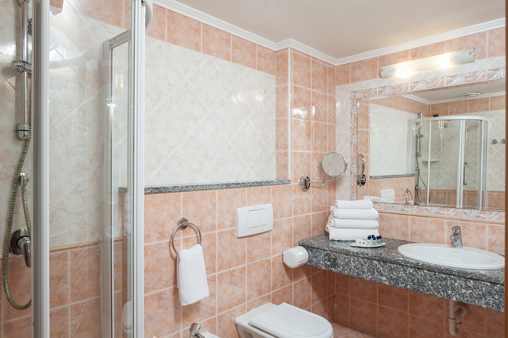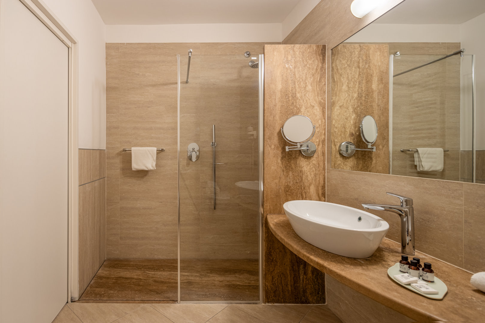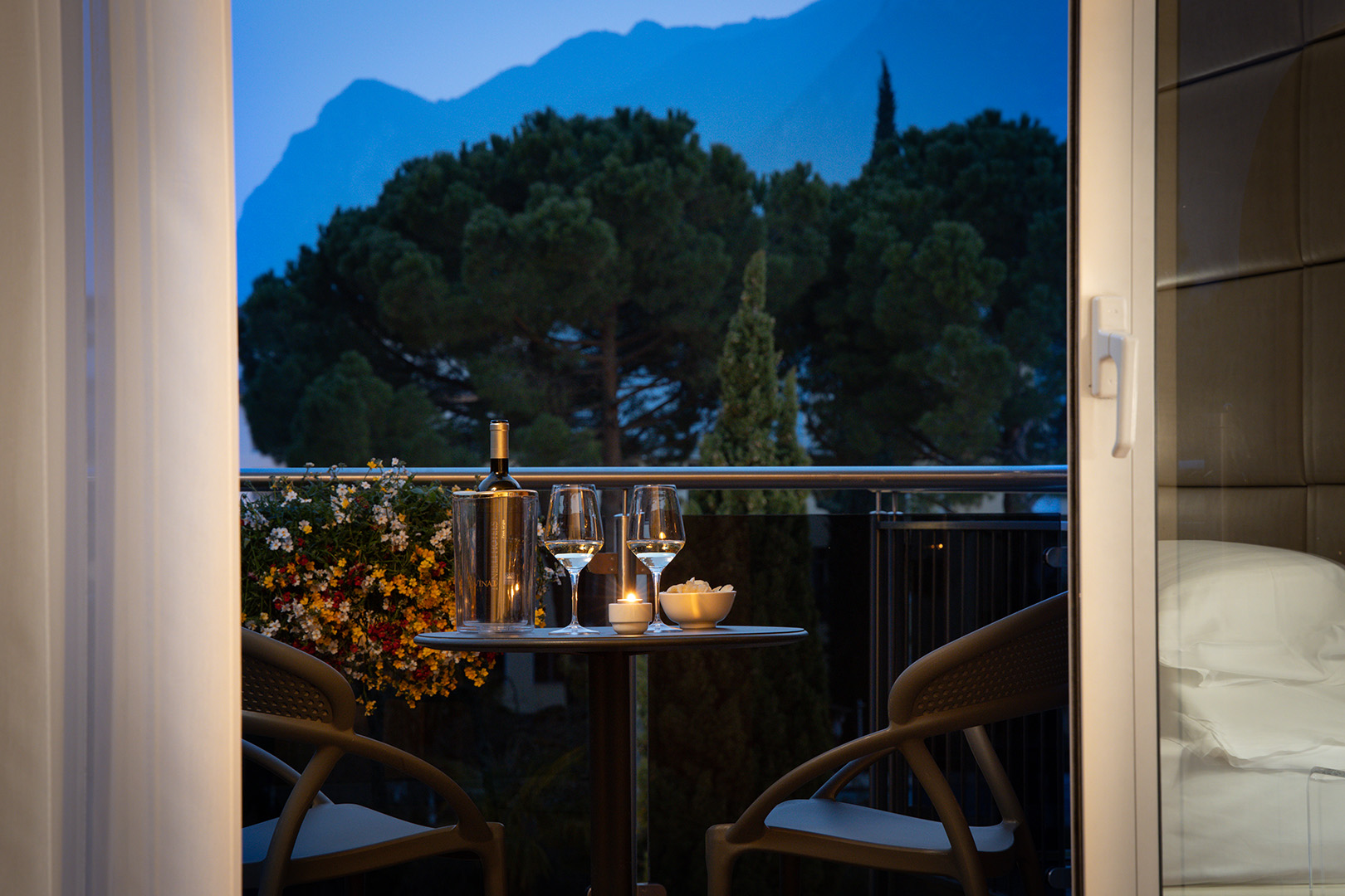 The Deluxe rooms are the hotel's largest rooms. Exclusive amenities, large windows and balcony with view of the northern mountains and olive groves of Monte Brione. The rooms are provided with double bed and single bed, or three single beds.