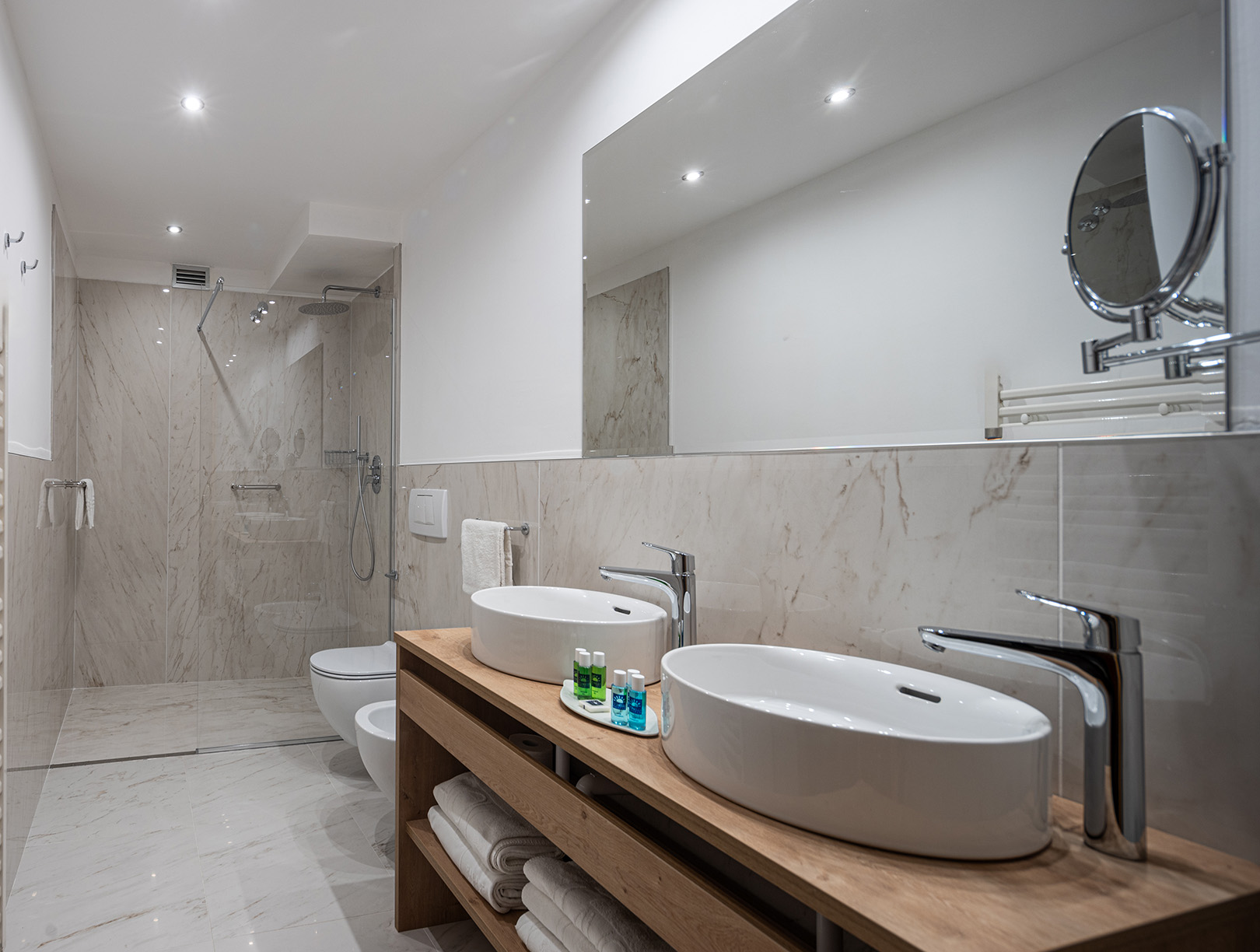 The Deluxe large rooms are the hotel's largest rooms. Exclusive amenities, large windows and balcony with view of the northern mountains and olive groves of Monte Brione. The rooms are provided with a double bed and two single beds, or four single beds.