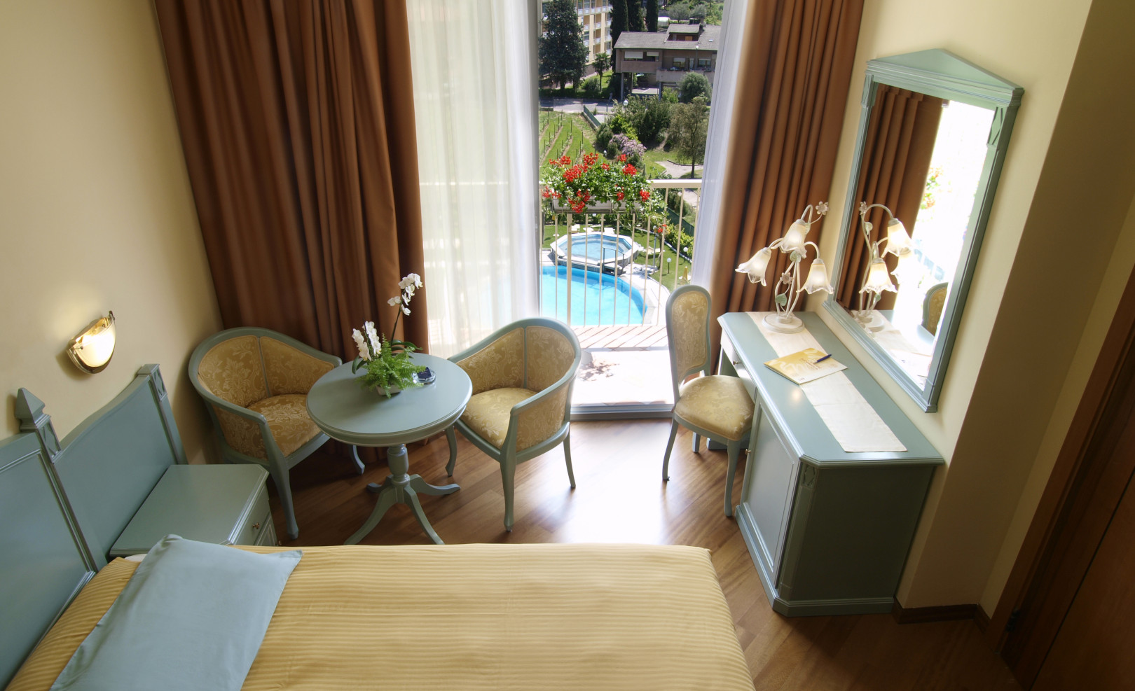 The Deluxe triple with pool view are large and bright rooms dedicated to families. All with air conditioning, WiFi Internet connection, wooden floors, a large balcony and large windows. These rooms are equipped with a double bed or separate beds and a sofa.