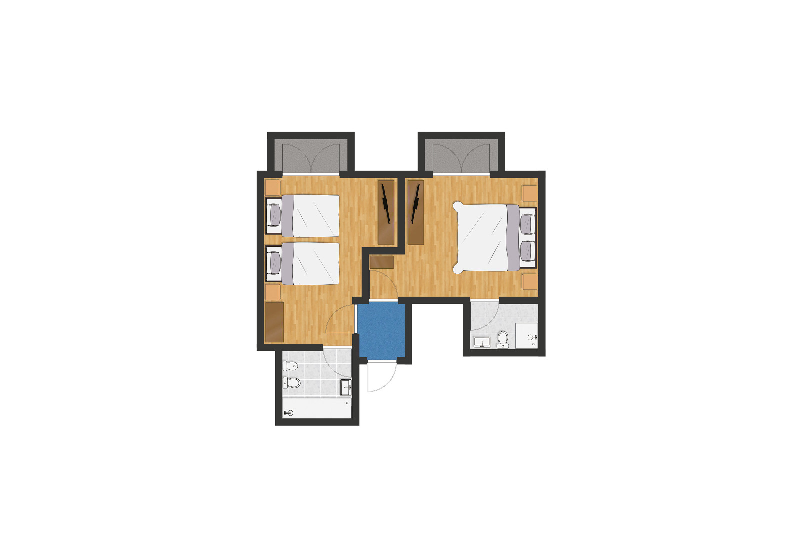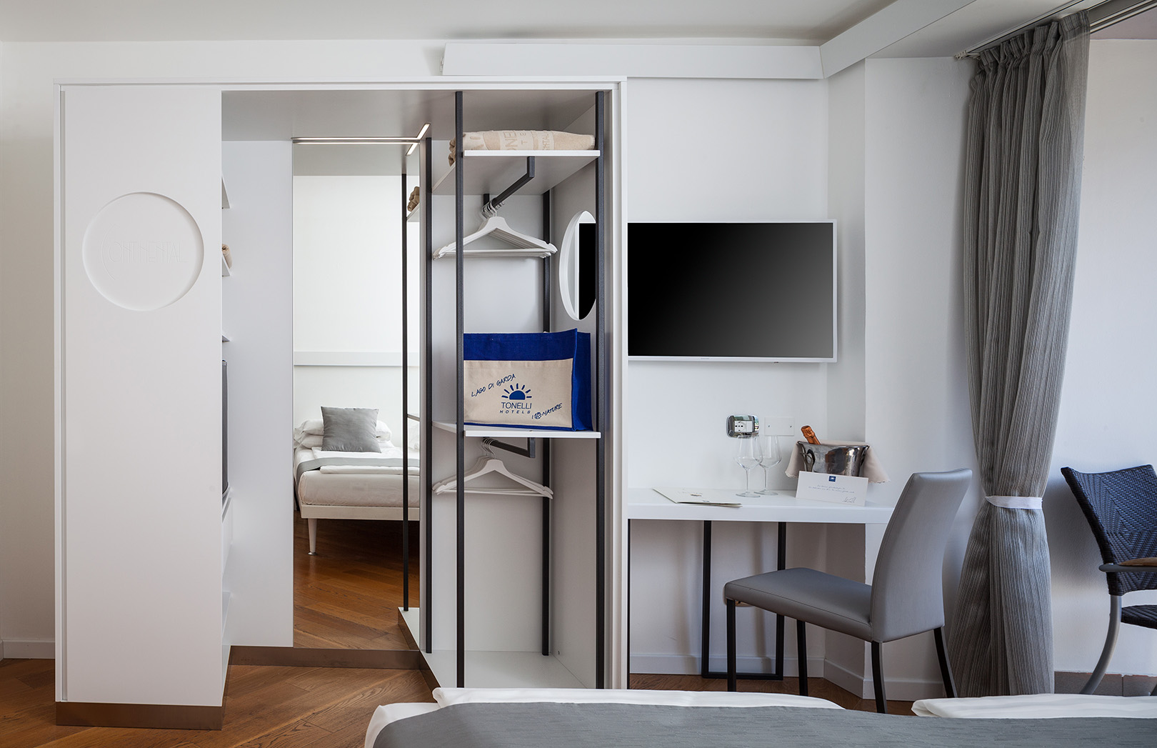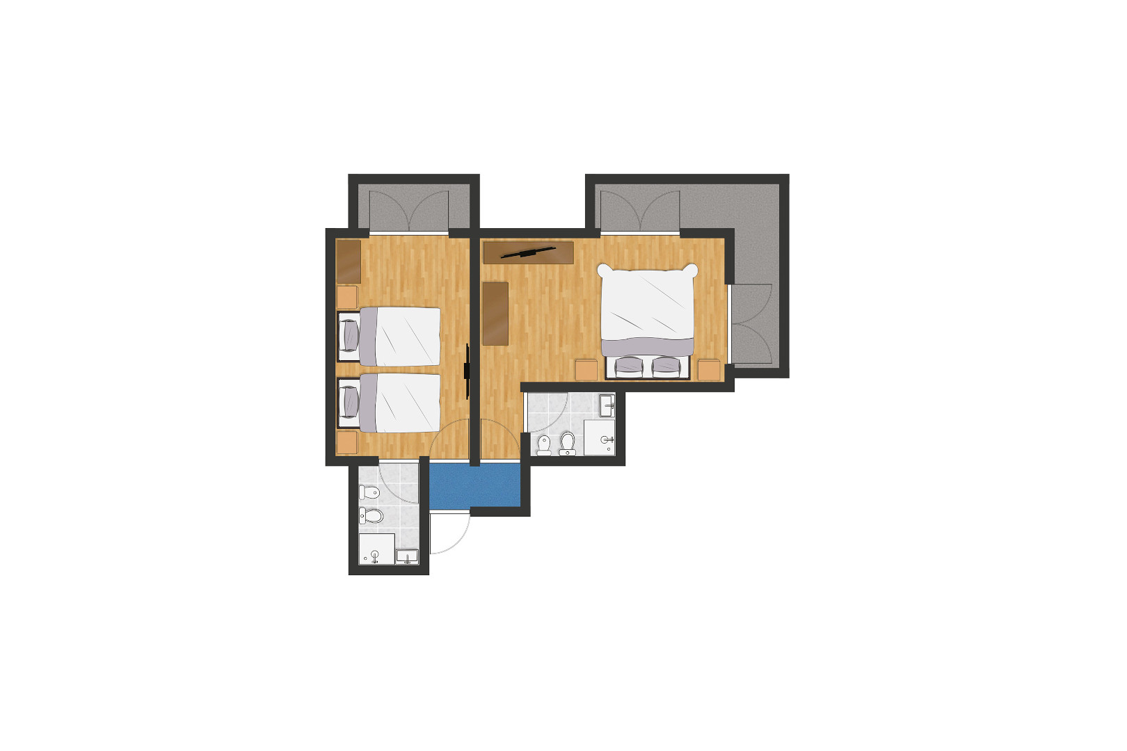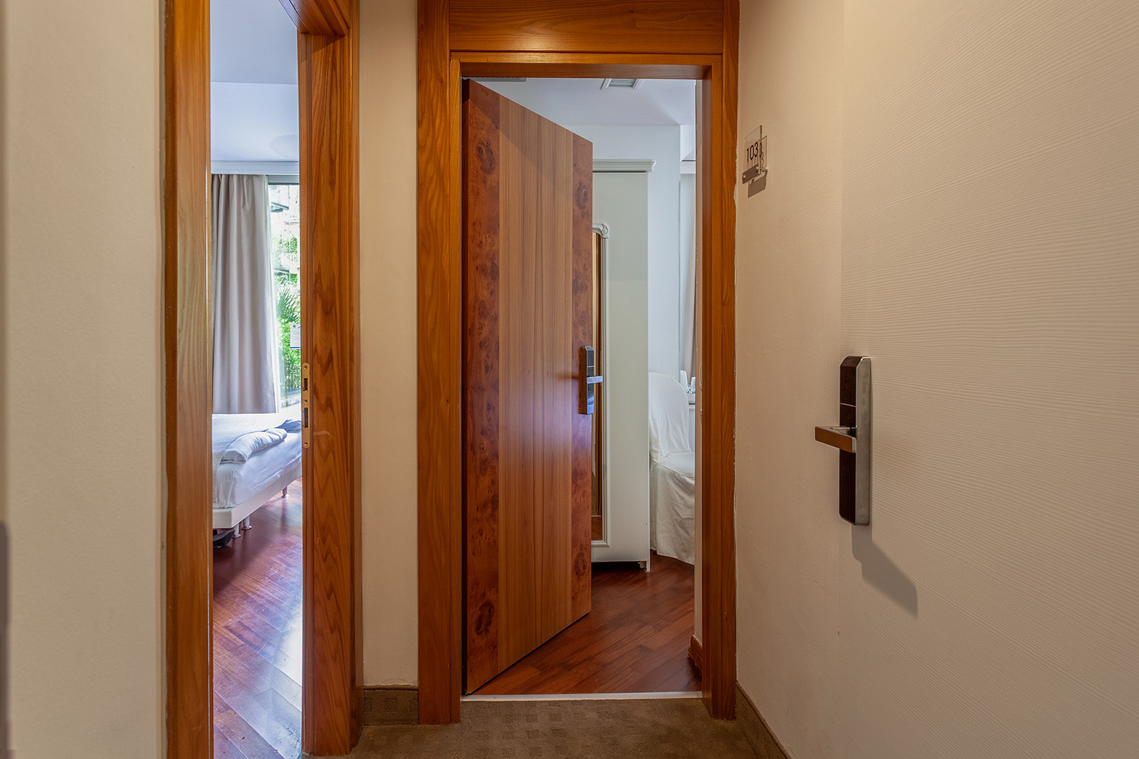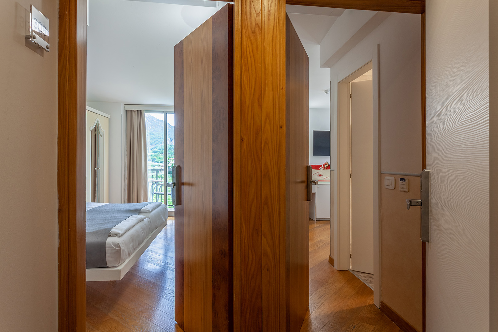 Zwei miteinander verbundene Zimmer, komplett mit zwei Badezimmern, großen Fenstern, zwei großen Balkonen mit Tisch und Stühlen. Jedes ist mit allem Komfort ausgestattet und durch eine Tür und einen gemeinsamen Vorraum getrennt. Privatsphäre und Ruhe für die ganze Familie sind garantiert.