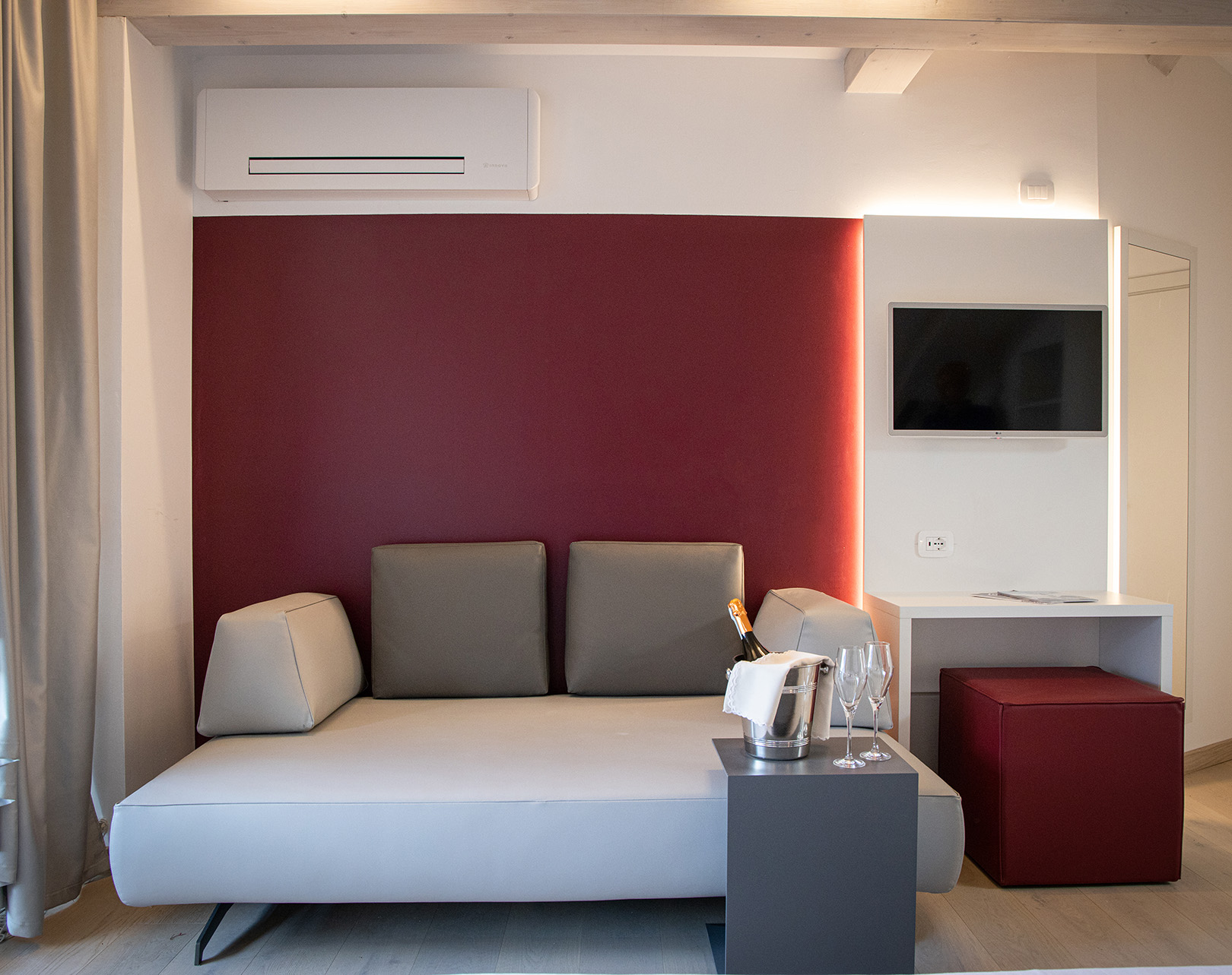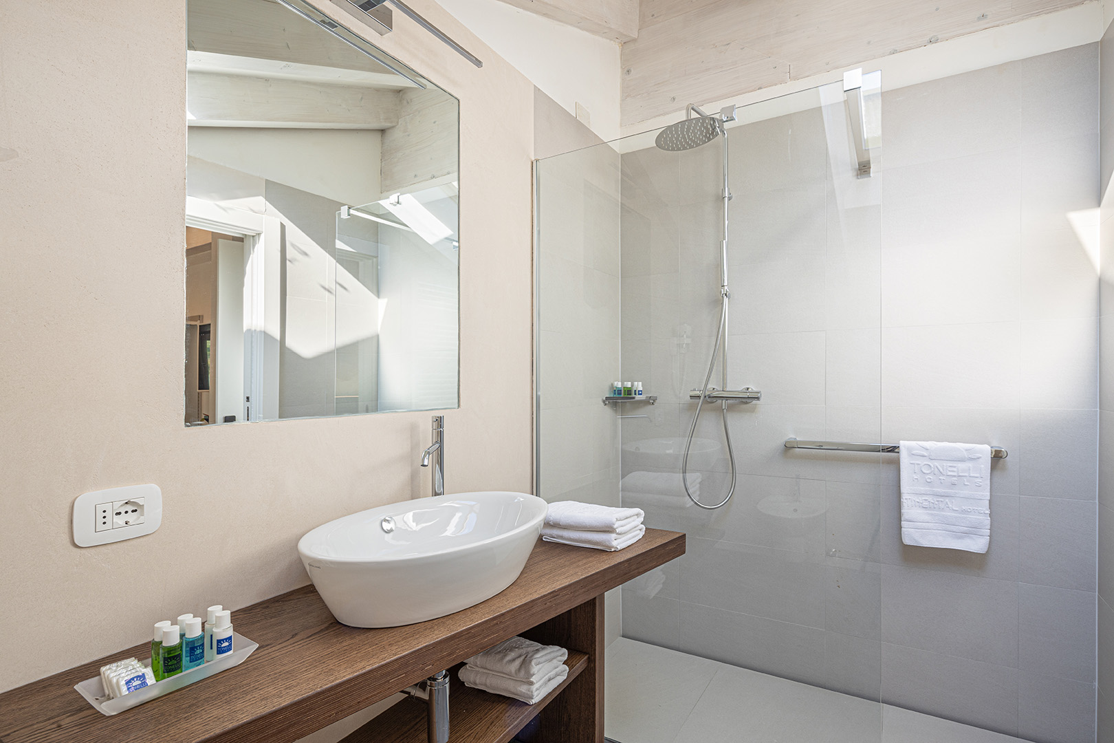Moderne Linien sowie frische und einladende neutrale Töne sind die Merkmale, welche die Deluxe-Zimmer auszeichnen. Ordentliche, moderne und übersichtliche Einrichtung. Badezimmer mit geräumiger ebenerdiger Dusche. Dachzimmer, ausgestattet mit Klimaanlage, W-Lan, Holzböden, Balkon mit Tisch und Stühlen.